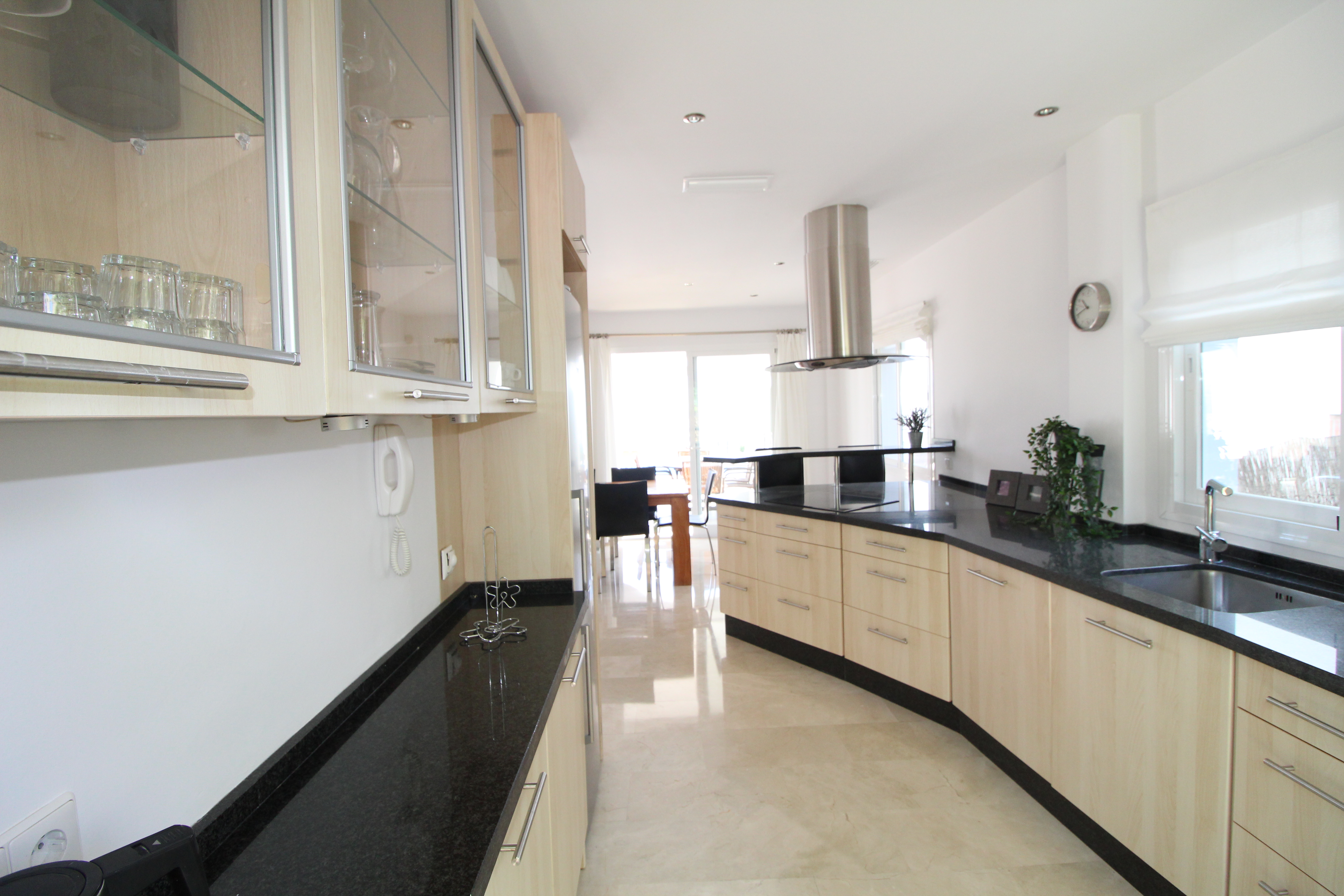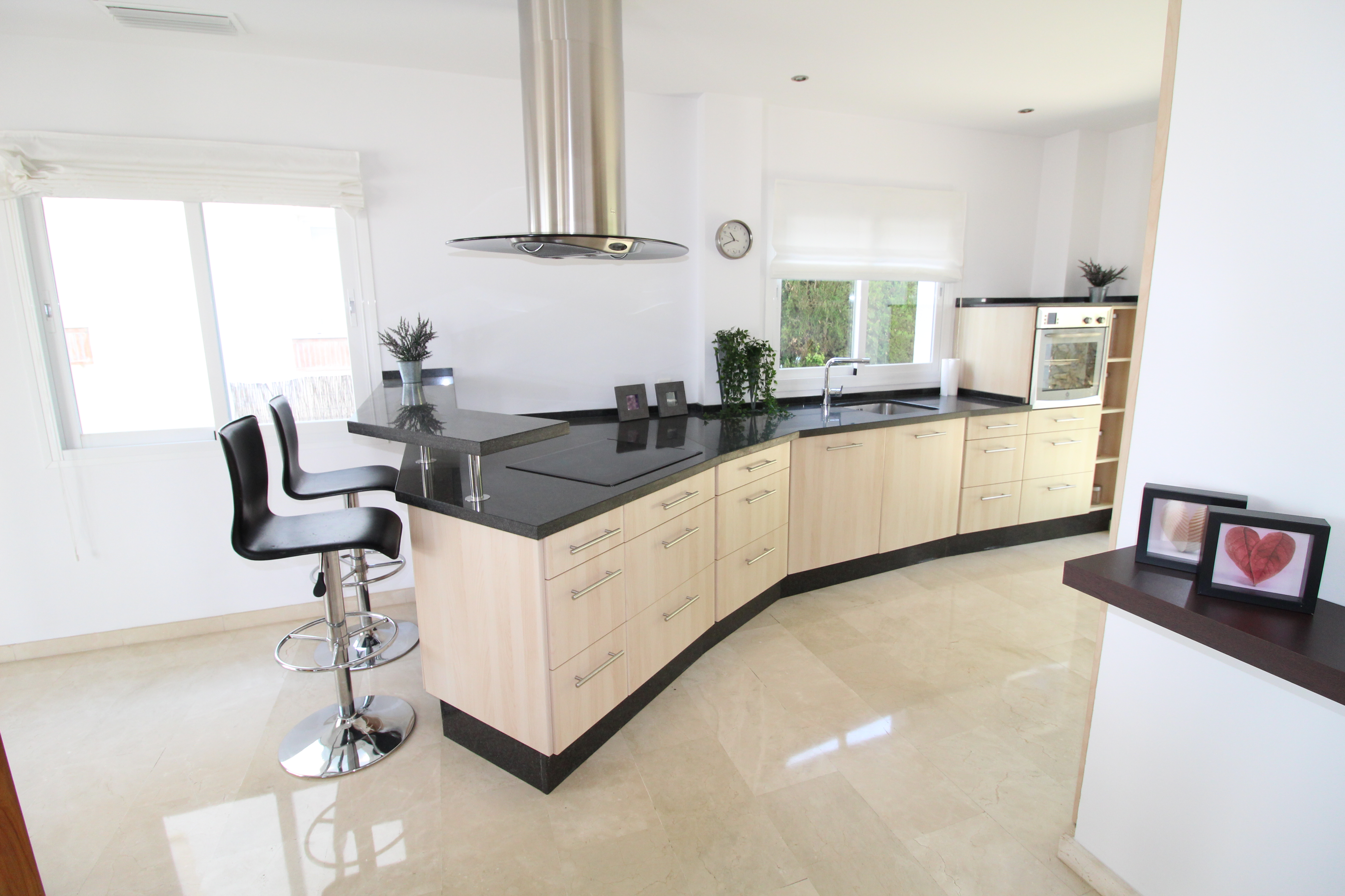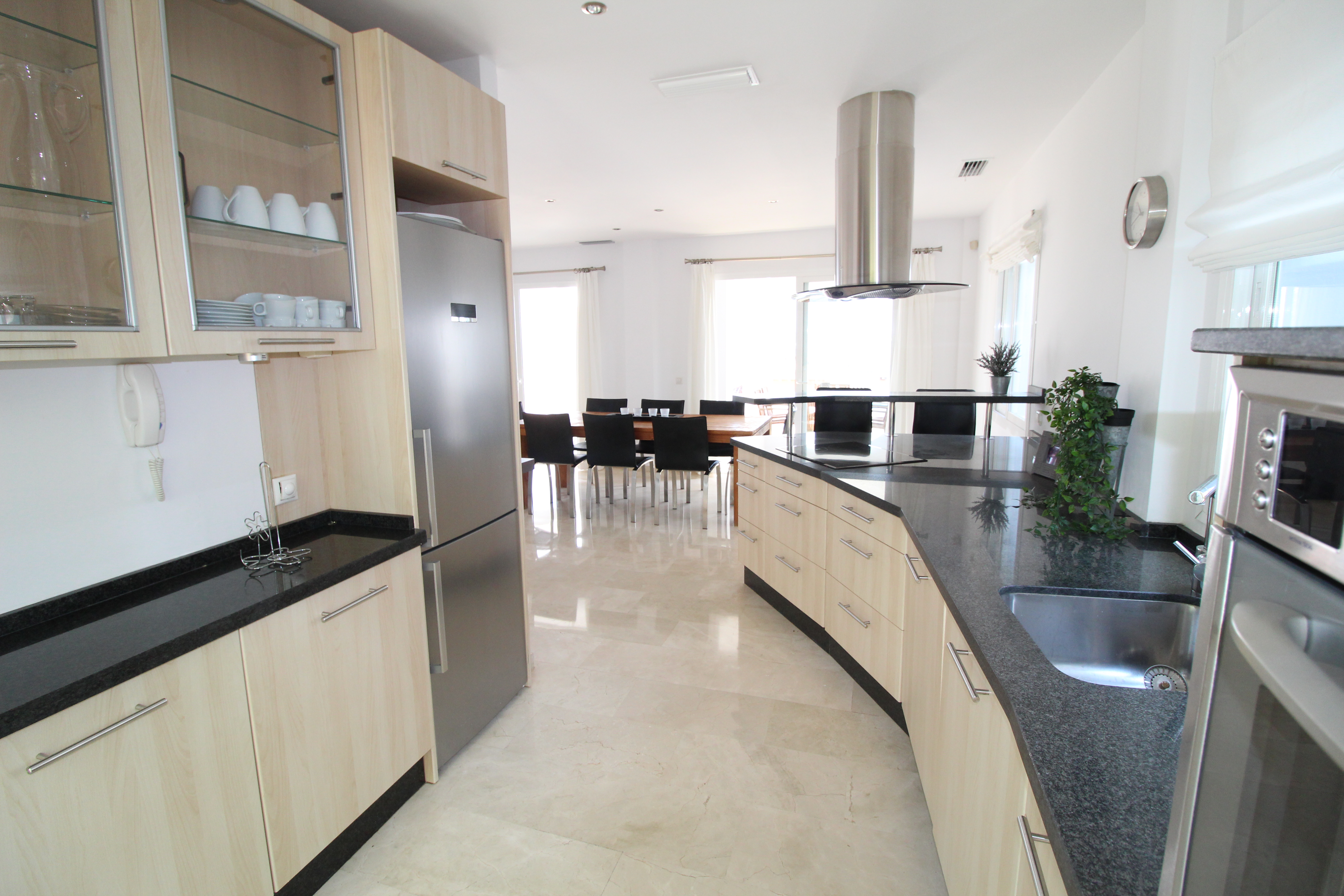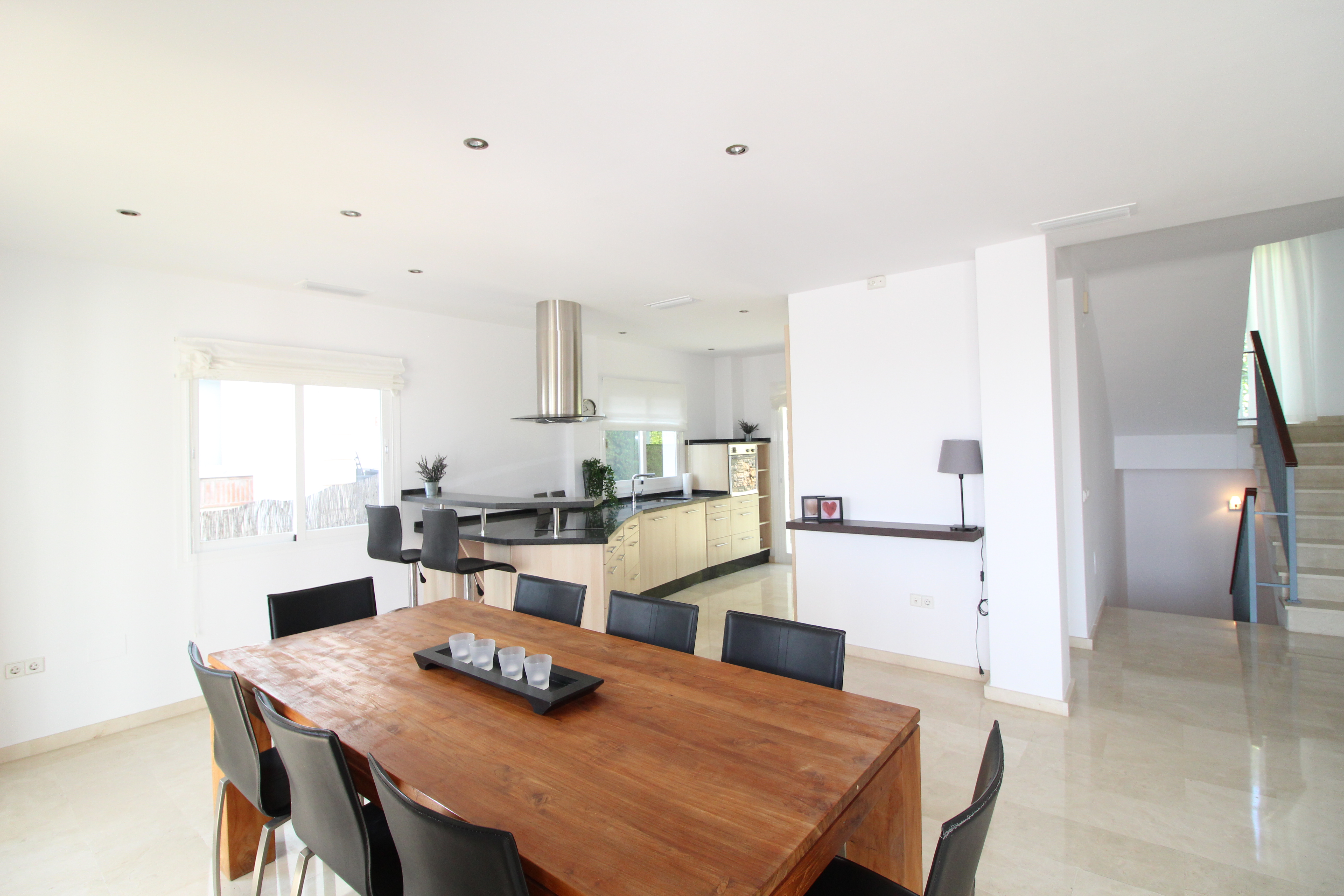 The villa is distributed over 3 floors - ground floor you have a scandinavian style open plan kitchen and livingroom with a guest toilet. From the kitchen and livingroom you have 4 accesses to the terrace, where you find the infinity pool looking over the mountains.
