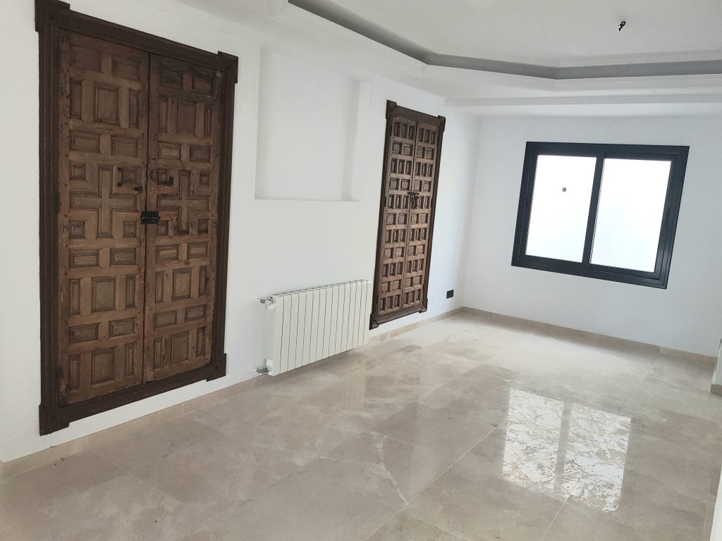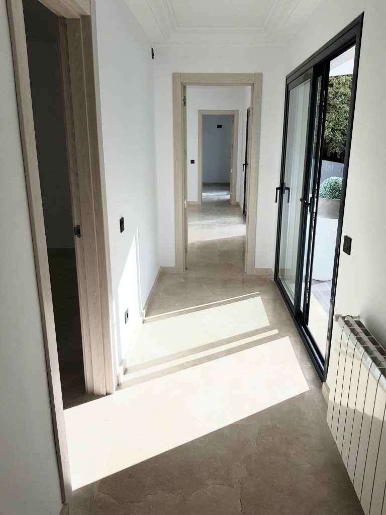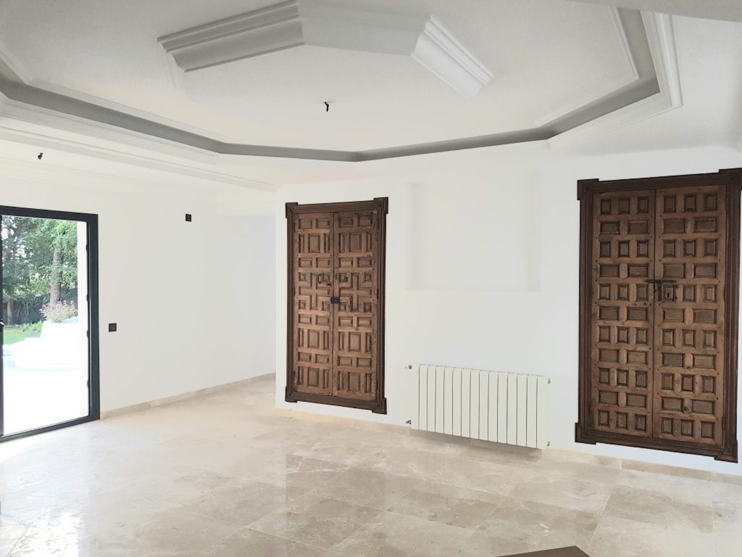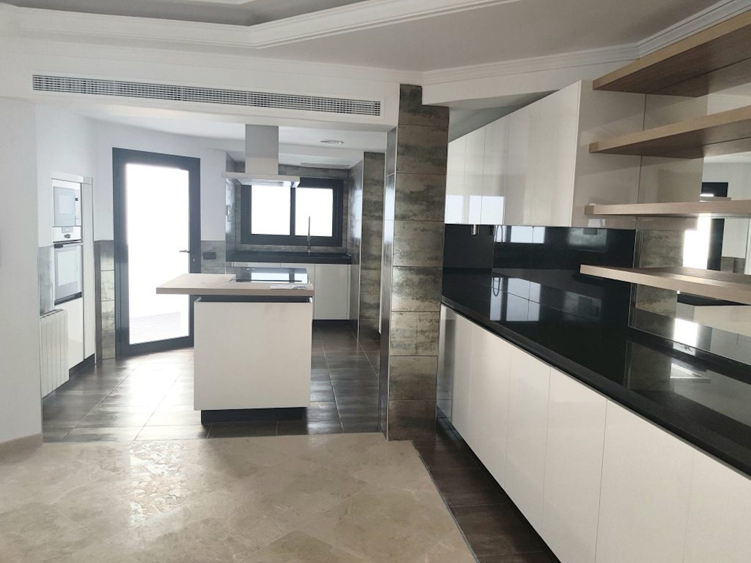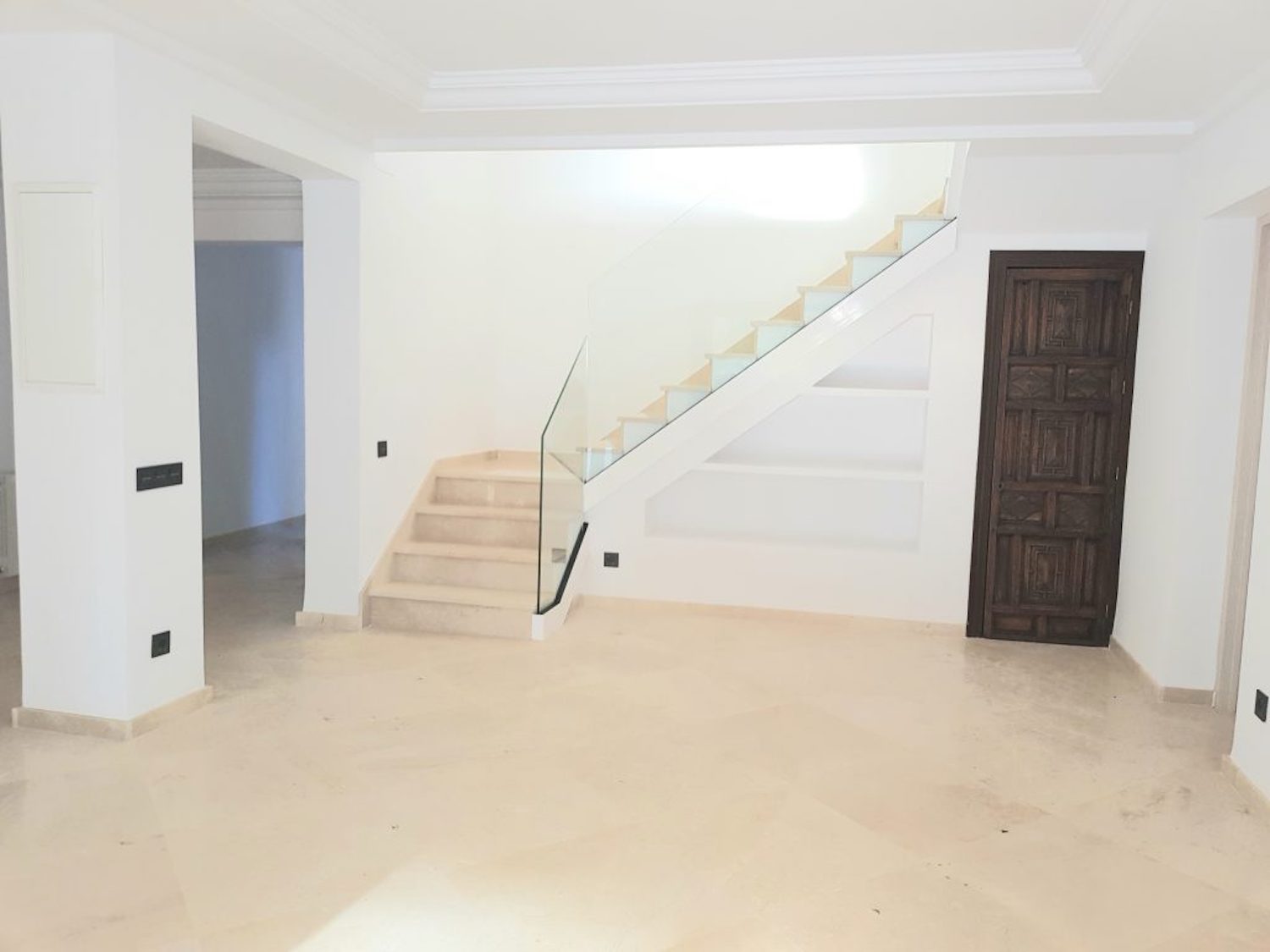 The entrance offers a spacious hallway, which leads in to the separate but open plan kitchen with a dining area. The living room is spacious and has a fireplace. On this floor there is one double bedroom en suite and the master bedroom en suite, with a walk in closet. All rooms have direct access to the terraces and pool area offering beautiful views towards the golf course and La Concha mountain. At the first floor there two bedrooms en suite, with an office room in between.
