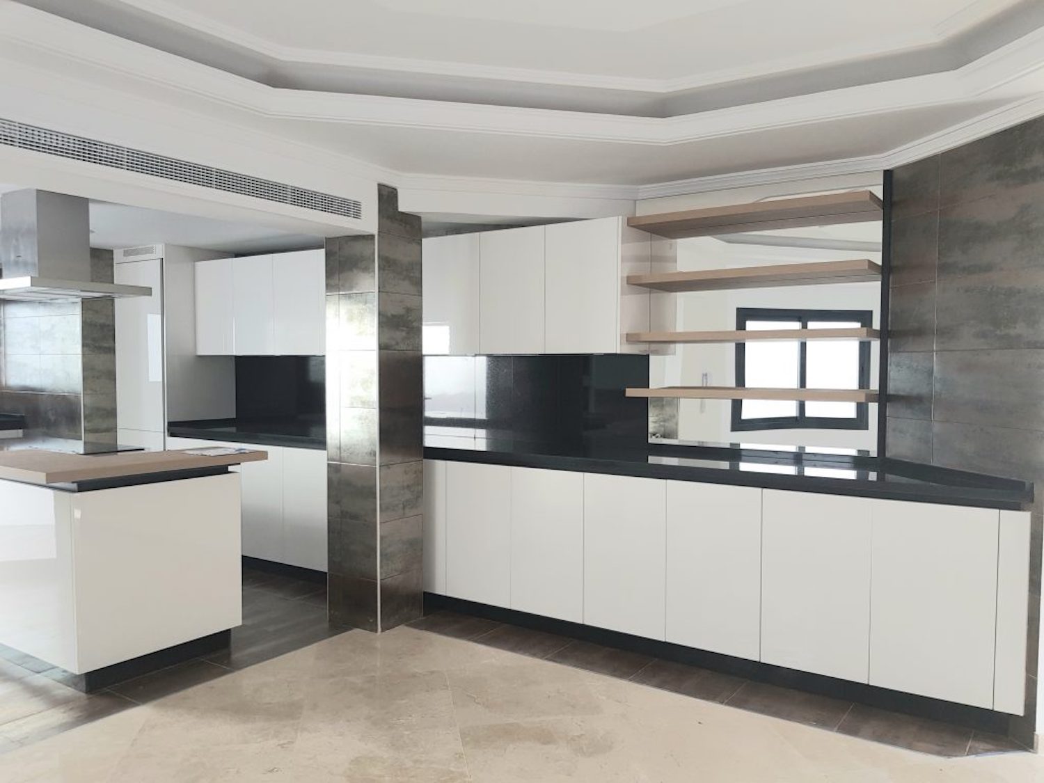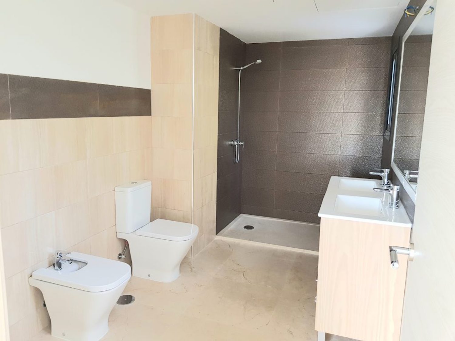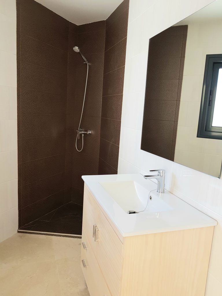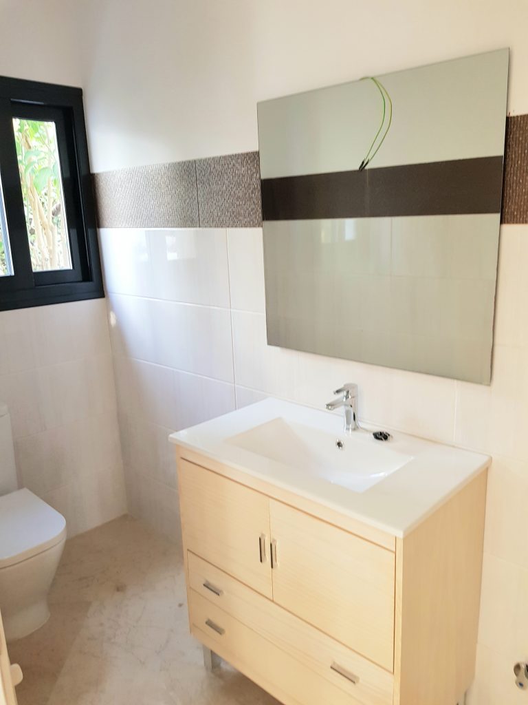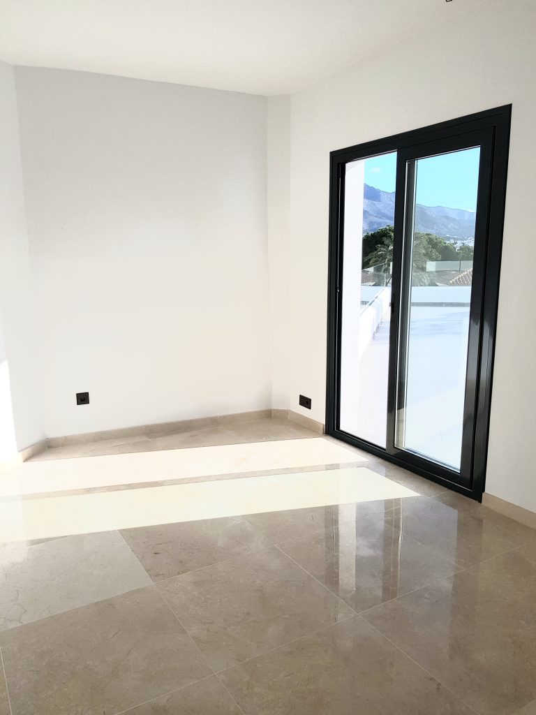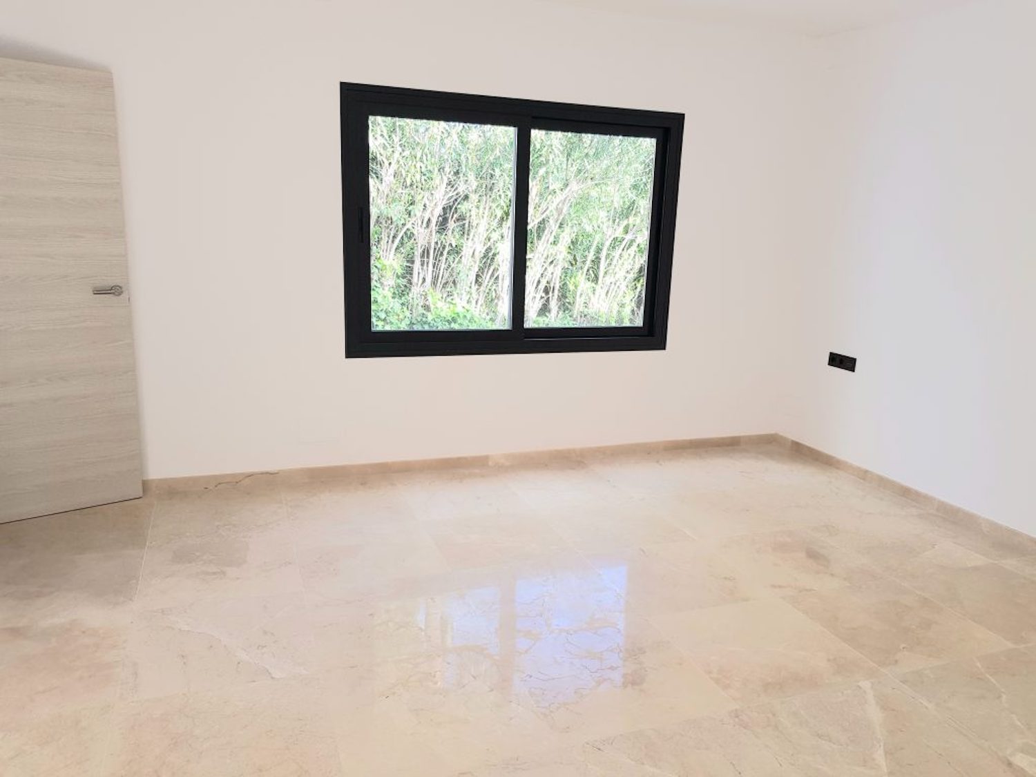 The entrance offers a spacious hallway, which leads in to the separate but open plan kitchen with a dining area. The living room is spacious and has a fireplace. On this floor there is one double bedroom en suite and the master bedroom en suite, with a walk in closet. All rooms have direct access to the terraces and pool area offering beautiful views towards the golf course and La Concha mountain. At the first floor there two bedrooms en suite, with an office room in between.