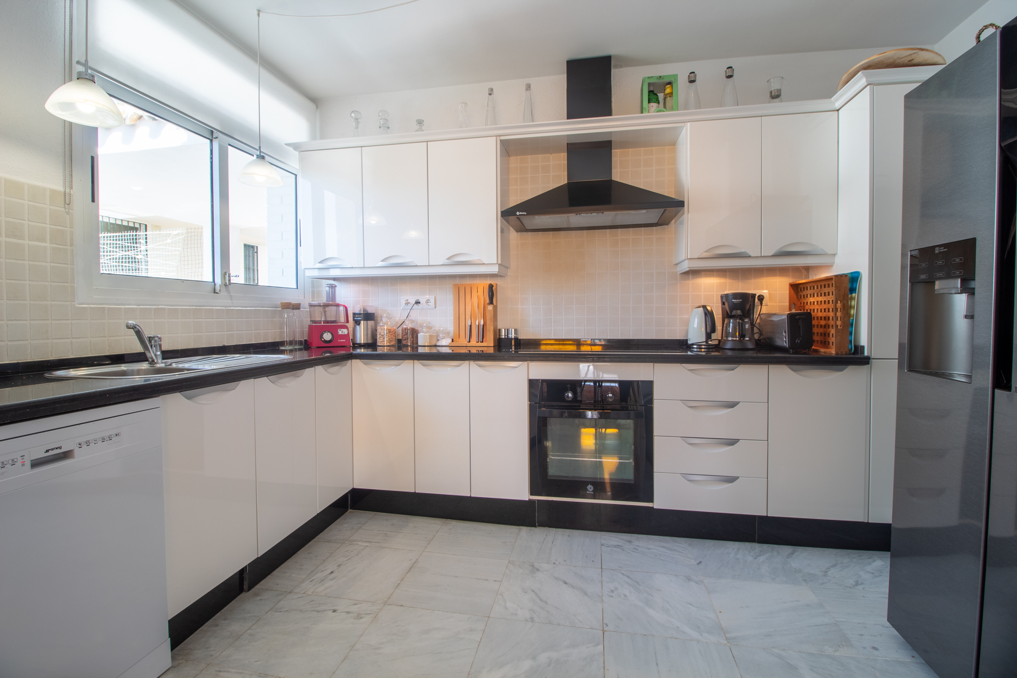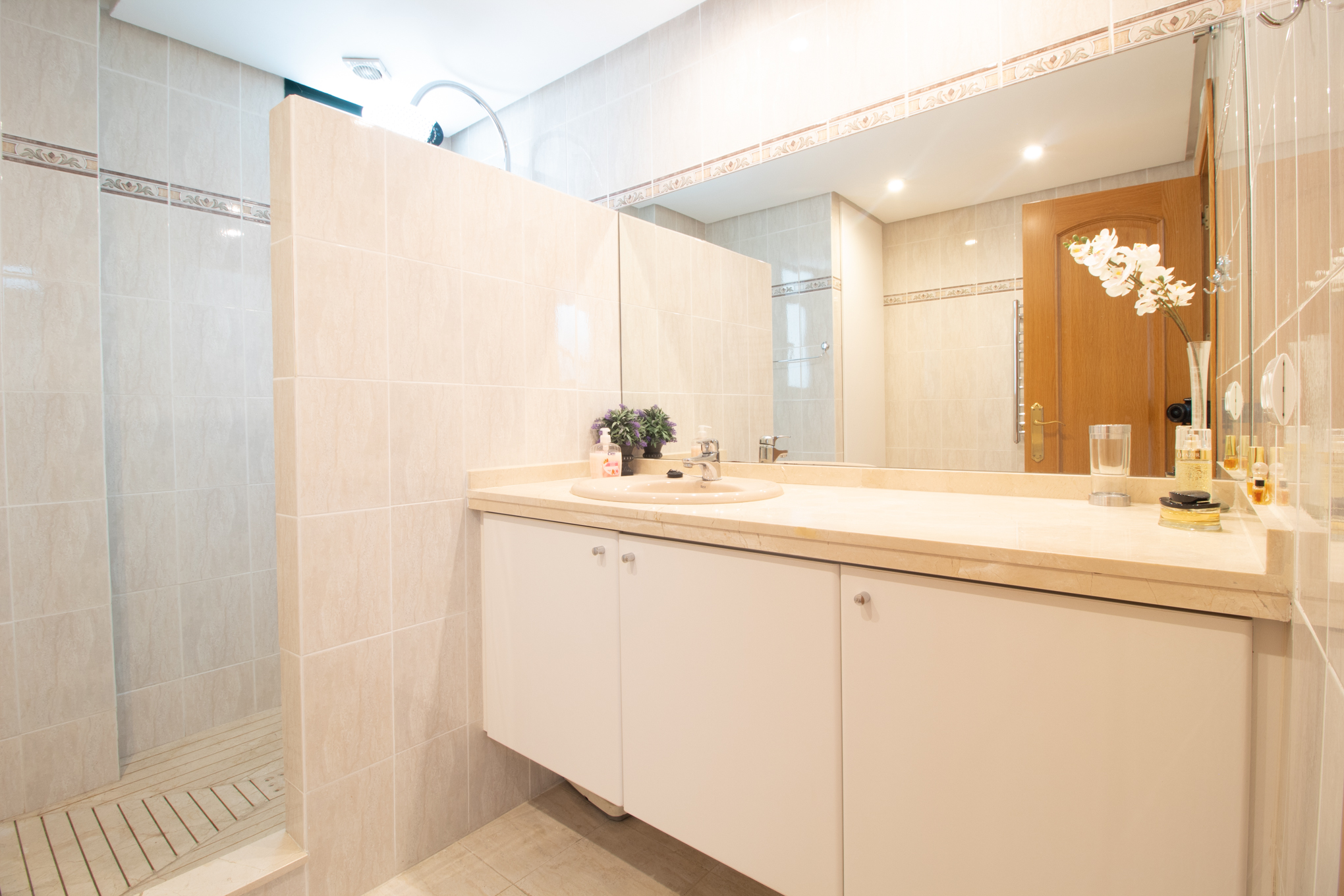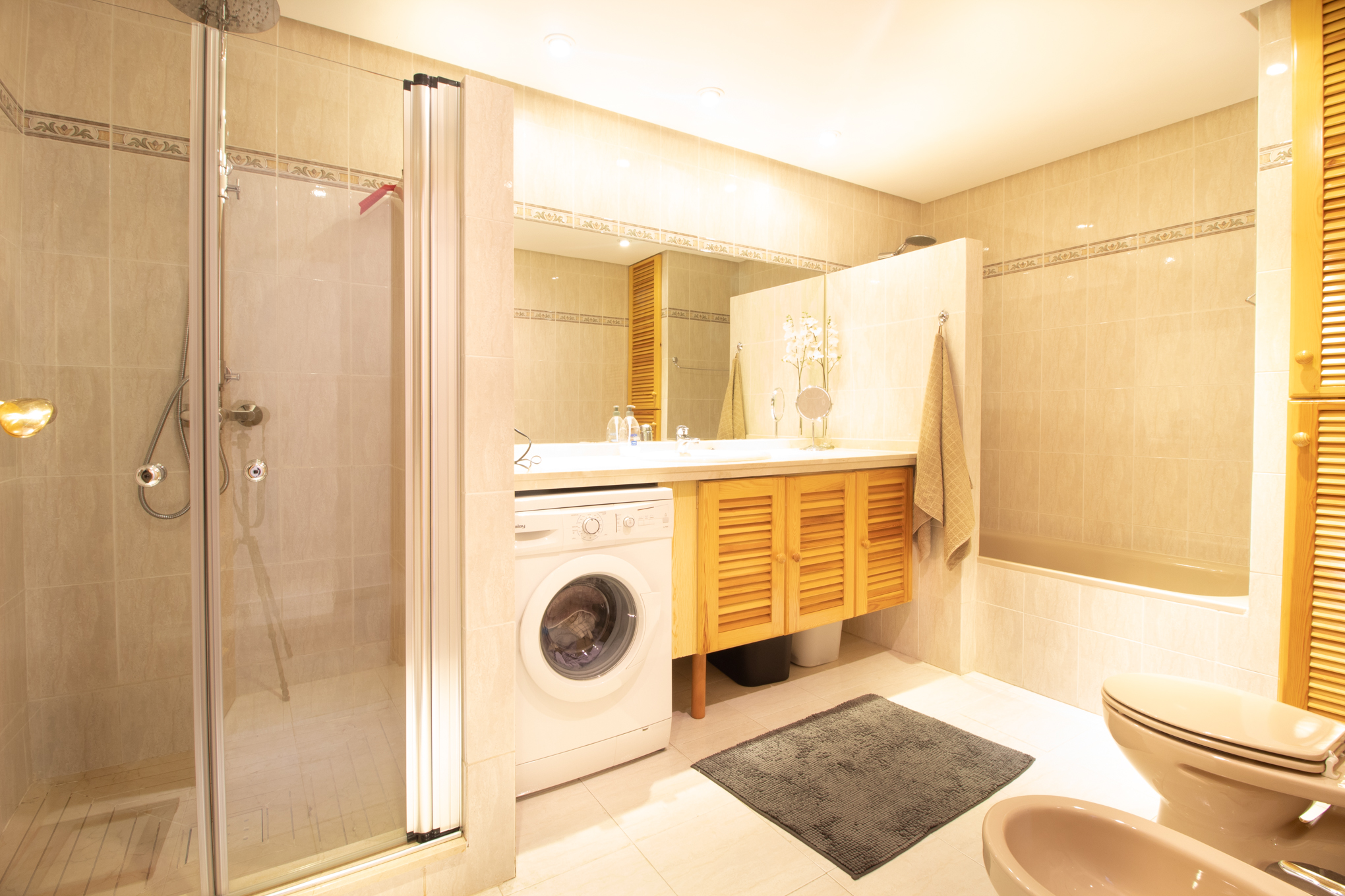 On the floor below you will find three more bedrooms and 2 bathrooms. From this level you have direct acces to the private garden and a downstairs terrace.