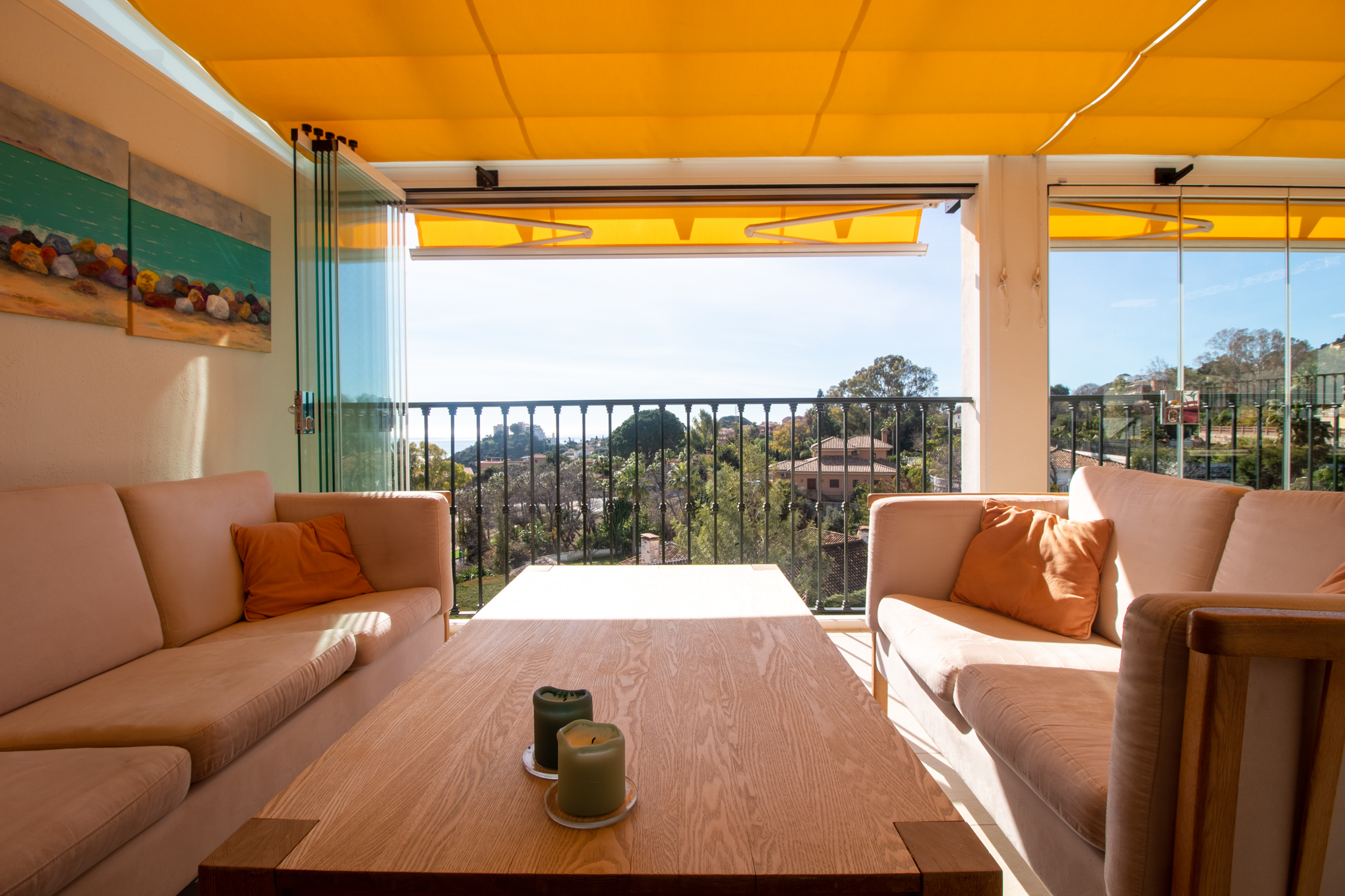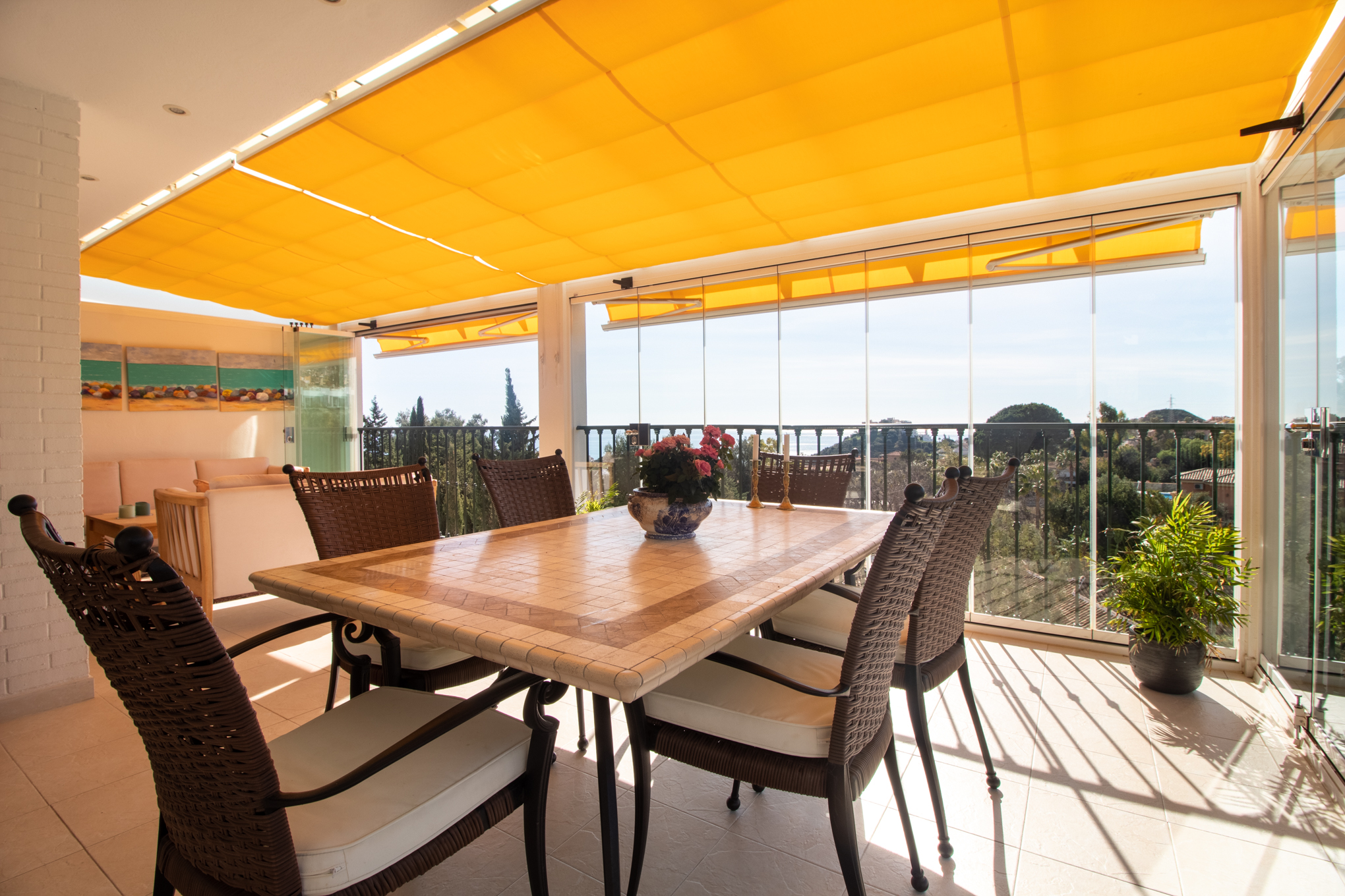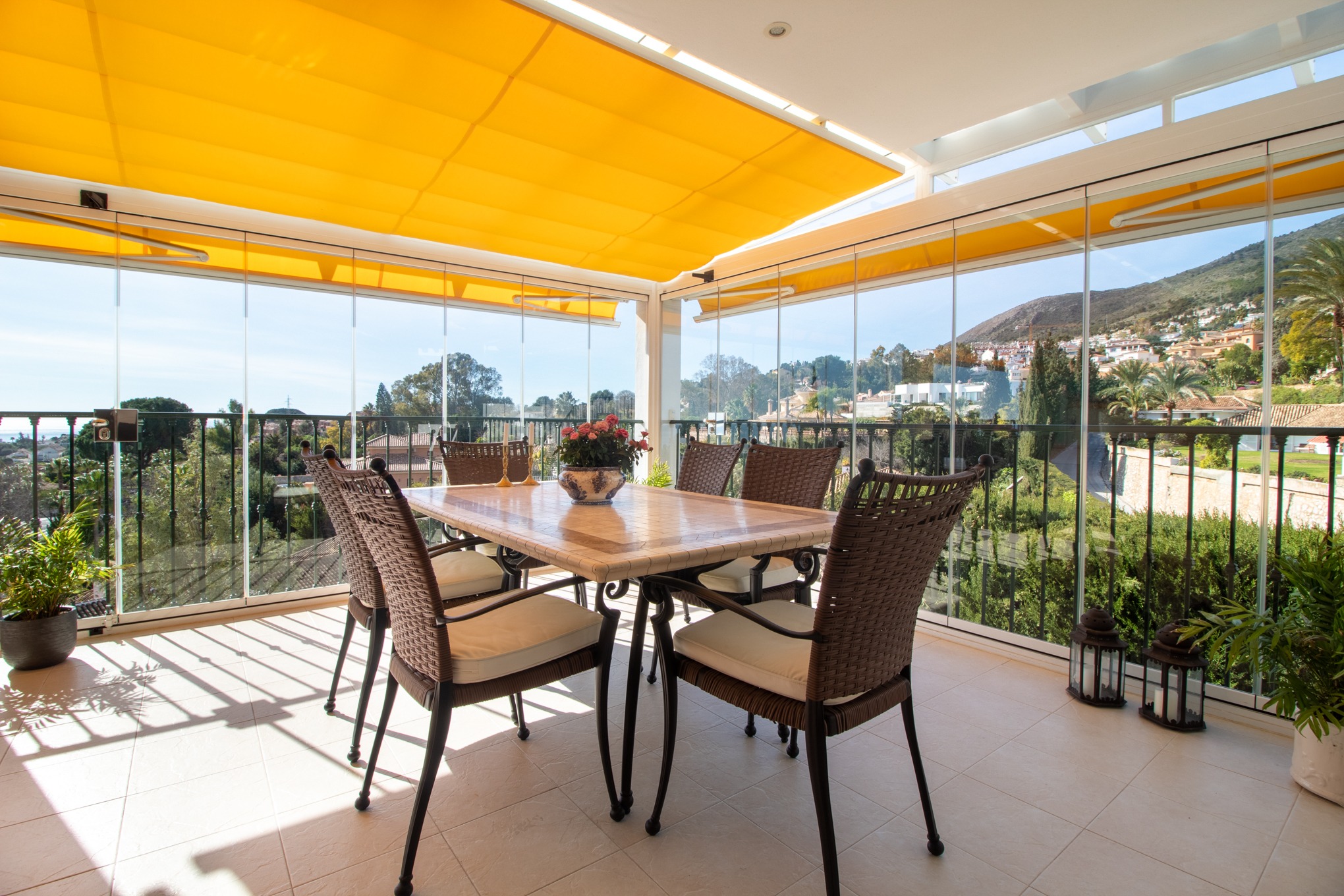 The current owner has glassed the terrace in to be able to extend the summers and have an extra living room. And for the summer you open these right up.