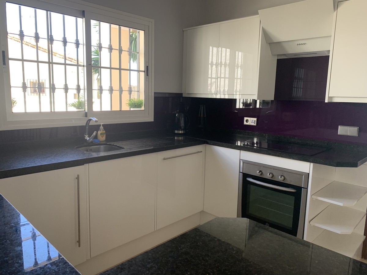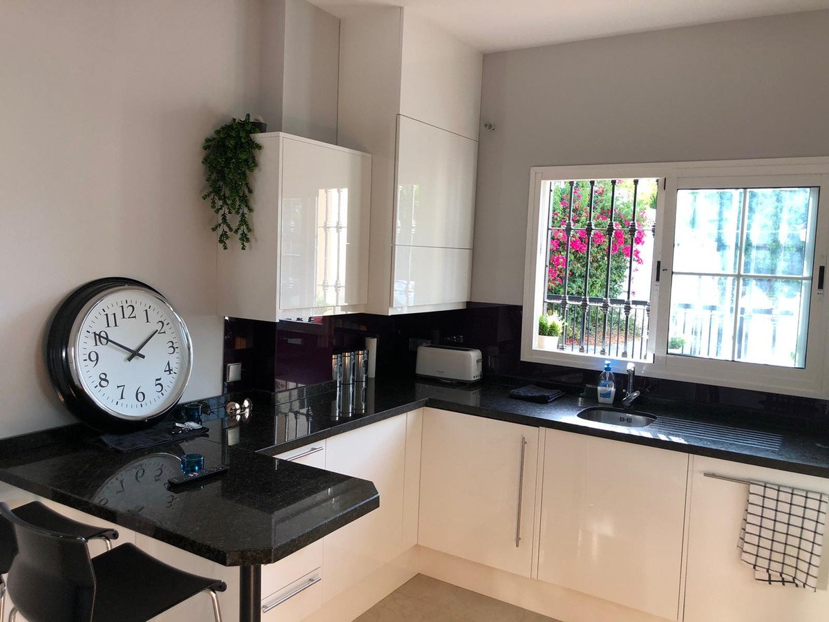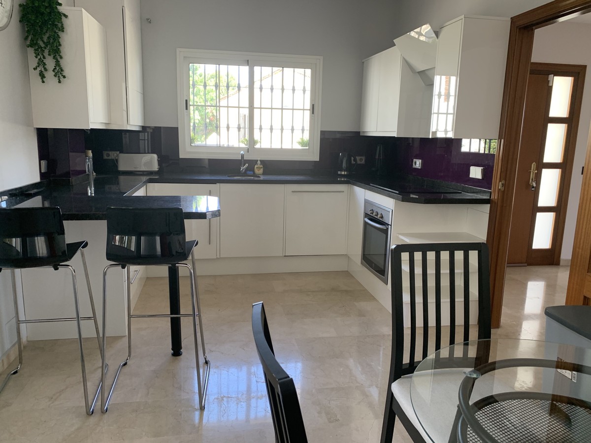 Built over 2 floors this detached villa is spacious, light and beautifully presented. As you are welcomed into the entrance hall, you have a feature staircase in front of you and to the right the kitchen. The fully fitted modern kitchen has been recently renovated and features a contemporary glass splash back, new appliances and marble worktops. There is a breakfast bar and ample room for a breakfast table.