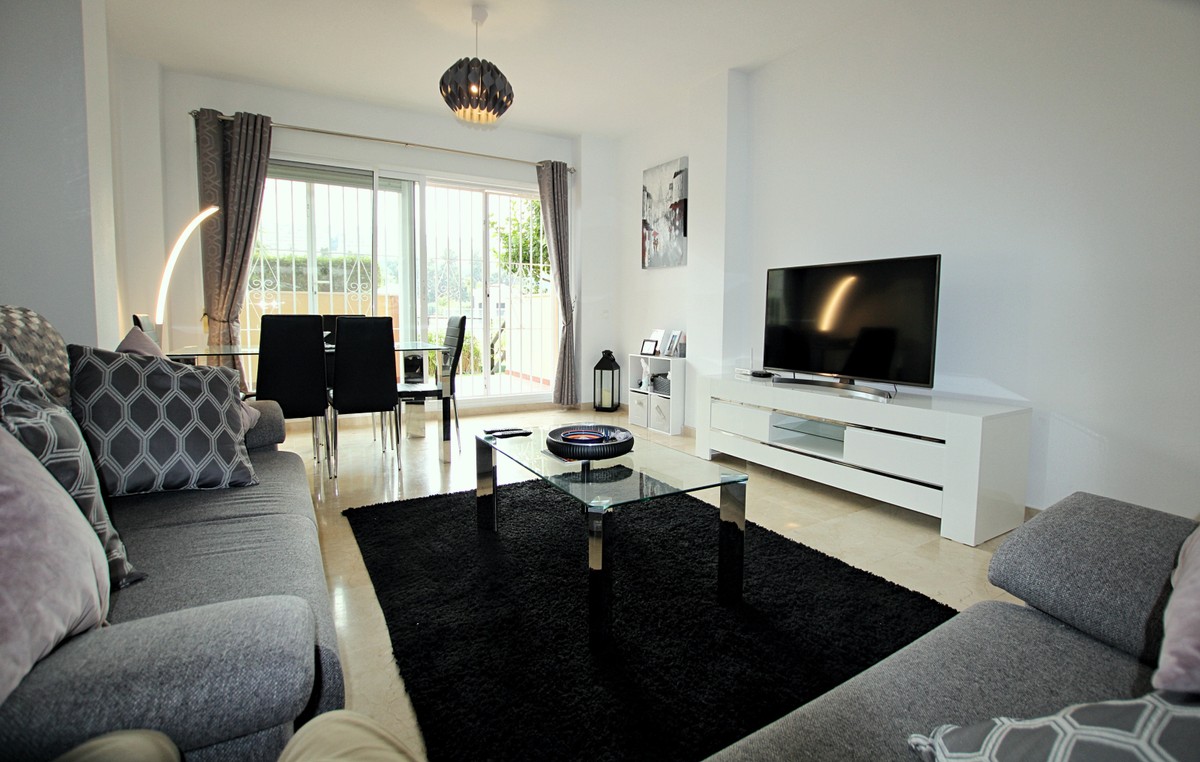 This is a superb value property in the La Noria area, an easy flat walk in to La Cala de Mijas. There is a very Large, partly covered terrace and a private garden to enjoy, as well as direct access to the community swimming pool and ample gardens. The lounge diner is lovely and bright thanks to the south west orientation, and there is a totally renovated, top quality kitchen with large utility room, 2 double bedrooms, 1 en suite bathroom and a shower room plus hot and cold A/C throughout. Underground parking, additional gated parking and a private storage room. A great property in a fabulous location!