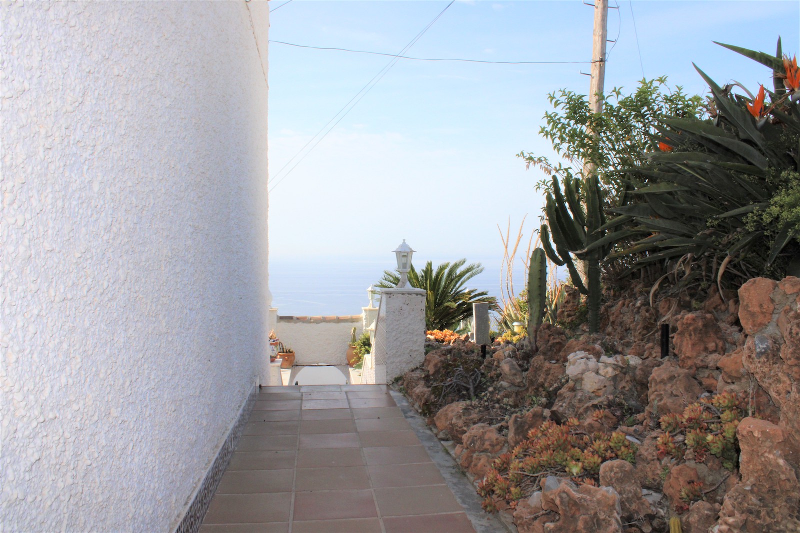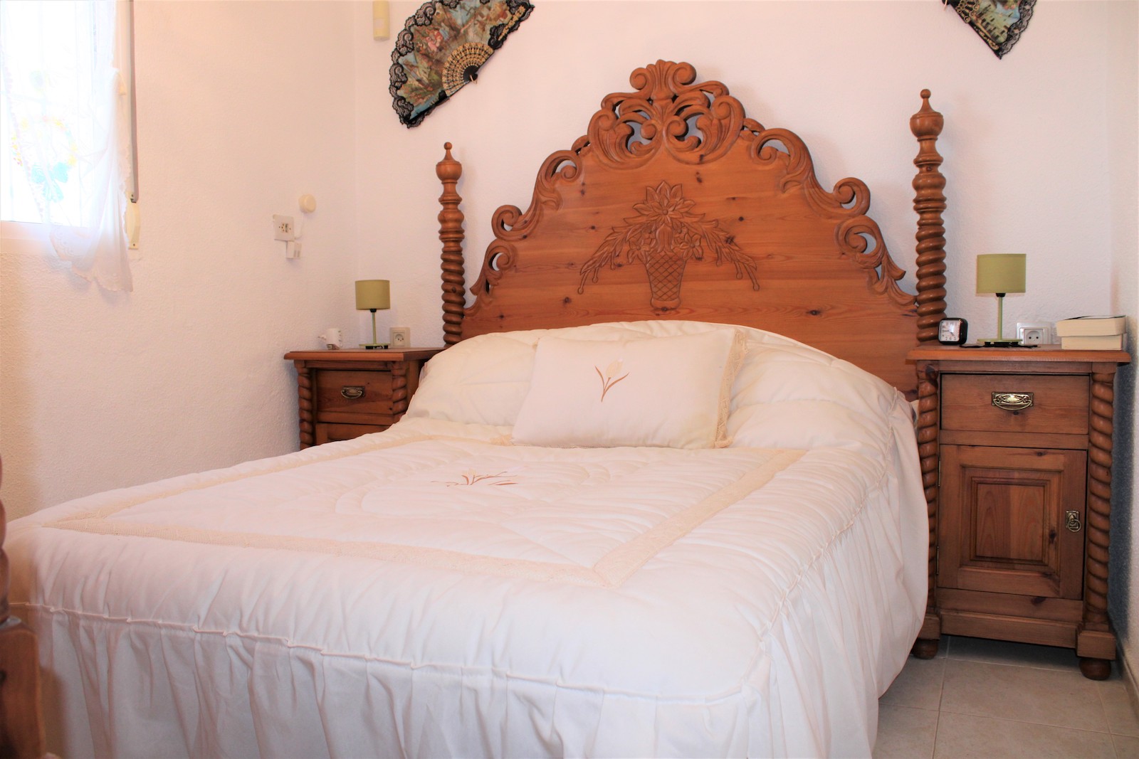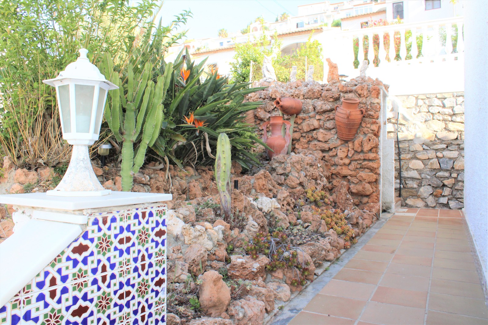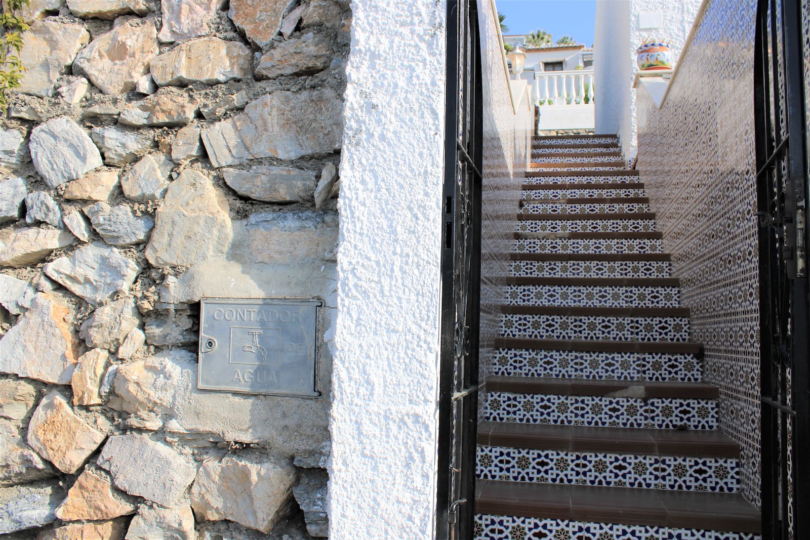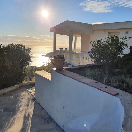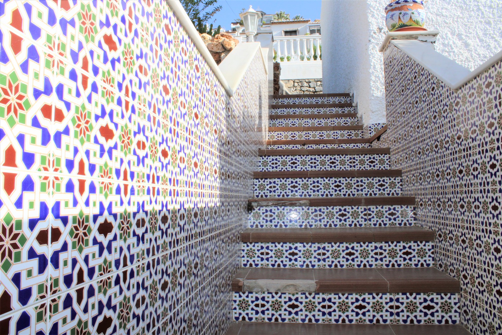 En välkomnande mosaikdekorerad trappa tar dig upp till terrassen som omgärdar villan, runt om finns även en medelhavsträdgård. När vi kommer in i huset, har vi vardagsrum, tv-rum och matplats i ett. Fönster från golv till tak i söderläge erbjuder dig en härlig utsikt över medelhavet och ger mycket ljus åt villan. Därefter kommer ett normalstort fullt utrustat kök, tre sovrum och ett badrum med dusch.