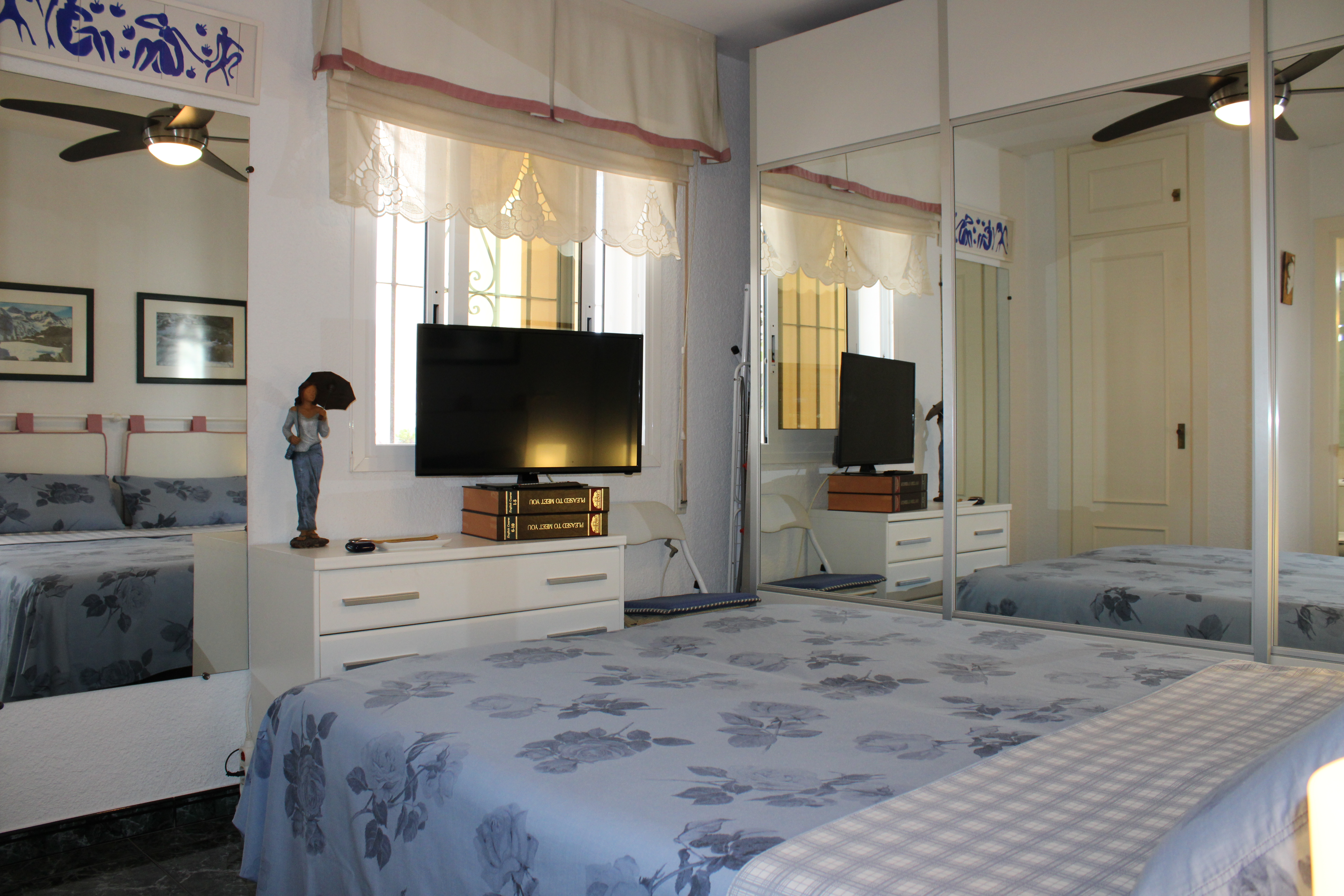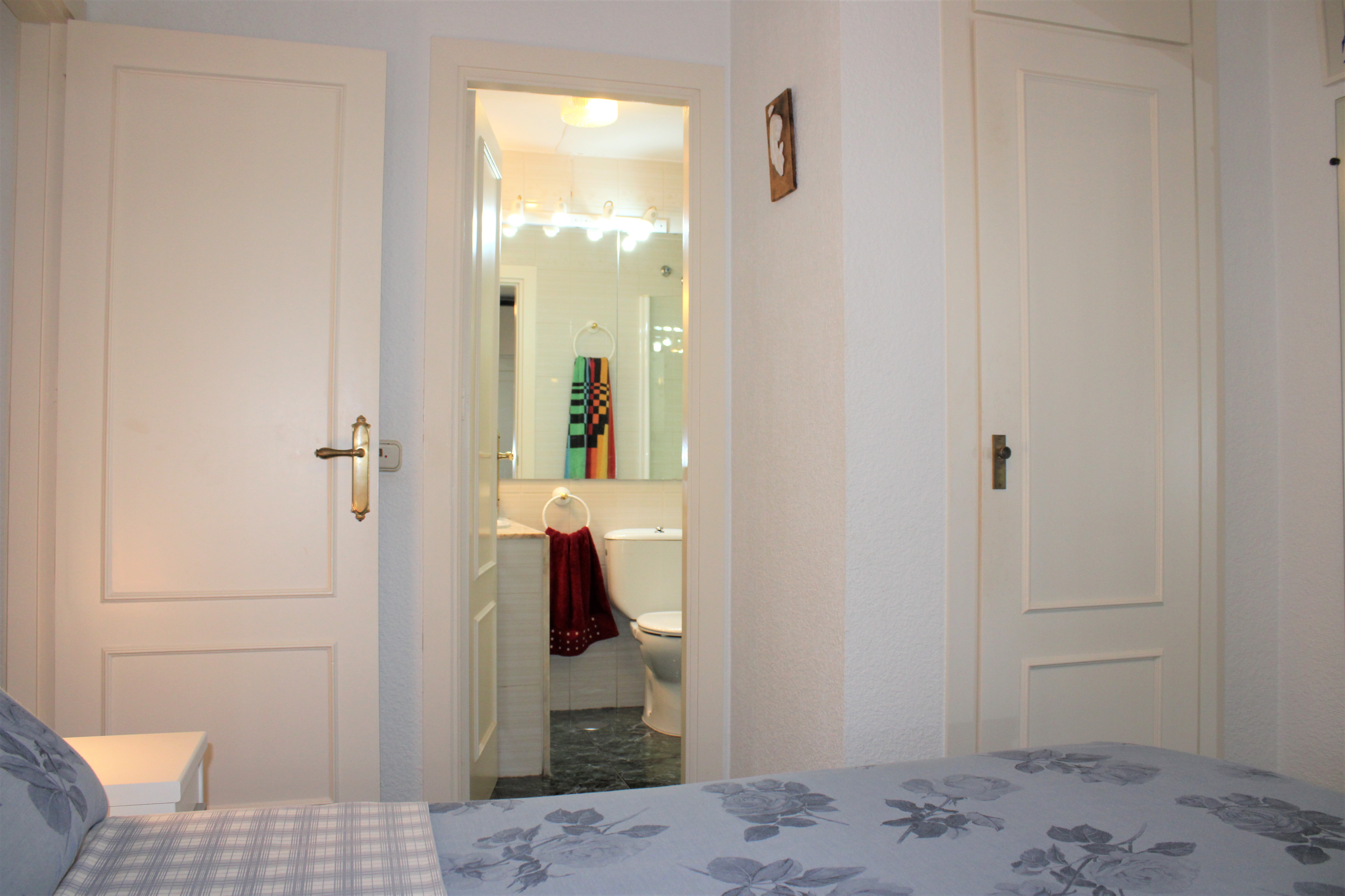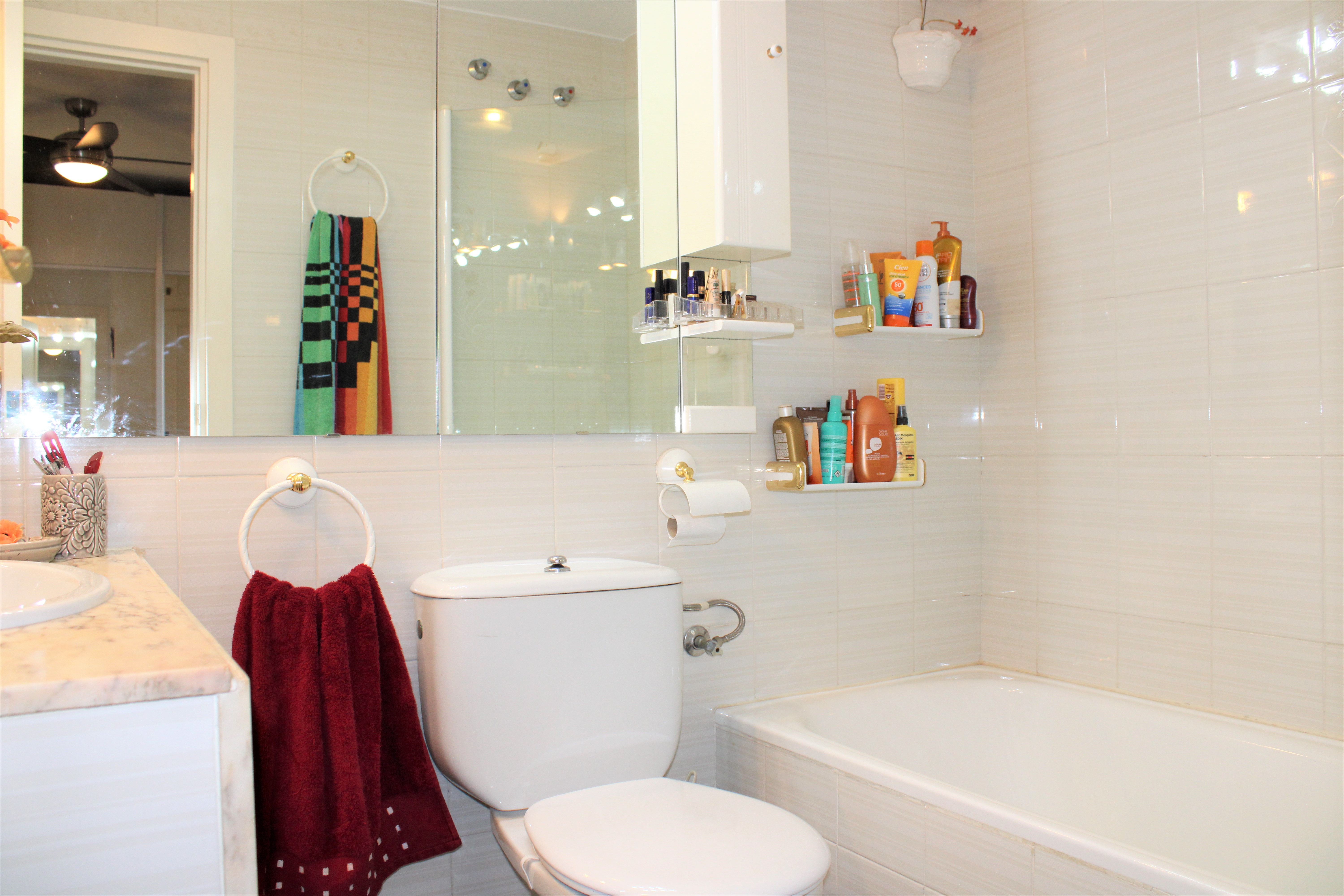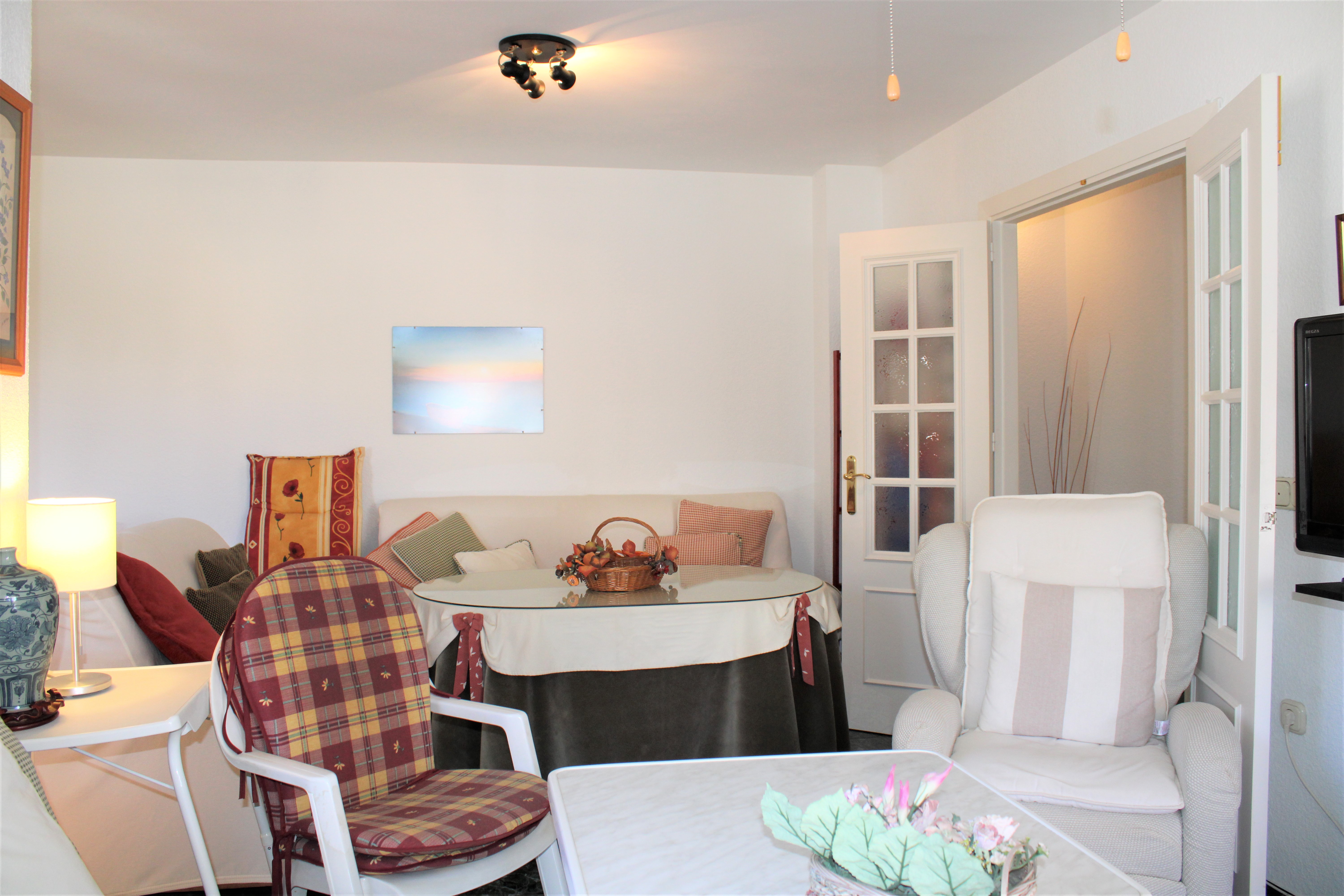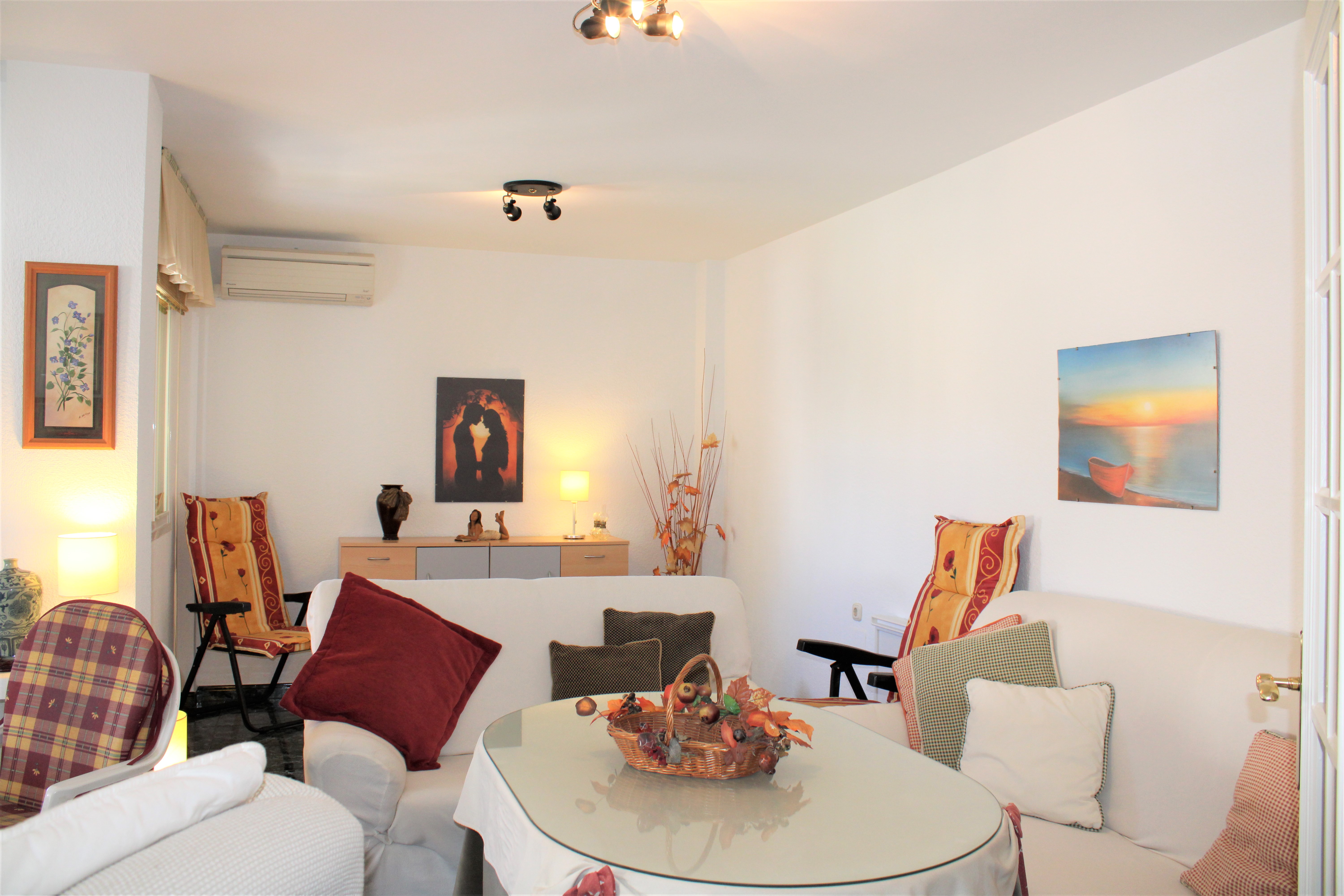 Lägenheten har två sovrum och två badrum, ett sovrum med badrum ensuite. Båda sovrummen har takfläkt och garderober, inbyggda garderober finns även i hallen. Ett ljust fullt utrustat kök med diskmaskin, samt ett stort ljust vardagsrum med matplats. Vardagsrummet har både takfläkt och air-condition och ligger i anslutning till den härliga terrassen. På terrassen sitter ni och njuter av kvällssolen efter en härlig dag på stranden.