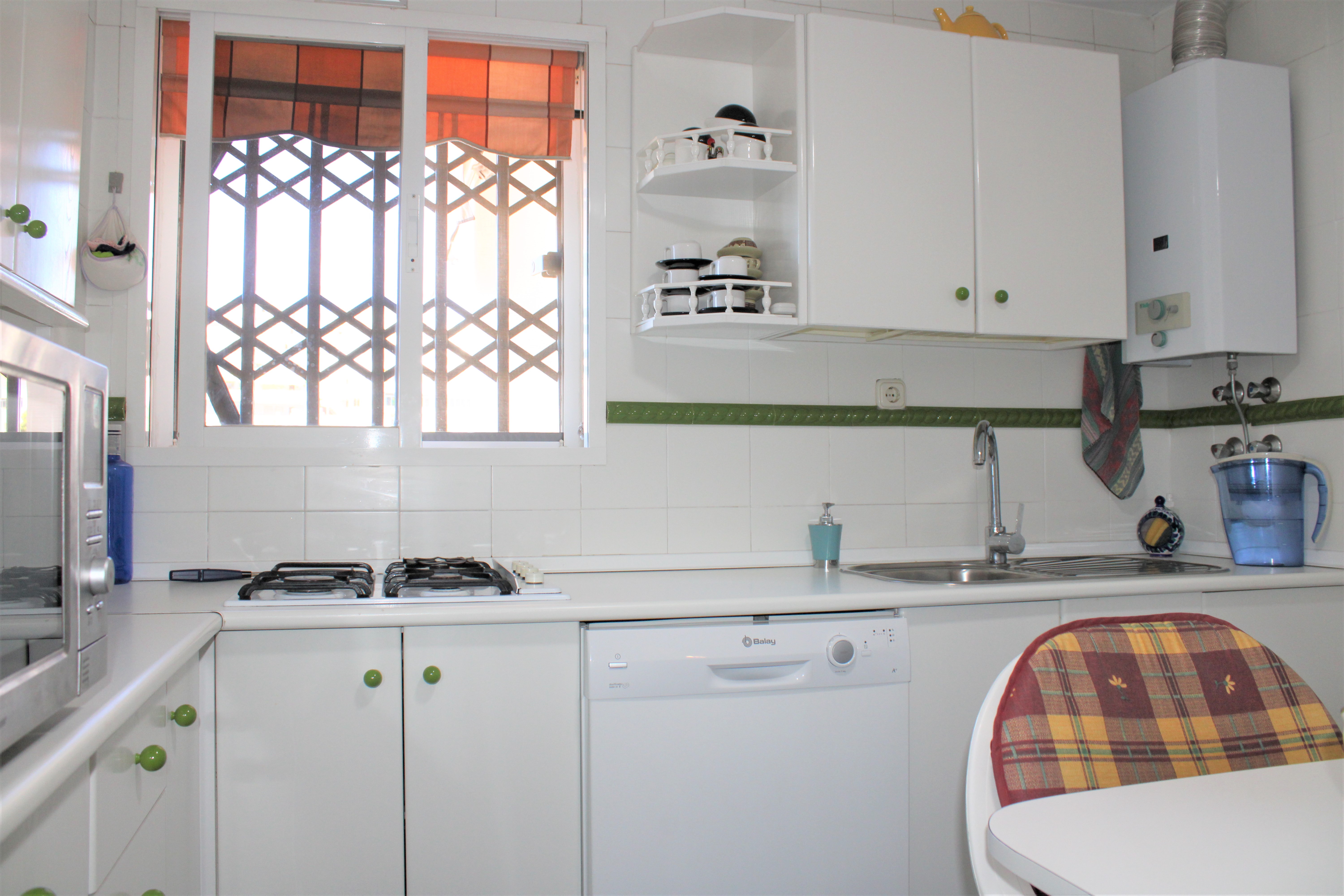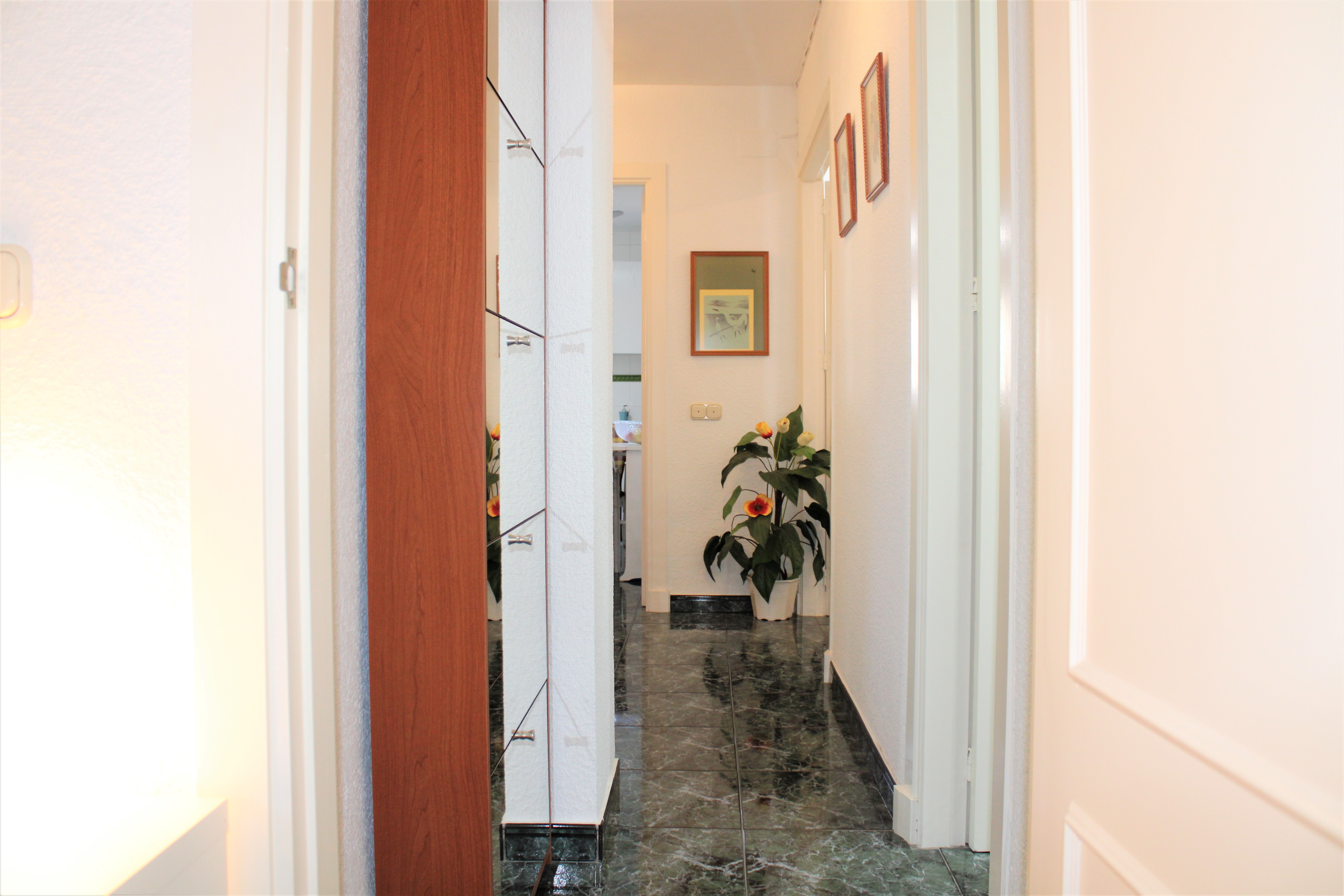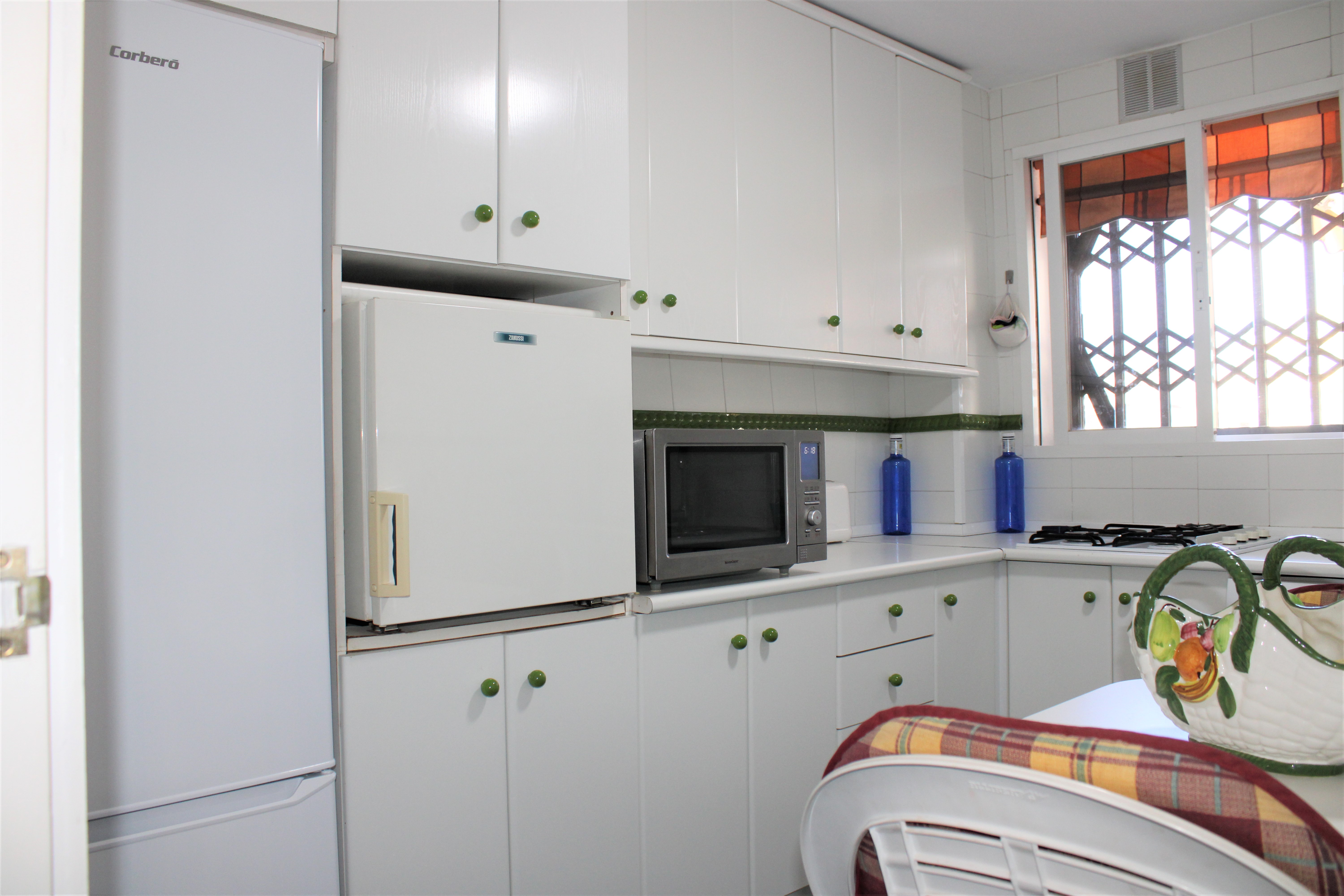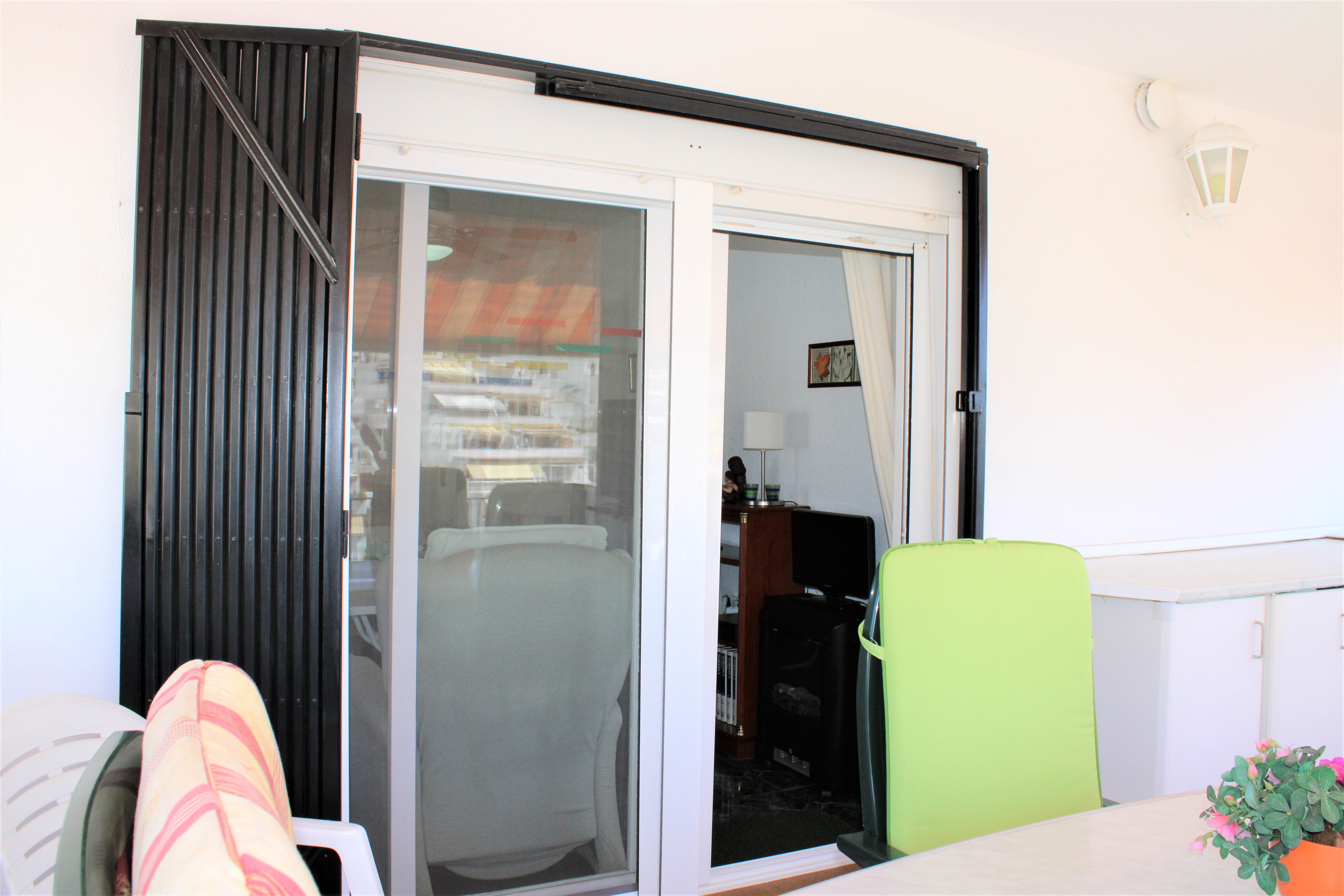 Total yta är 117 kvm och inkluderar den härliga terrassen, där ni har en strålande havsutsikt. På terrassen har ni även en tvättmaskin, med luckor framför så att den inte syns. Dörrarna till terrasserna och samtliga fönster är av aluminiumprofil och är skjutbara i sidled, de har även myggnät. Till lägenheten hör även ett förråd, som ligger i anslutning till entrén i bottenvåningen. Perfekt för att kunna lägga in sina saker efter en dag på stranden, eller för att kunna låsa in sin cykel.
