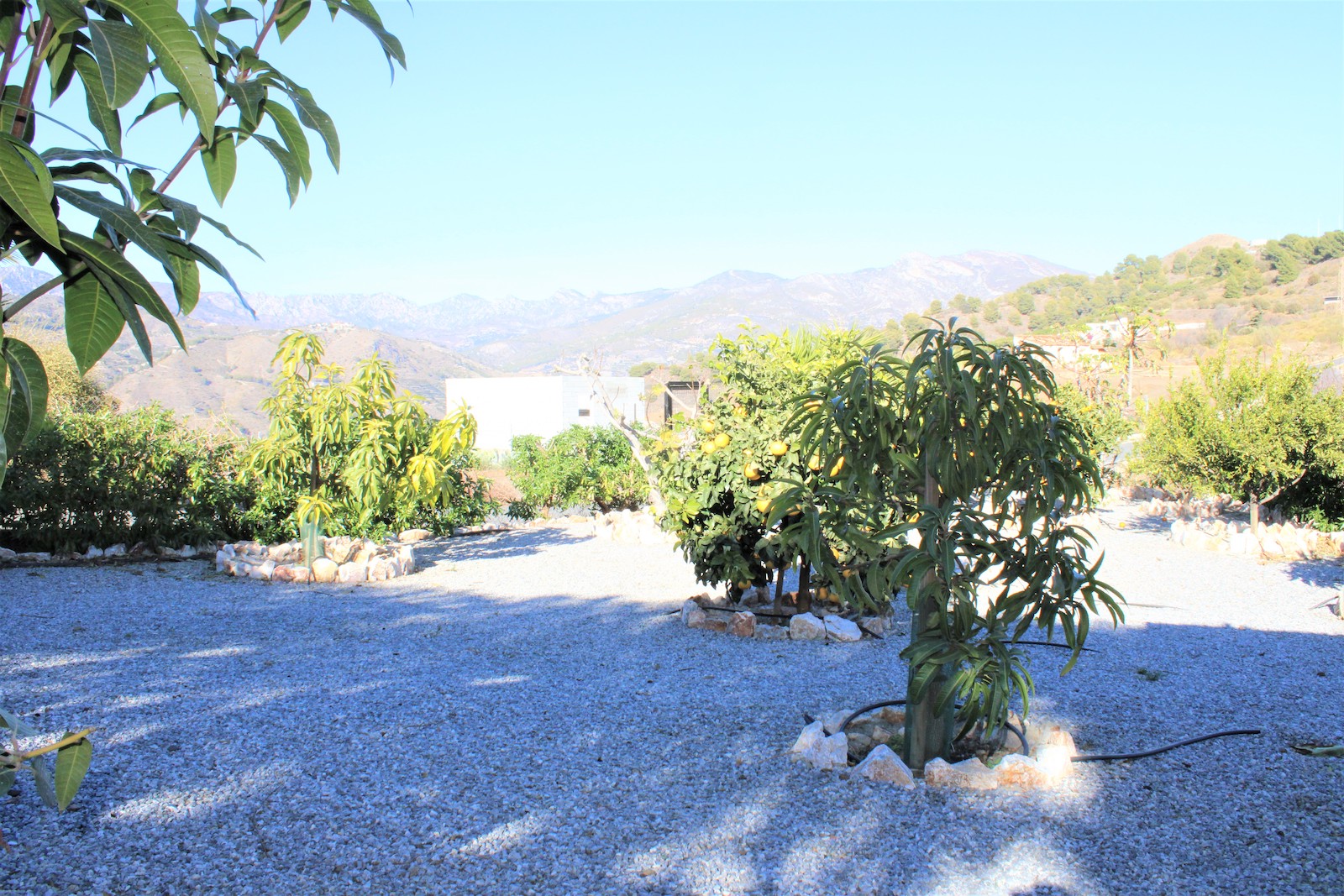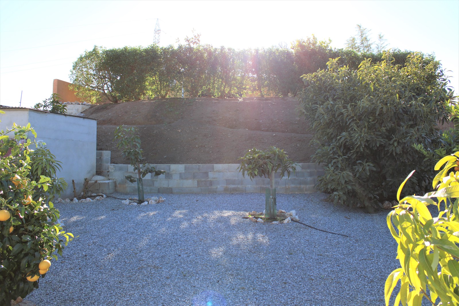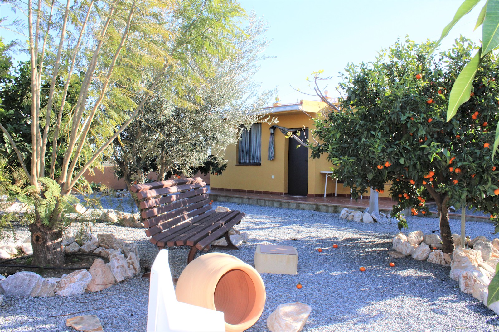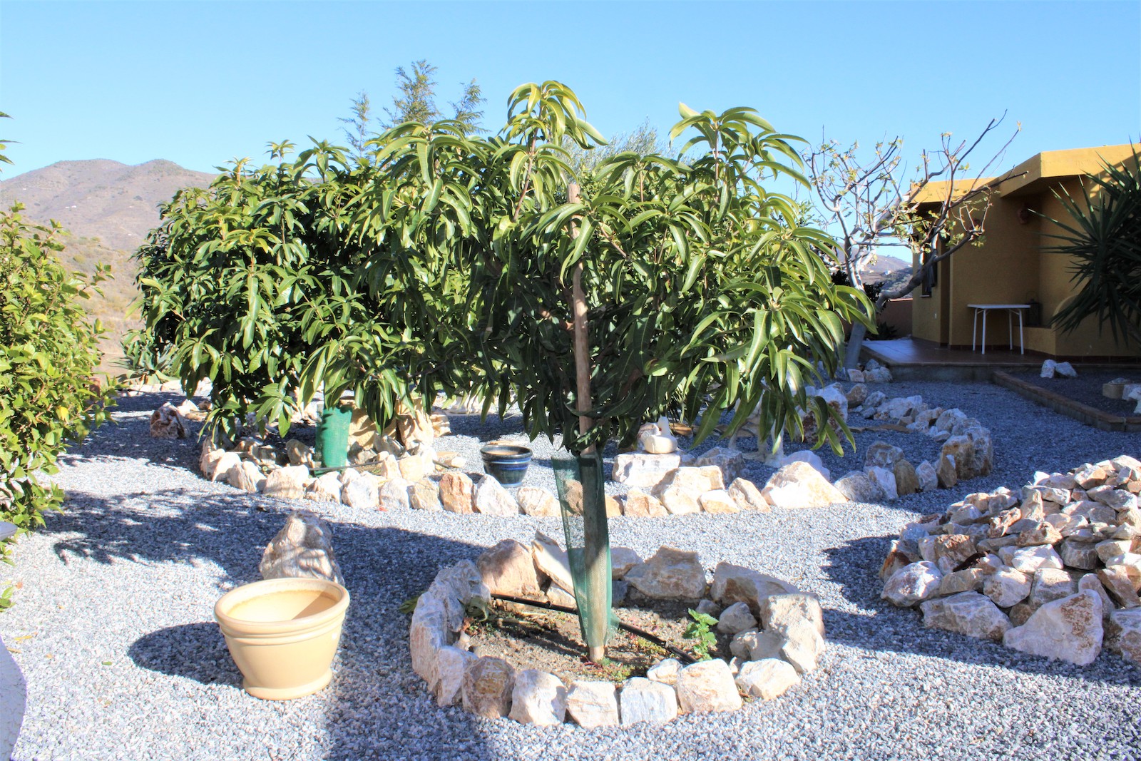 Vi går nerför trappan och hittar den första av två, välskötta fruktträdgårdar. Här ligger det andra boendet, med ett sovrum och ett badrum med dusch. Ni hittar även en stor källare med stora möjligheter och förvaringsutrymmen, här har ägaren påbörjat en spa-avdelning. Väl ute ur källaren, går vi ned en trappa till och hittar där den andra välskötta fruktträdgården.
