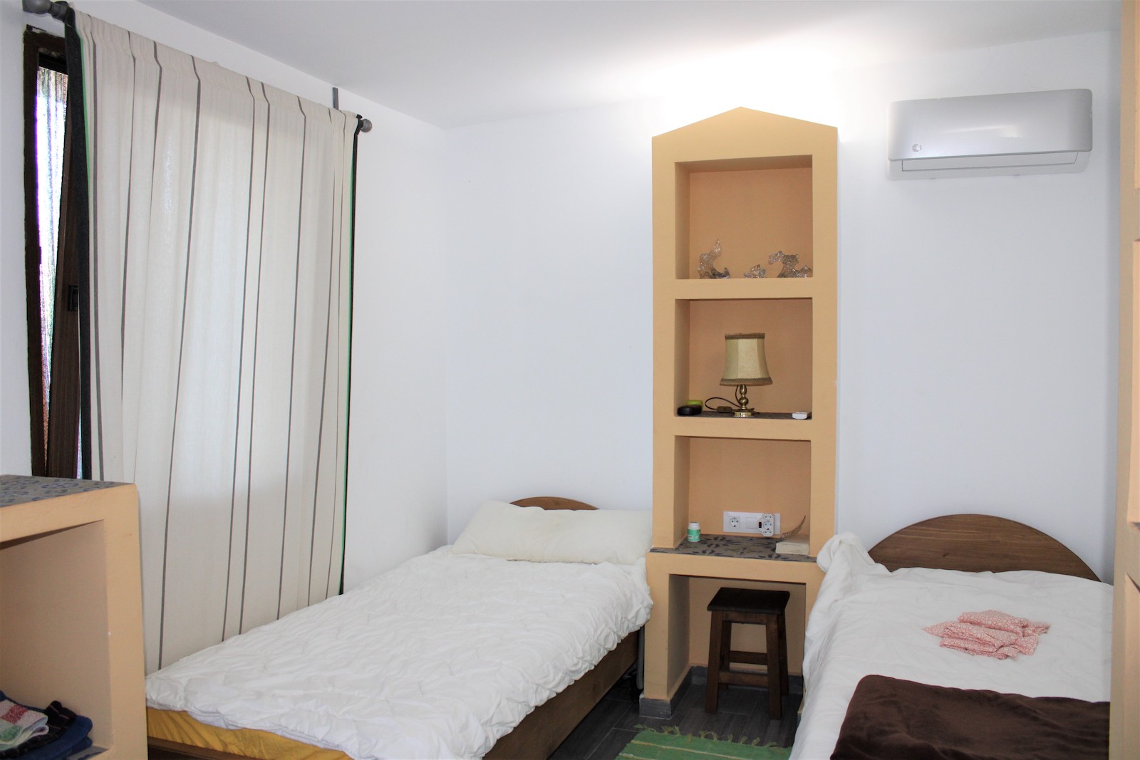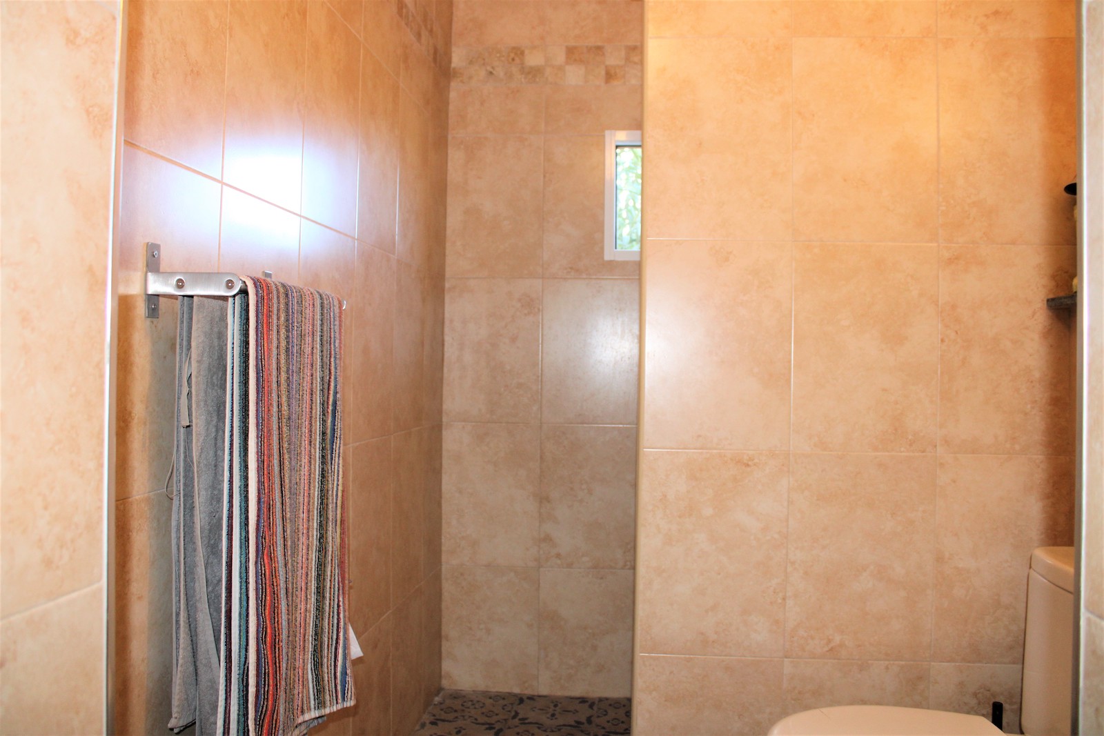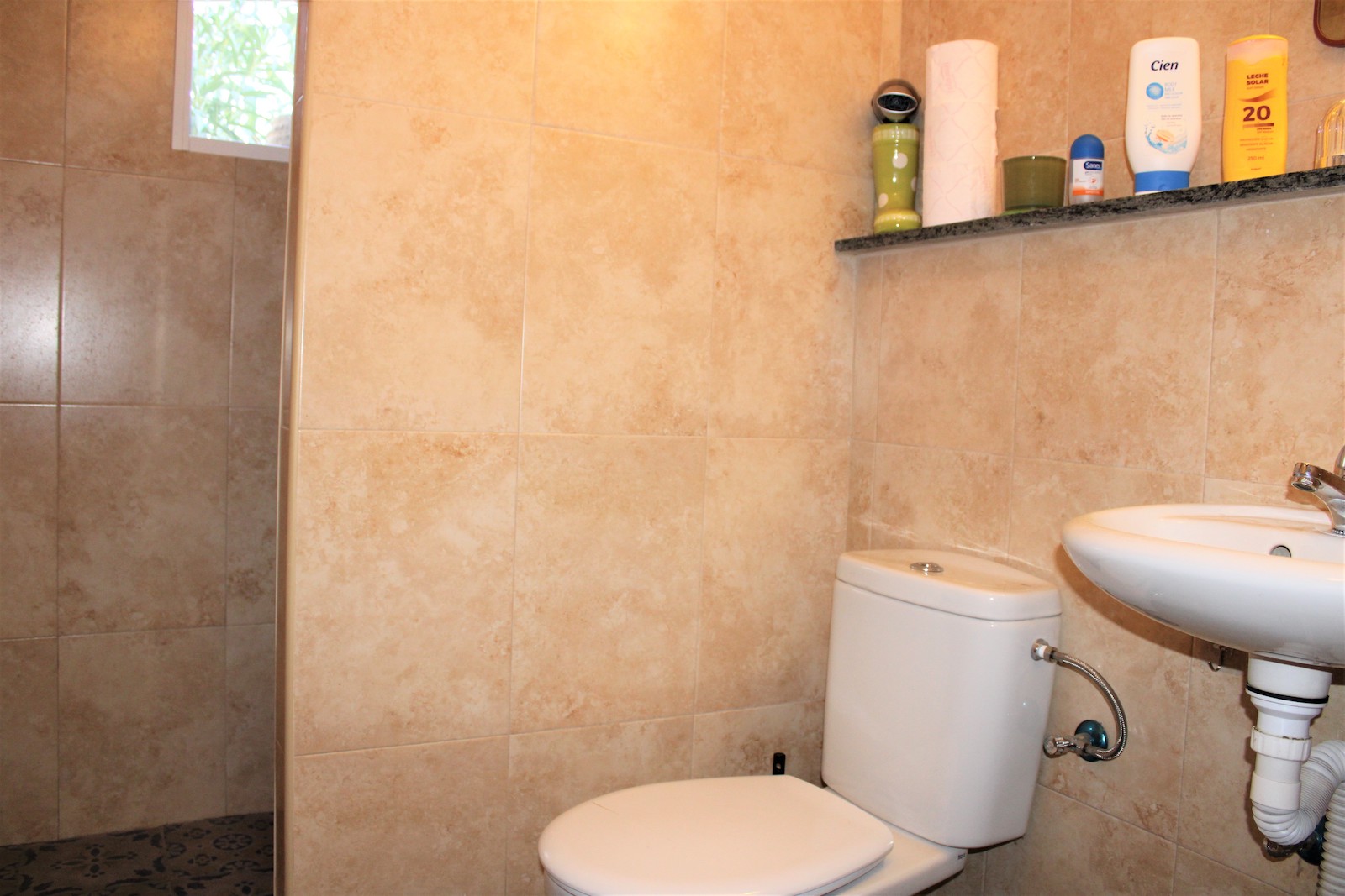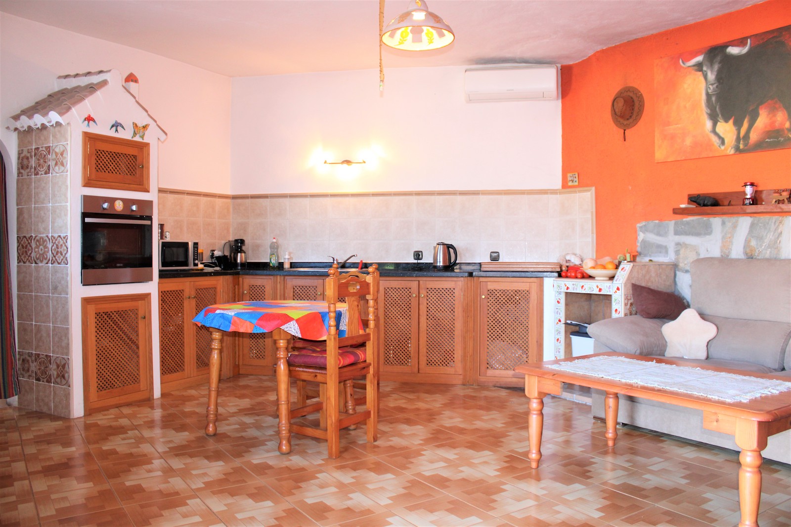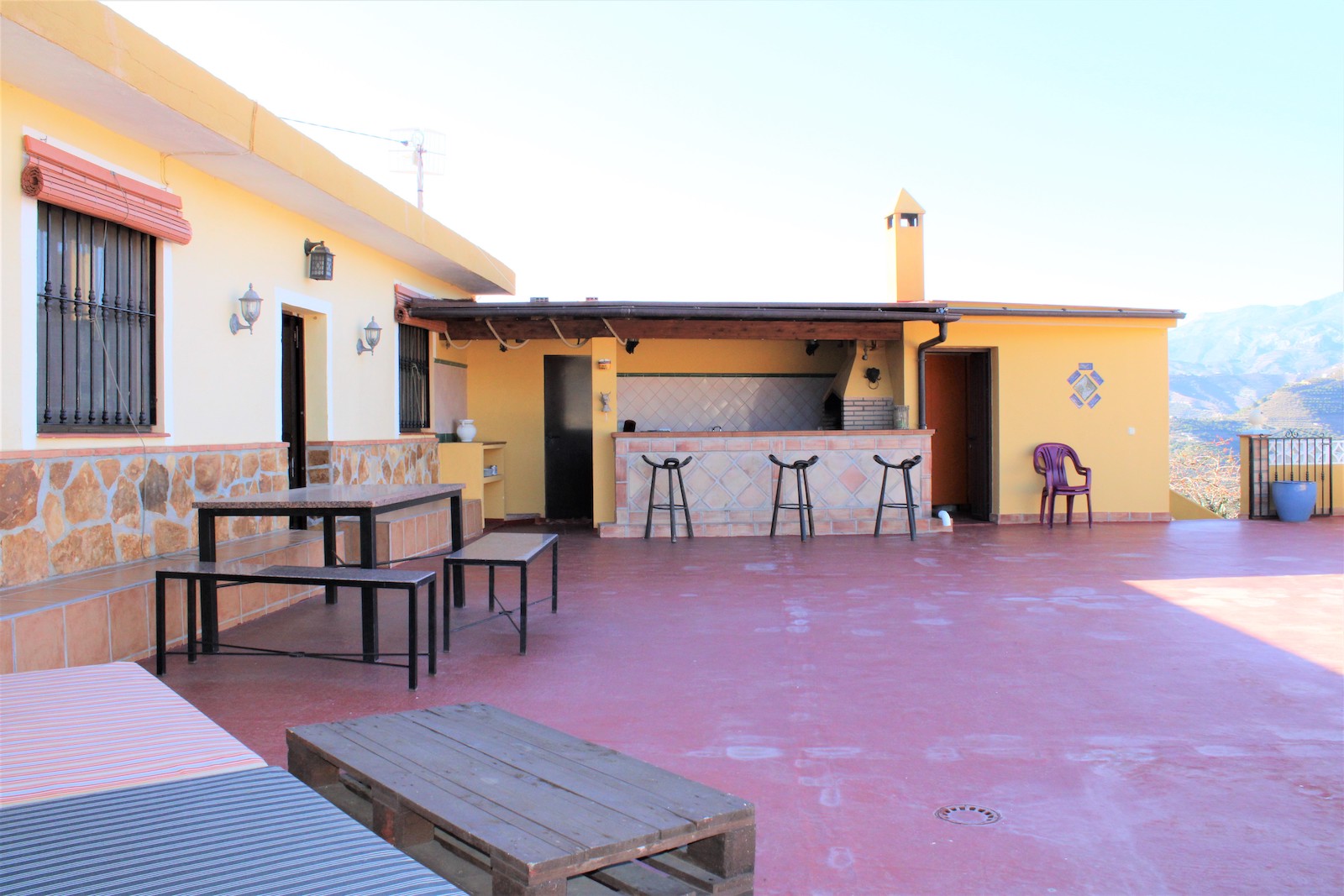 Villan är uppdelad i två plan och på övre delen har ni en boendedel med ett sovrum med inbyggda garderober, ett badrum med dusch och tvättmaskin, öppen planlösningen med kök och vardagsrum. Här har ni även ett fantastiskt pool-område, med både havsutsikt och härlig utsikt utöver bergen. På den stora terrassen finns även utomhusdusch, förråd och ett mysigt utomhuskök med grill och bardisk, ett perfekt ställe att underhålla sina gäster.
