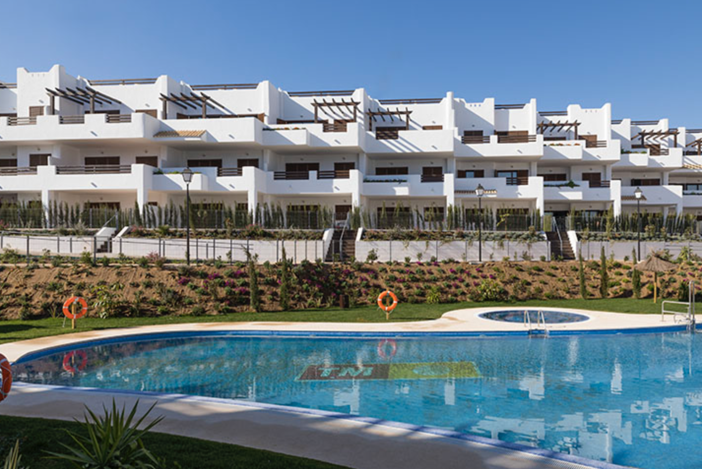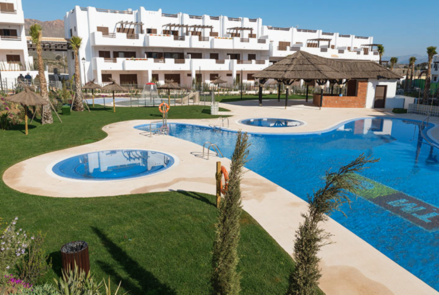 Mar de Pulpí Jarilla is a residential complex just a stroll away from Los Nardos Beach. Enjoy the warm Andalusian sunshine on the poolside lawns surrounded by colourful gardens. If you fancy cooling off or swimming laps to stay in shape, the two adult swimming pools boast lots of space. The kids will be absorbed in their own fun and games at the playground, protected within the secured perimeter, ensuring their safety at all times. Meanwhile, you can unwind and destress in either of the two heated jacuzzis, only to emerge feeling rejuvenated and re-energised. Alternatively head to the Courtyard for some quiet downtime surrounded by trees and colourful gardens. Walkways surround and cross the communal areas giving you easy access to any part of the grounds, perfect for a relaxing stroll as you soak up the Mediterranean climate.