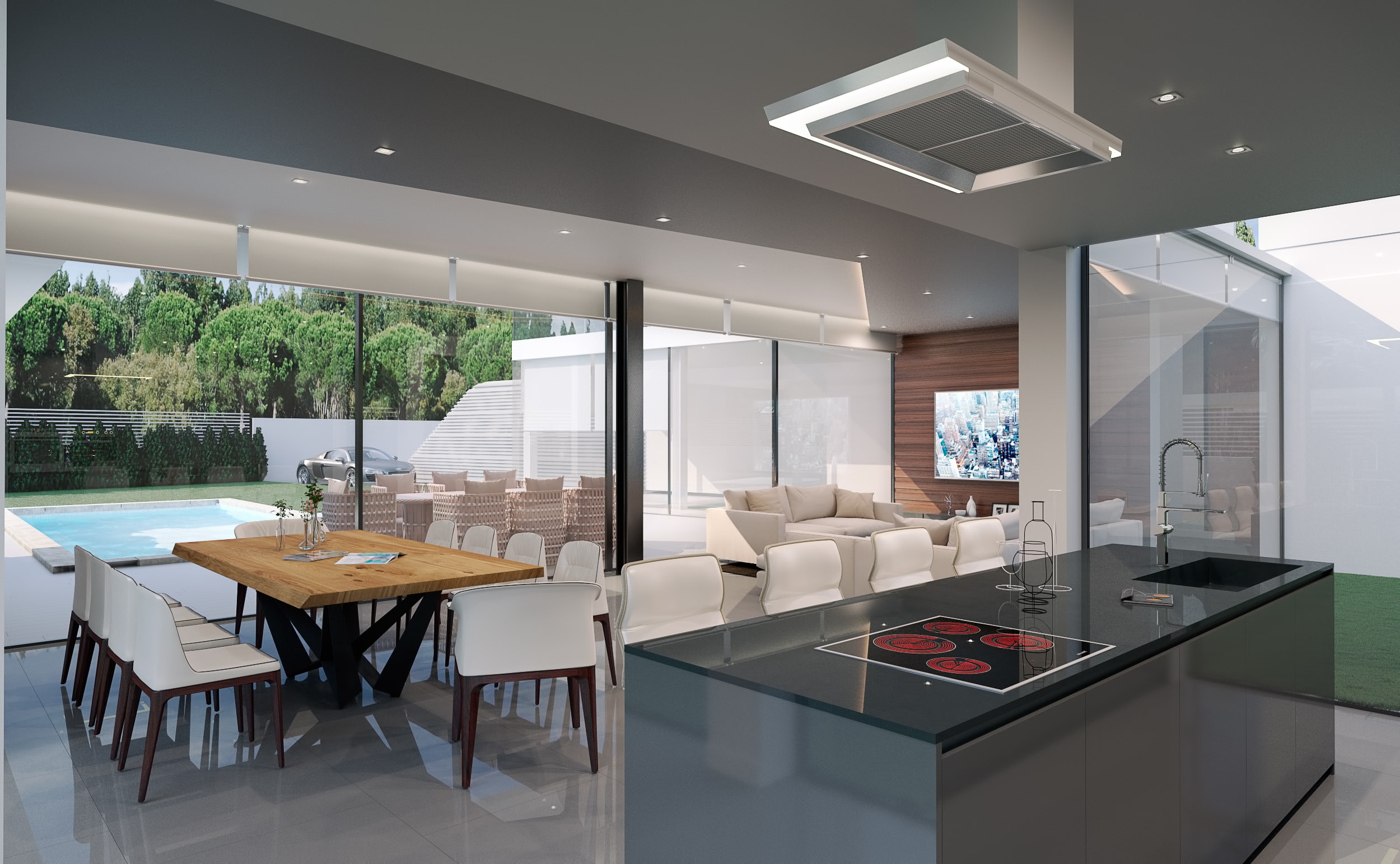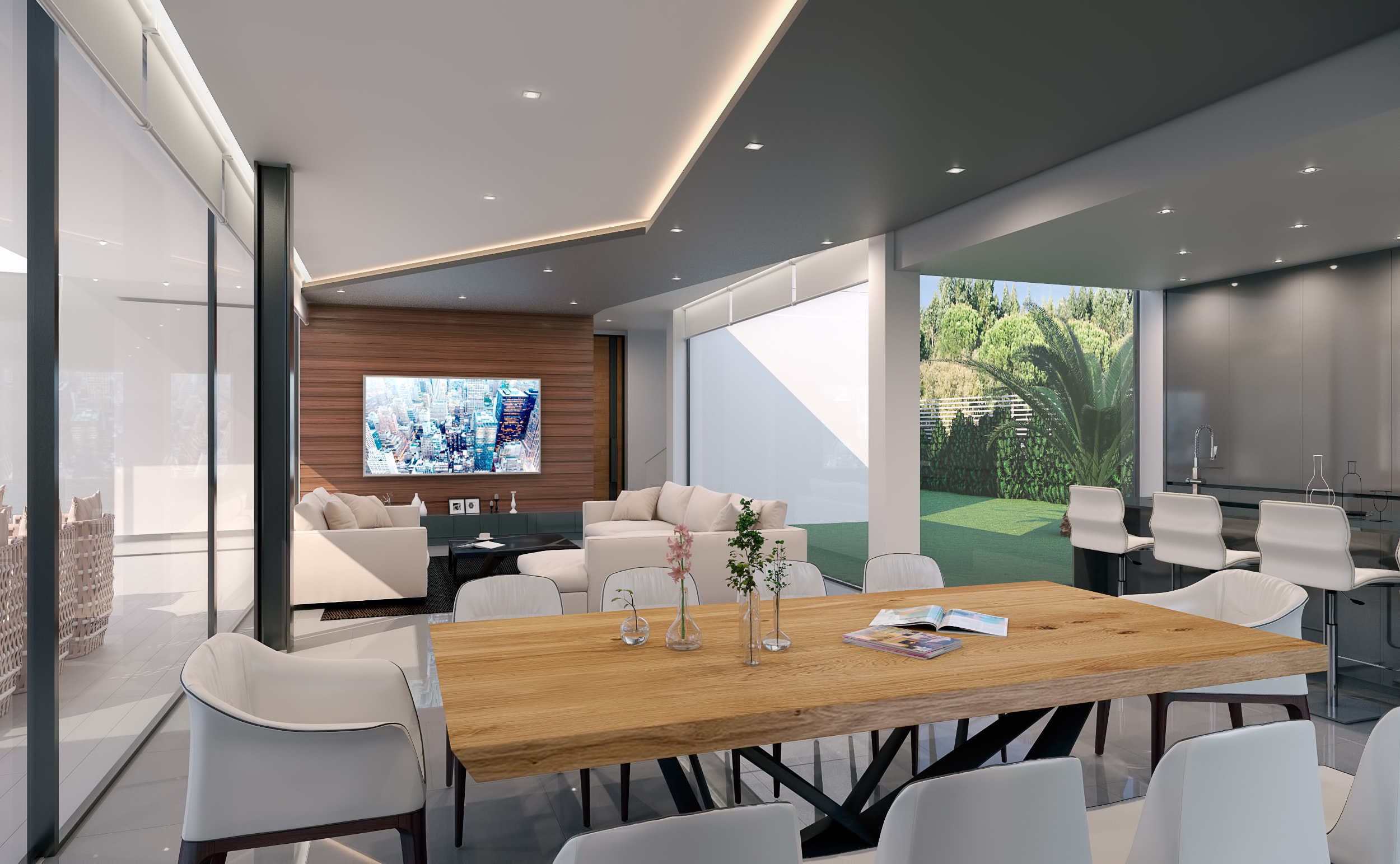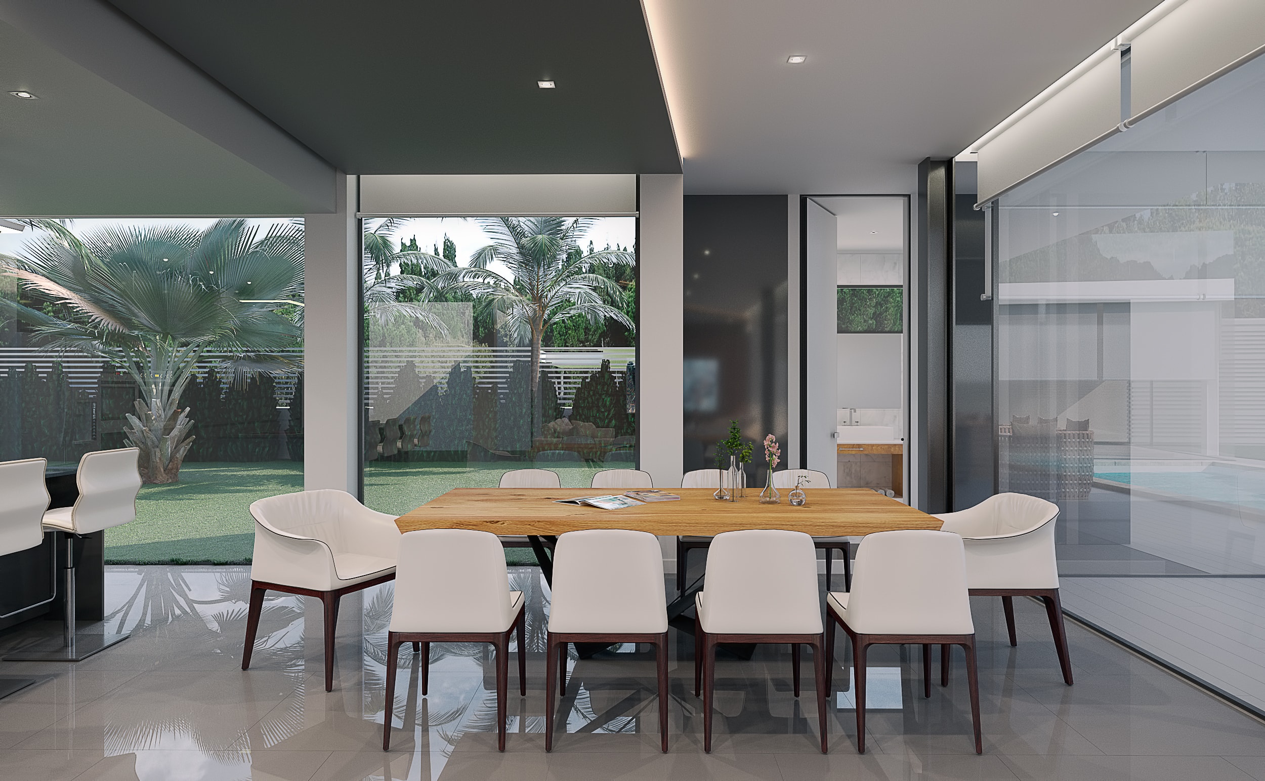 298m2 villa built on two floors with a total of 4 bedrooms, 4 bathrooms, guest toilet, spacious living room and fully equipped designer kitchen, private garage with direct access to housing. 1046m2 plot with 100% privacy, garden and private pool. Just 20m supermarkets and shops and 300m from the beach and the marina of Campomanes.
