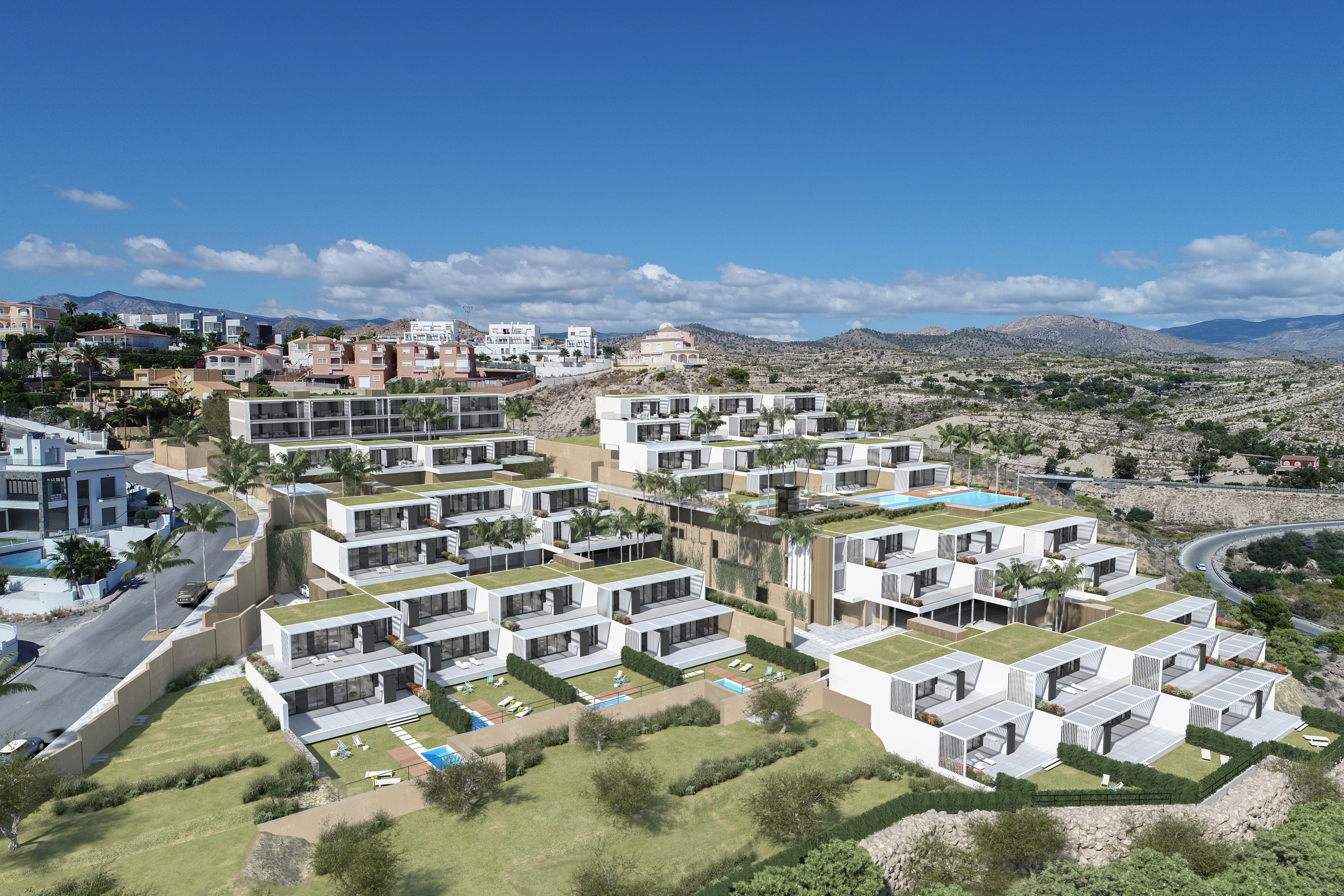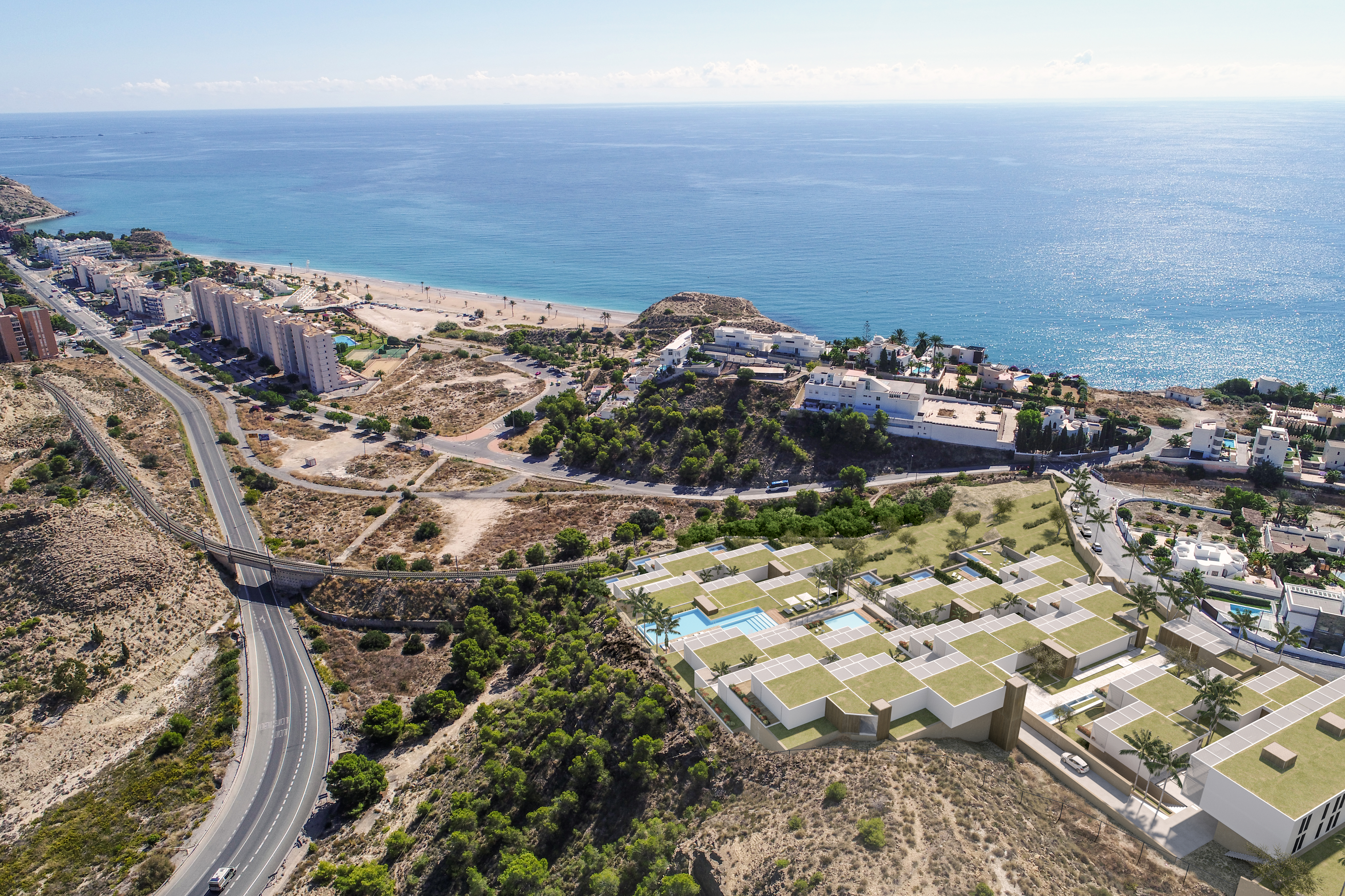A complex designed in a plot with a notable slope, where 56 terraced homes with sea views are distributed. A topographic adaptation designed for each housing unit creates a composition of white structures on the plot, which alongside the open spatial layout with landscaping featuring native species, confer the residential area with a balanced dialogue between modernity and natural scenery.