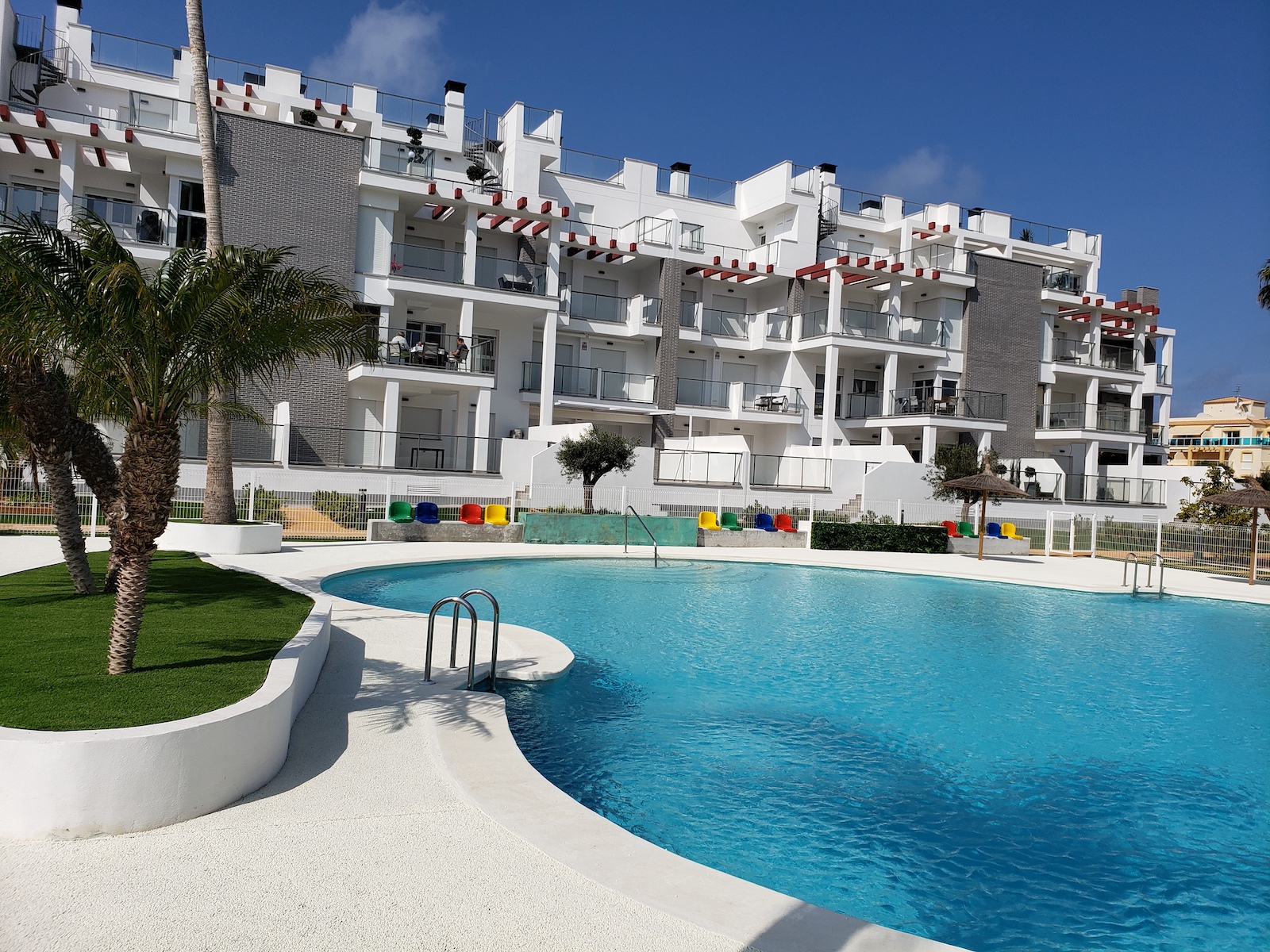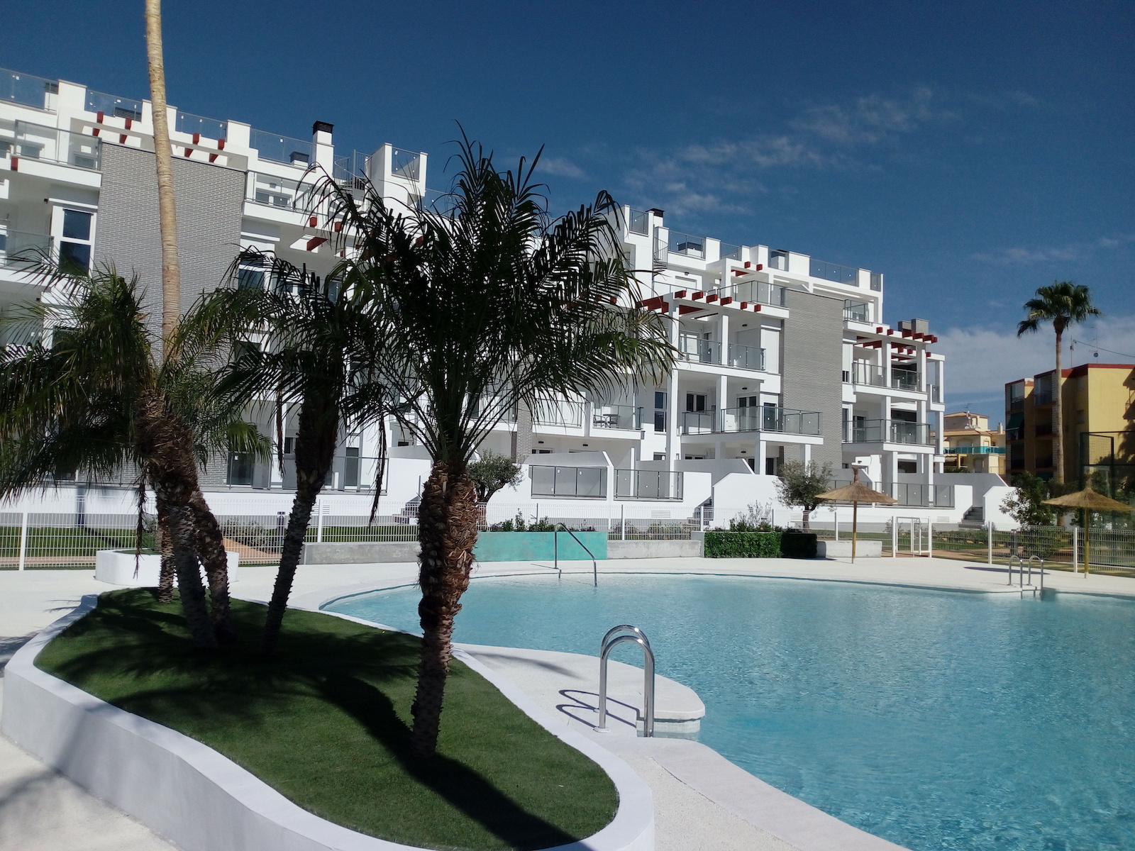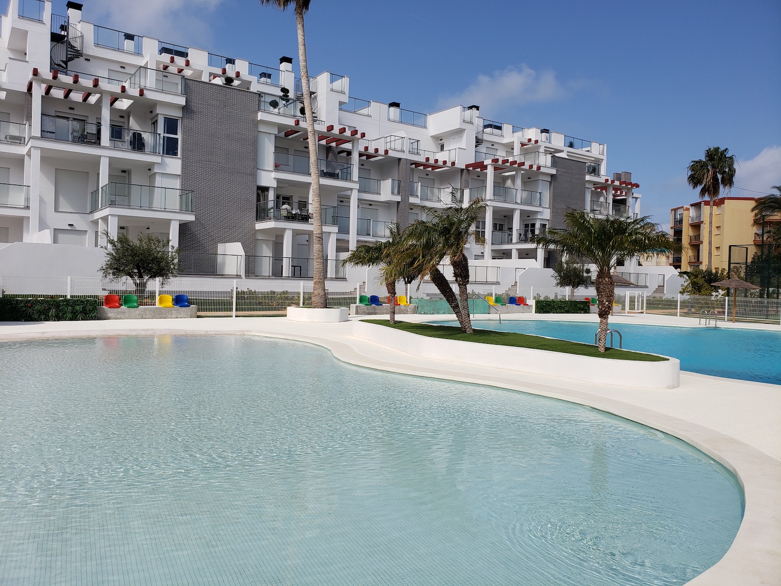 Apartment complex just 5 min. on foot from the sea in Denia with extensive gardens, night lighting of the surroundings, a playground, underground parking communal pool for adults and children.