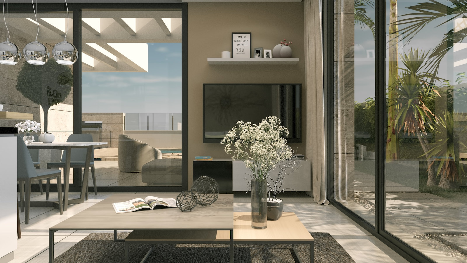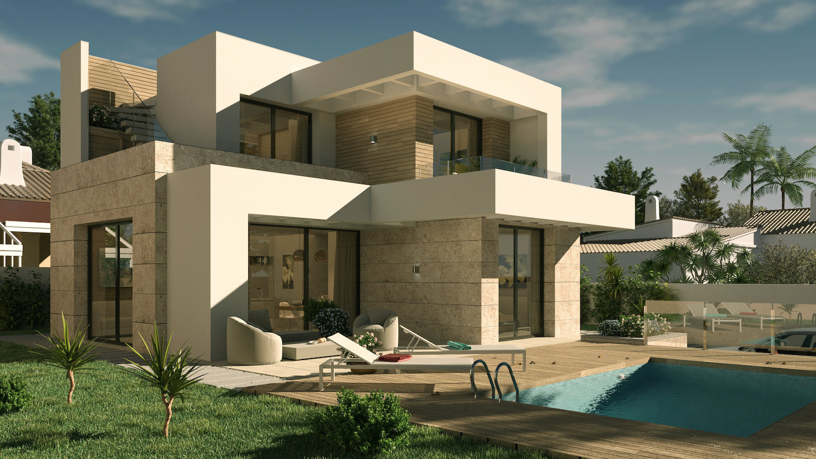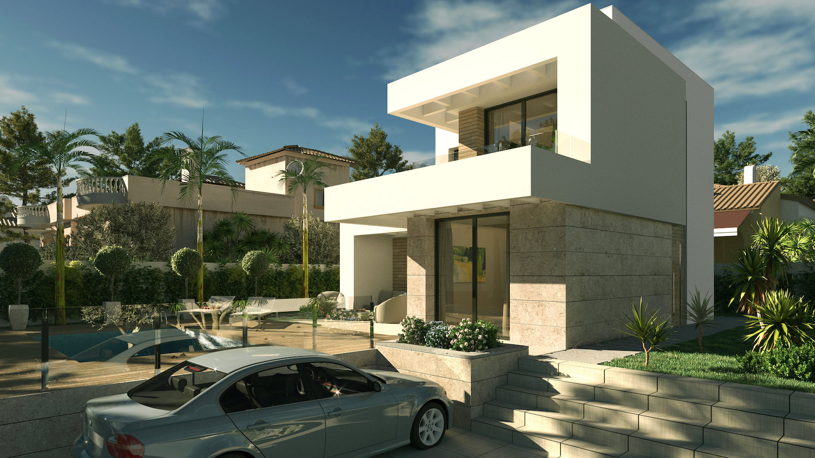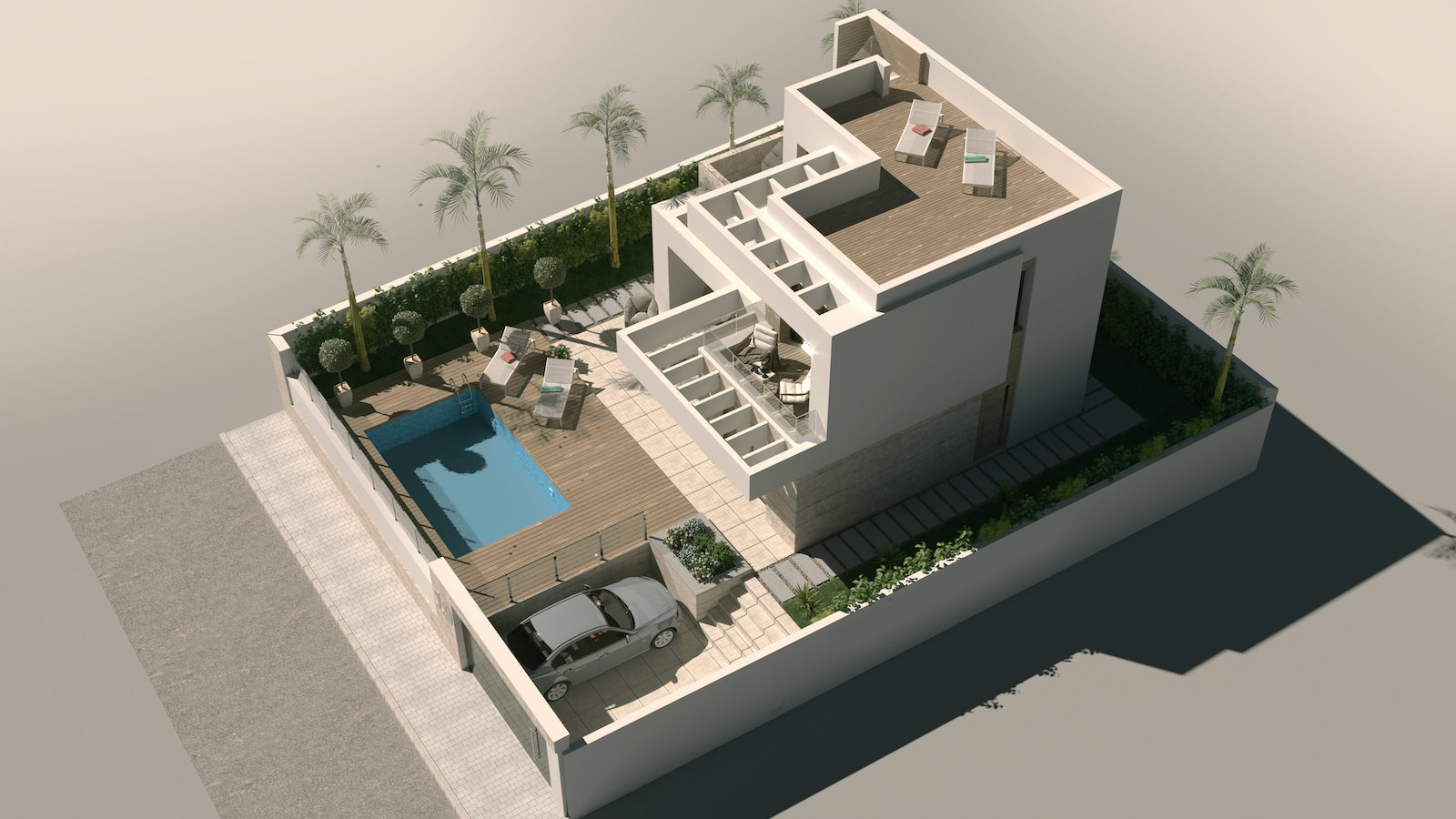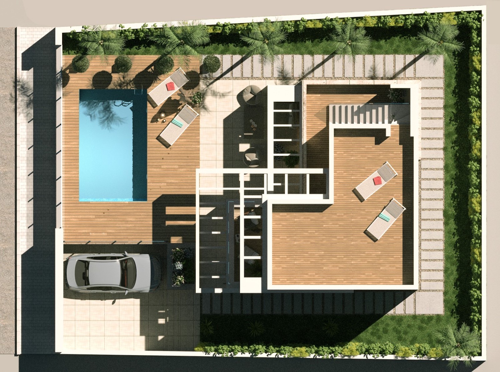 The plot area is 300 m². Villa has a total area of 135,05 m² divided into 3 bedrooms, 3 bathrooms (1 bedroom and 1 bathroom on the ground floor and 2 master bedrooms and 2 bathrooms on the upper floor), living room, open kitchen, and lounge area, as well as a total area of terraces on the street, balconies and a large solarium on the upper floor with beautiful views on the sea, green areas and Laguna de La Mata, more than 50.49 m².