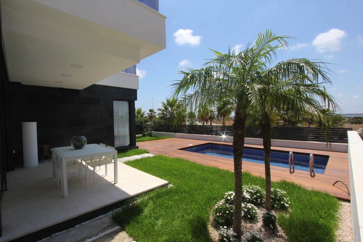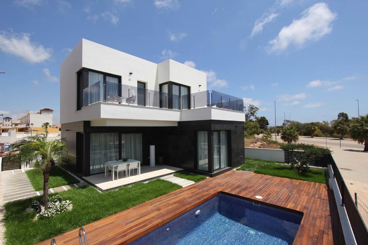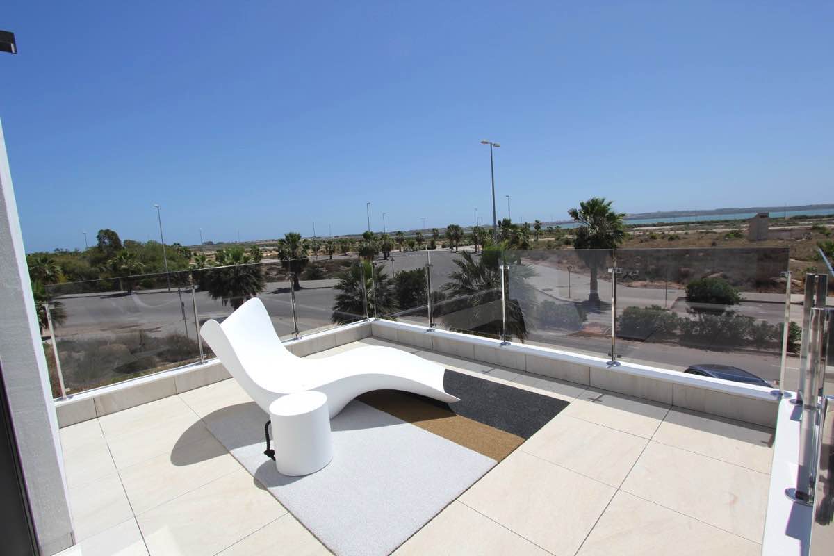 Wonderful modern designer villa distributed over 2 floors as follows; ground floor – large open lounge/dining area with open plan designer kitchen, bedroom with en suite bathroom… upper floor – 2 bedrooms both with en suite bathrooms… The villa has an amazing sun terrace with beautiful views… Only 500m from the Boulevard Shopping Centre in La Zenia and 5 minutes from the beach…Private pool included in the price!!!!