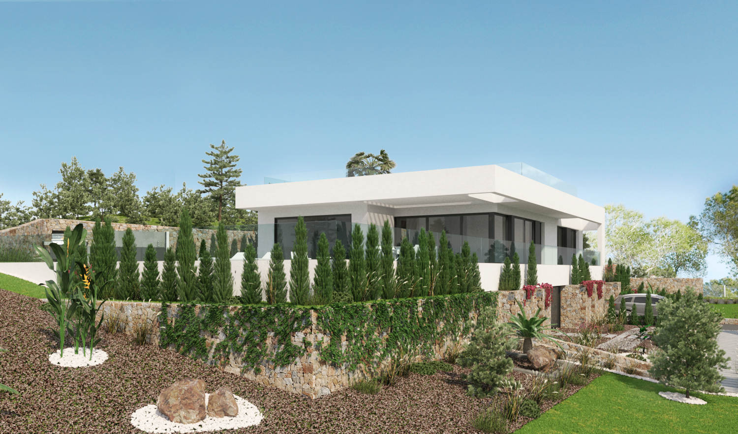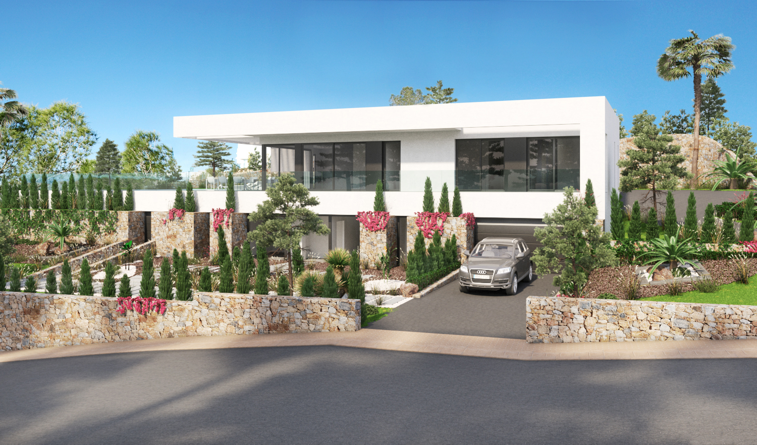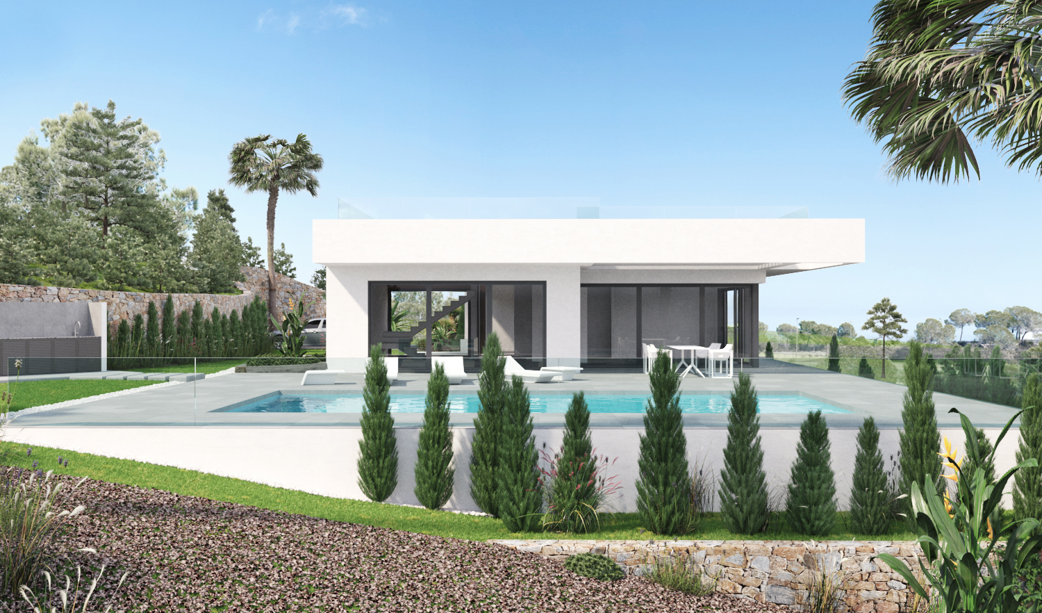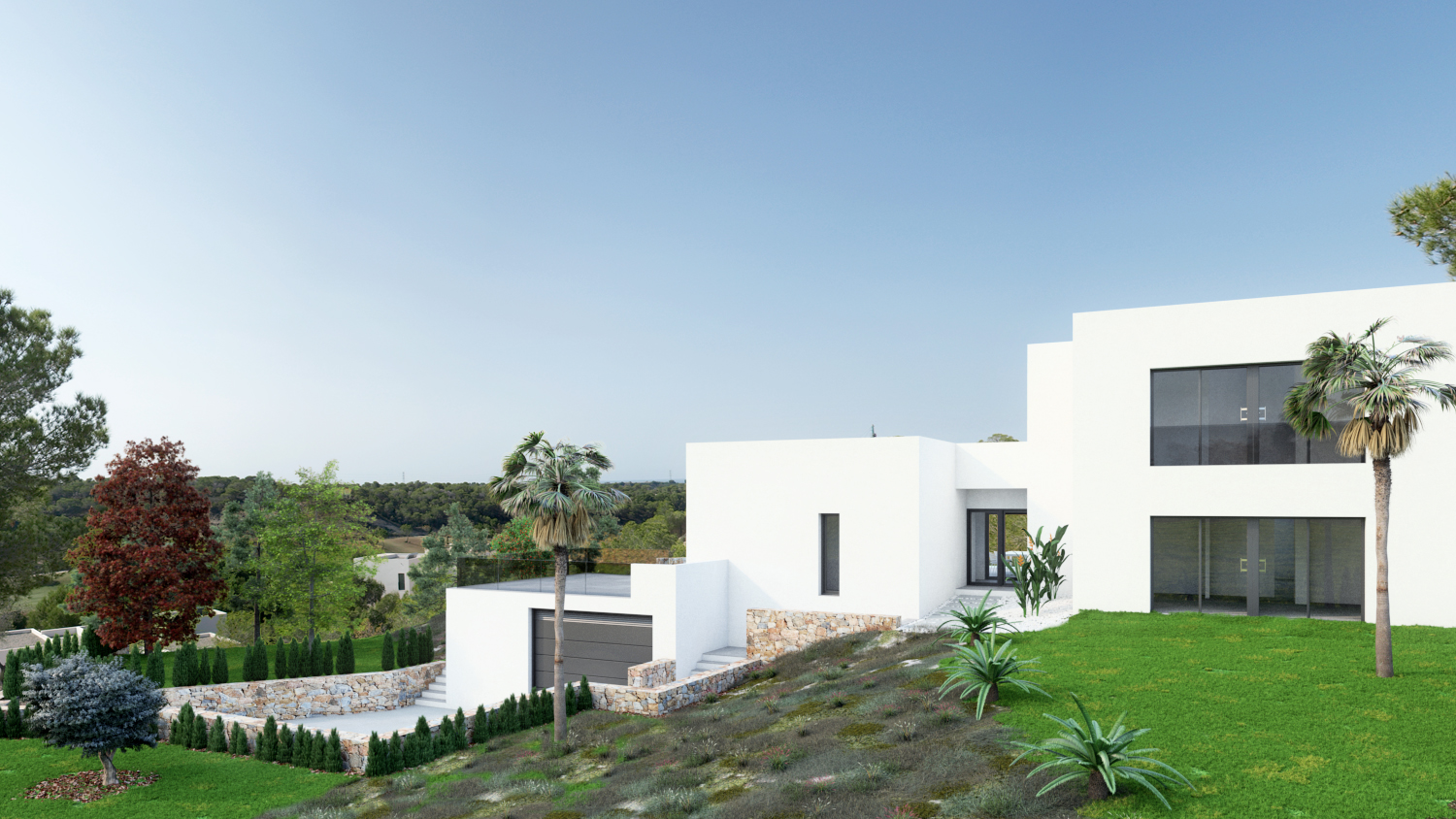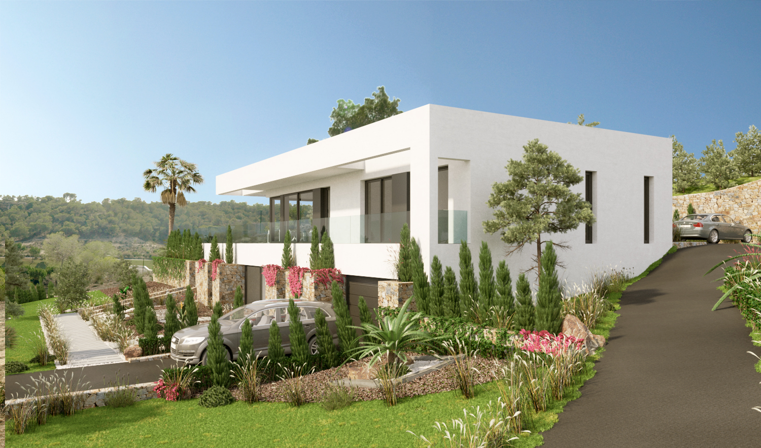 This stunning villa, offering 5 bedrooms and 4 bathrooms, is located on one the highest plots in the center “island” of Las Colinas. The villa has two entrances. Both from the back of the plot. The pedestrian leads you through a lovely spacious area towards the entrance at the ground floor. The wide entrance not only invites you to enjoy the views towards the terrace and pool area, but also separates the kitchen and dining area from the living room and bedrooms.