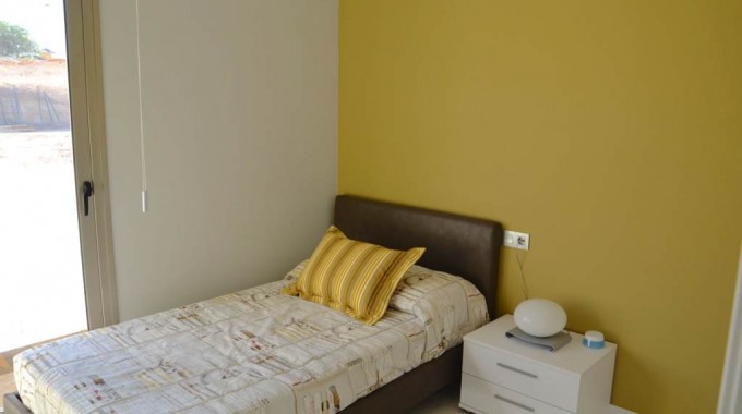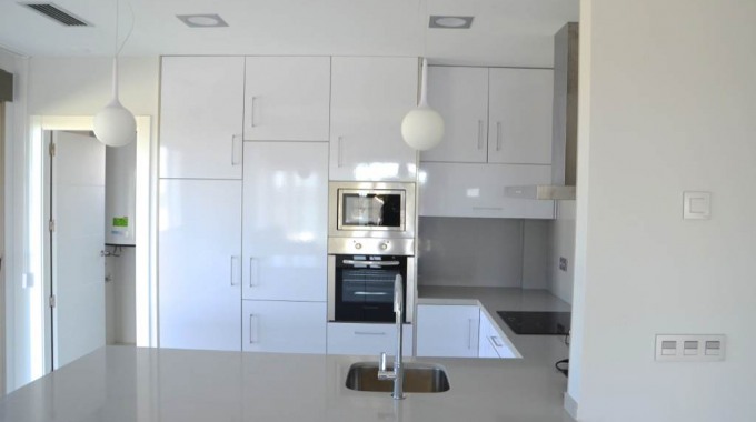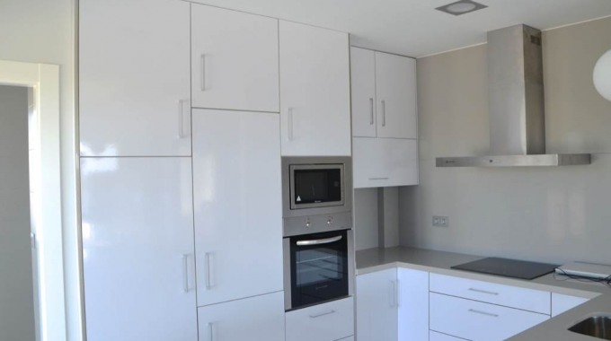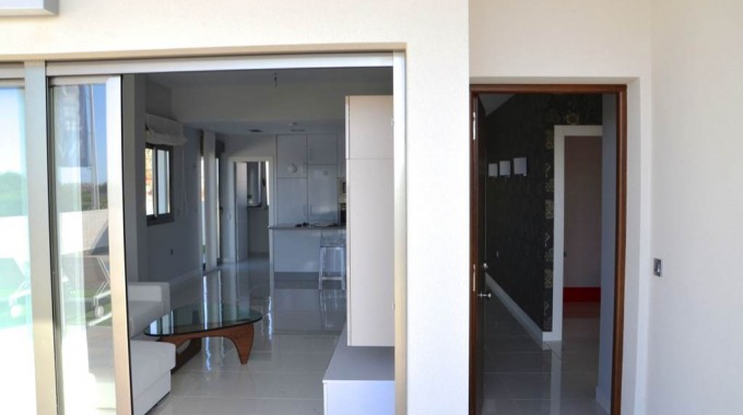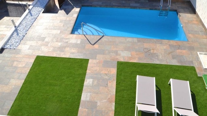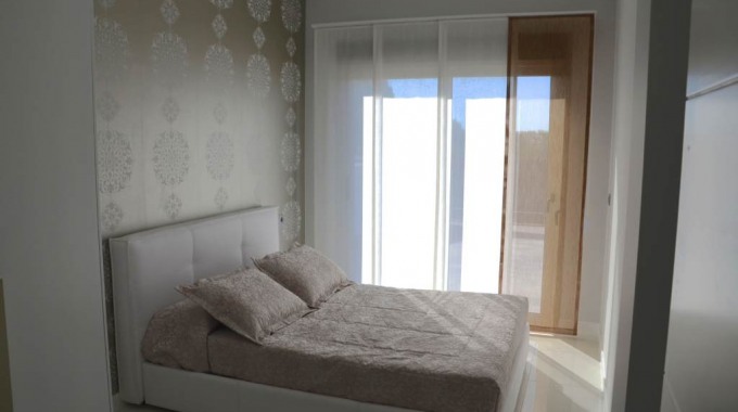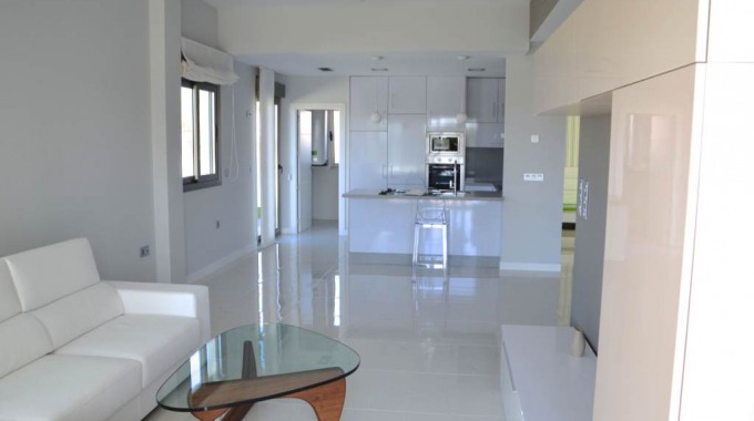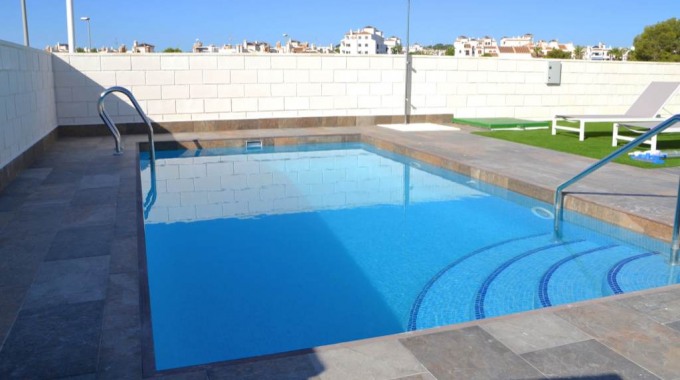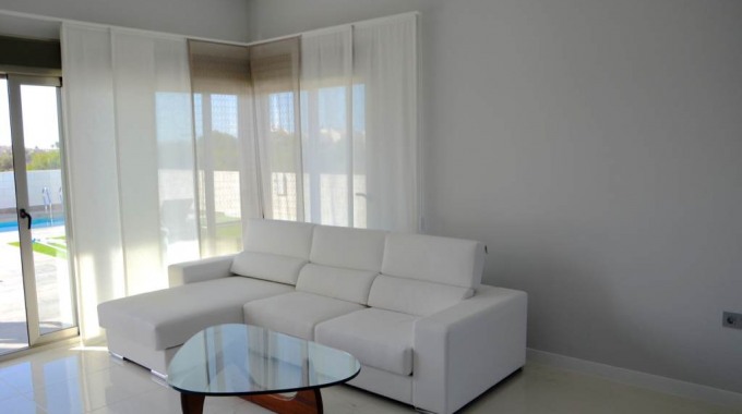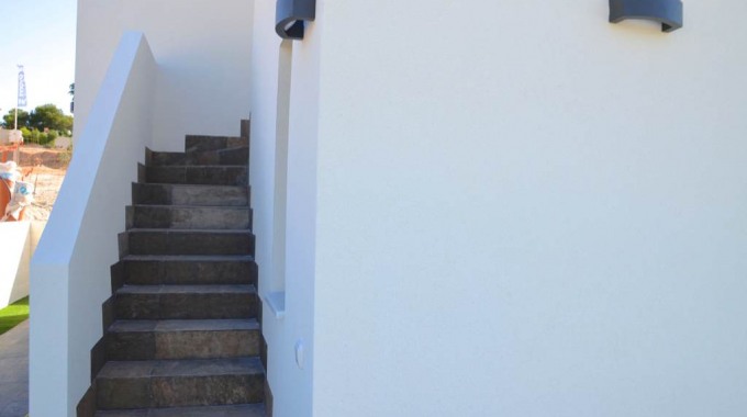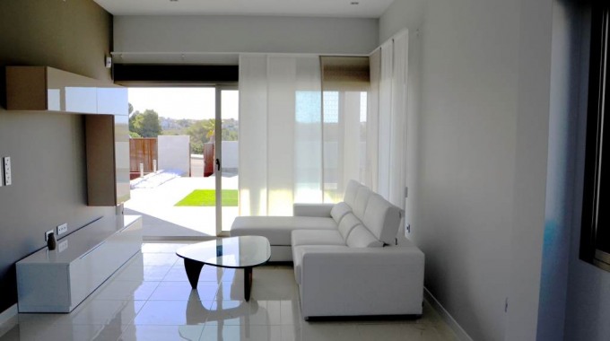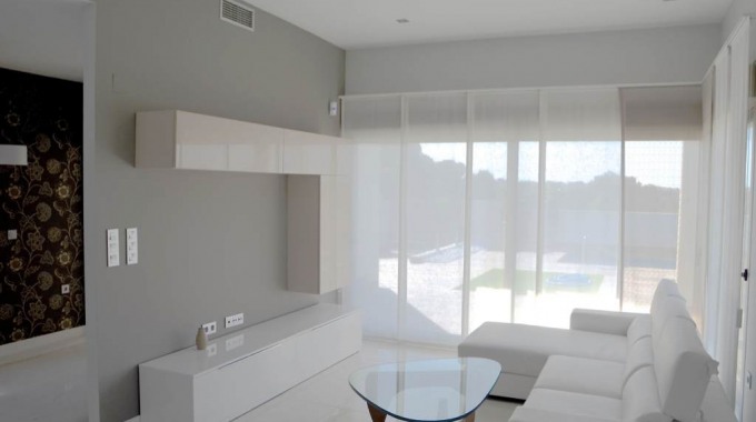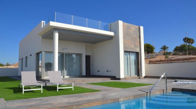 New modern villa located in Pau-8 in Villamartin. The villa in in level, offers 3 double bedrooms and 2 bathrooms. Master bedroom with en-suite bathroom. All wardrobes are finished with shelves. The spacious open kitchen and living room is bright due to the big windows towards the south facing terrace. The kitchen comes fully fitted including Silestone worktop, and prepared for oven in working height. Behind the kitchen you will find a large utility and washing room. All windows have electric blinds. Through out the villa there is pre-installed air condition. The villa has a private 3 x 6 swimming pool included in the price, as well as articial grass through out the garden. From the garden you will find a staircase to the private solarium of 110 m2, from where you are overlooking the area. The solarium has a pre-installation for jaquzzi. During the construction you can choose between different tiles for the floor and bathrooms. The villa is close to Villamartin Plaza and Zenia Boulevard. The nearest beaches are the popular Playa Flamenca, La Zenia Beach and Punta Prima. A very nice modern villa at a competitive price in a popular area.