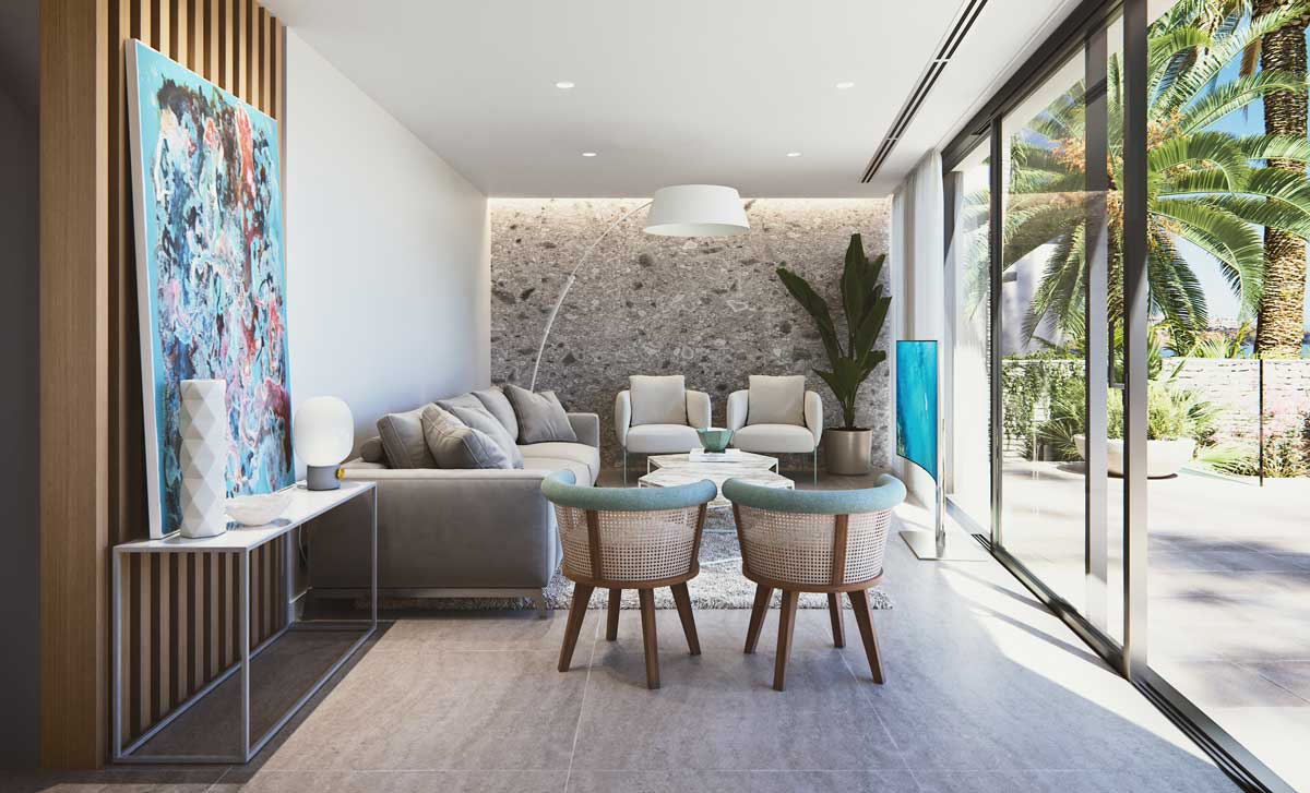 Two bedrooms, with fully furnished bathrooms, one of them en suite. Cozy lounging areas with infinite views of the Mediterranean Sea. Three fully furnished bathrooms and one finished toilet with suspended appliances, washbasins on countertop and taps with thermostat.