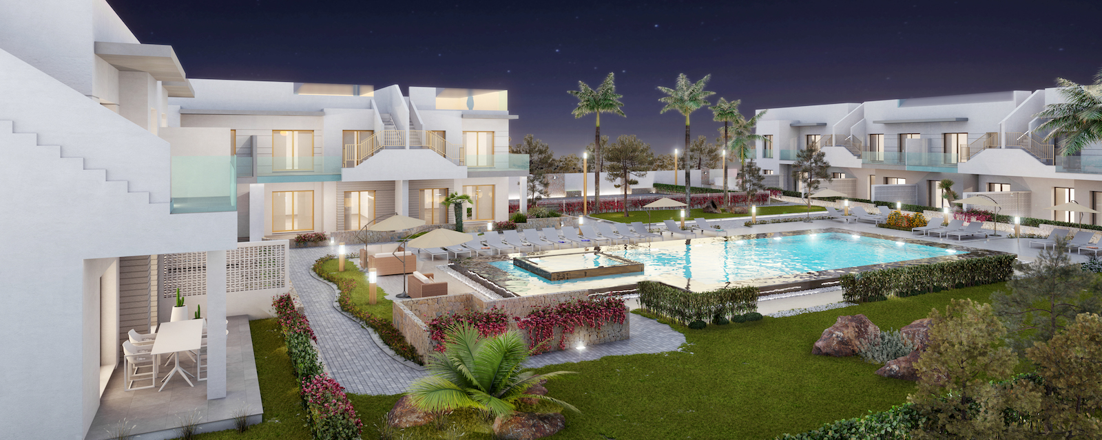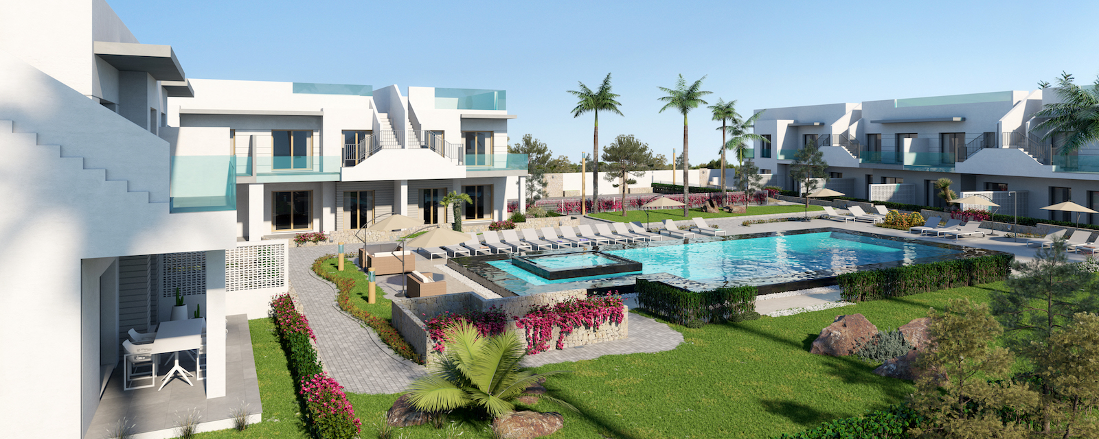Two different types of apartments: Type A ground floors with garden and Type B top floors with private solarium.Impressive pool and communal green area with a storage room for each property.