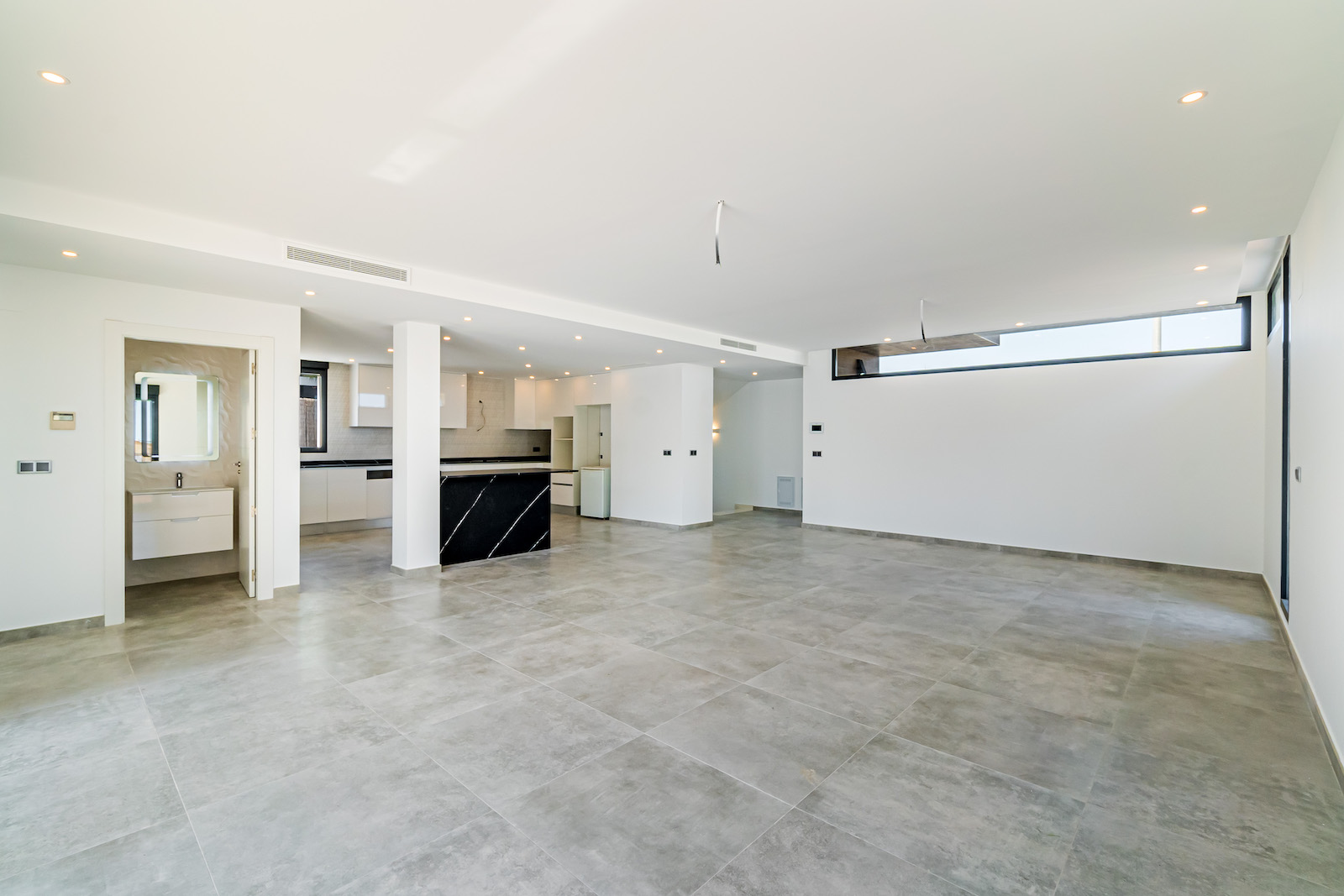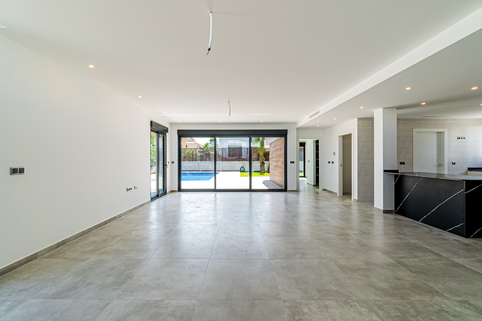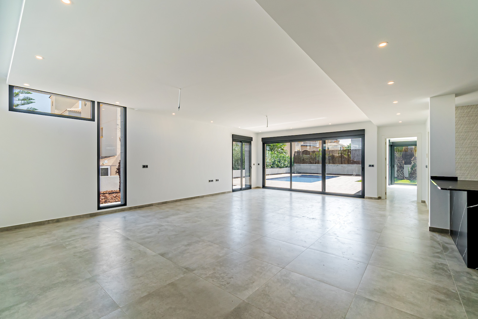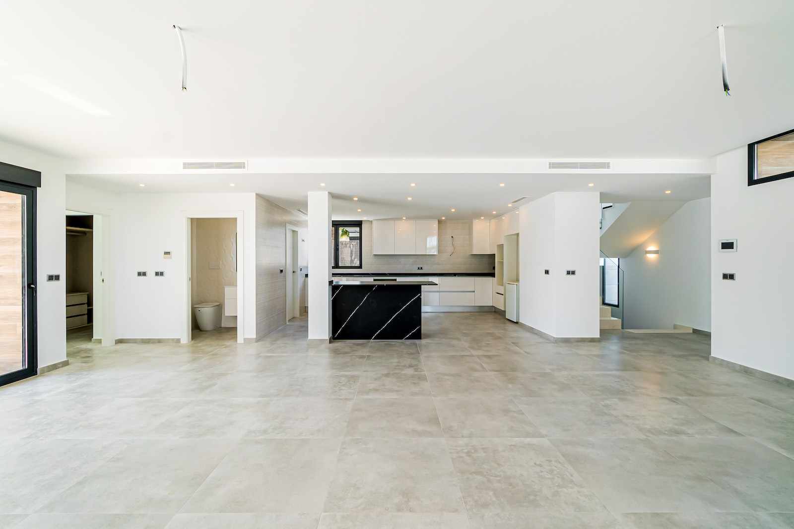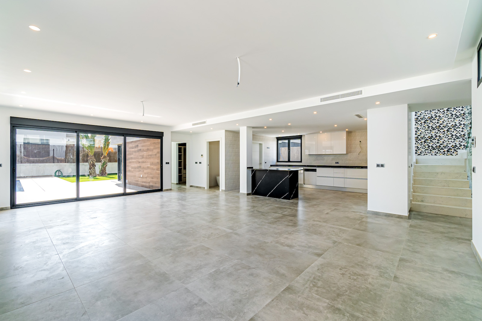GROUND FLOOR: Ultra modern living room with kitchen, 1 toilet, 1 master bedroom with dressing room and on-suite bathroom, all on the same level, with direct access to the garden & Swimming pool area.