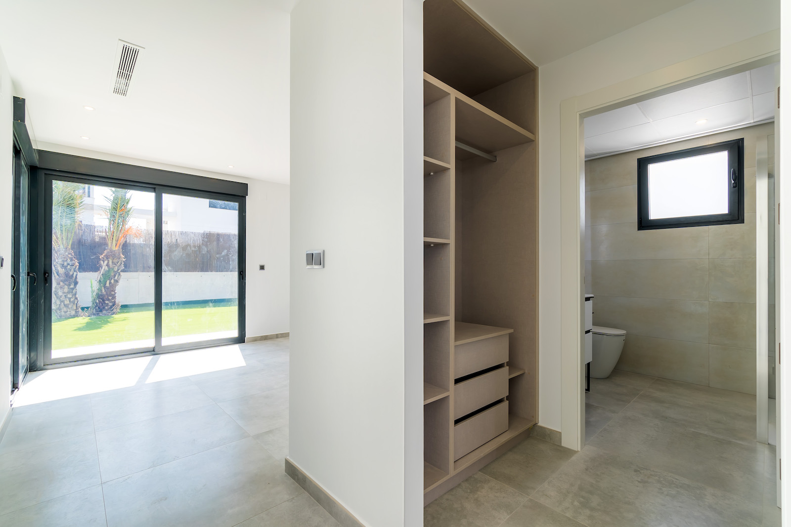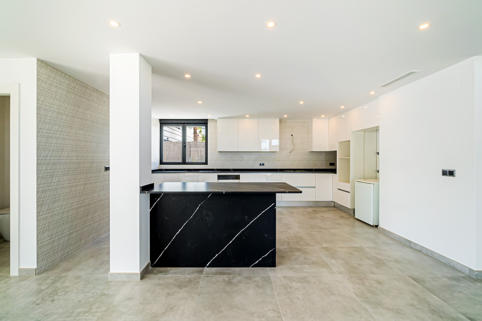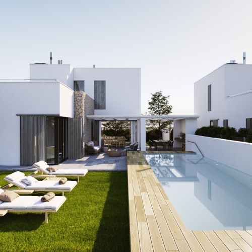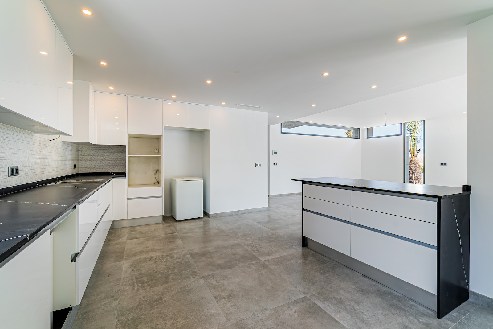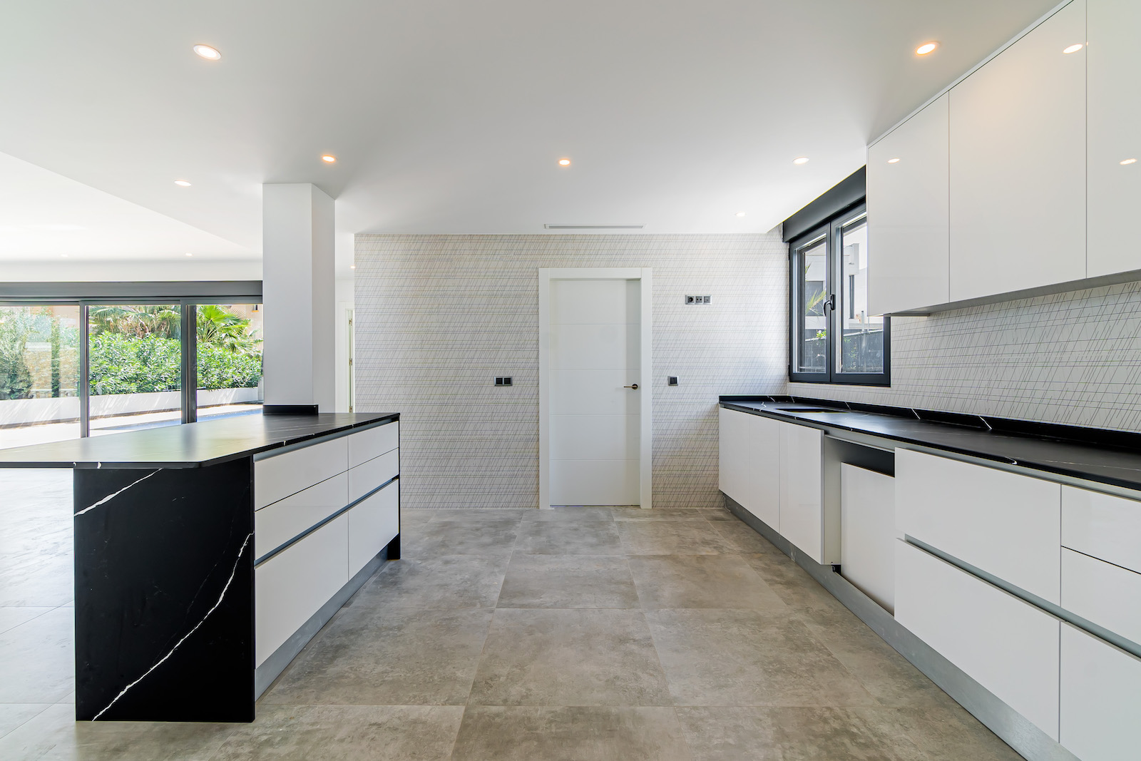 GROUND FLOOR: Ultra modern living room with kitchen, 1 toilet, 1 master bedroom with dressing room and on-suite bathroom, all on the same level, with direct access to the garden & Swimming pool area.