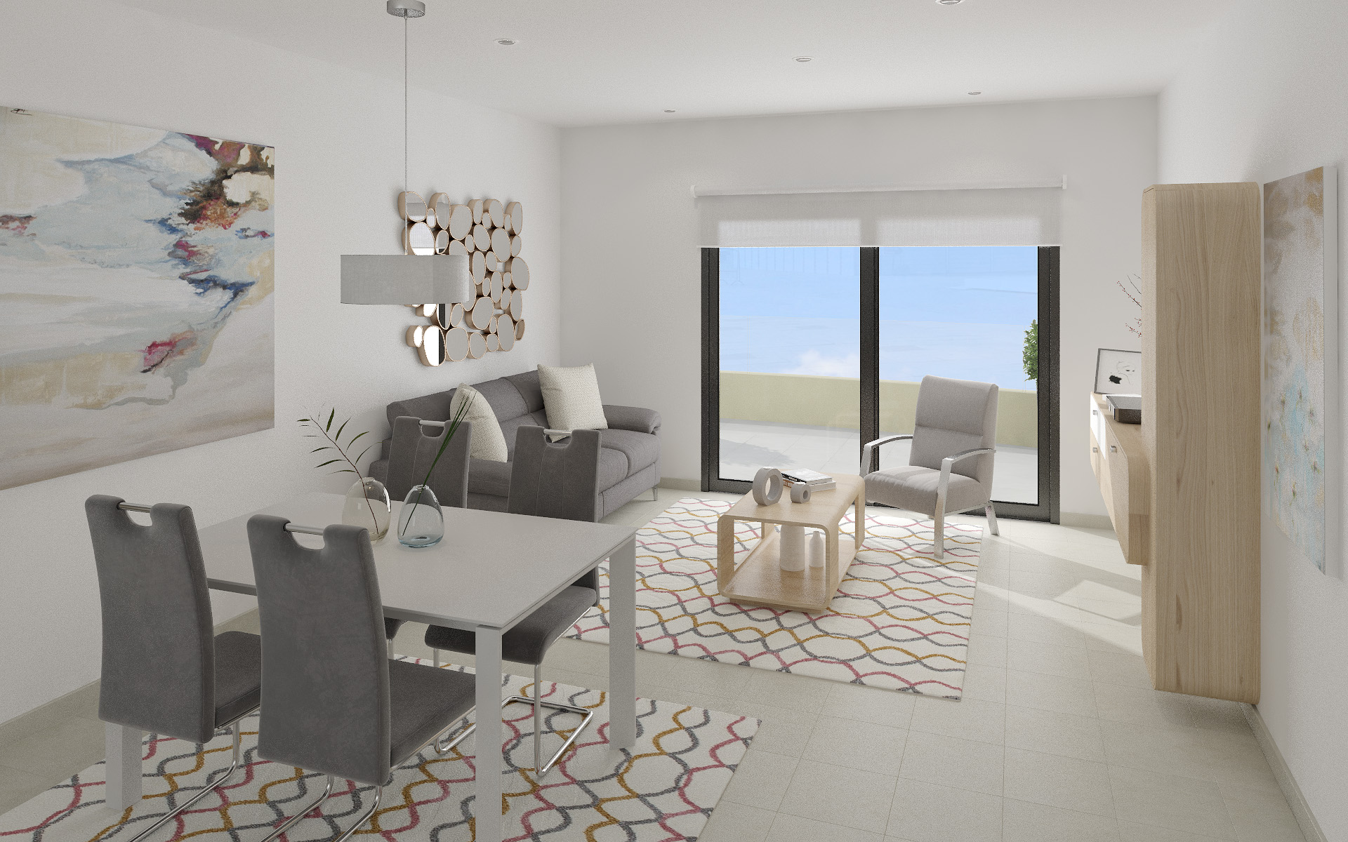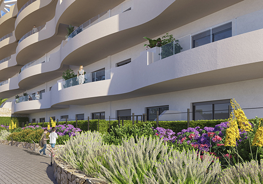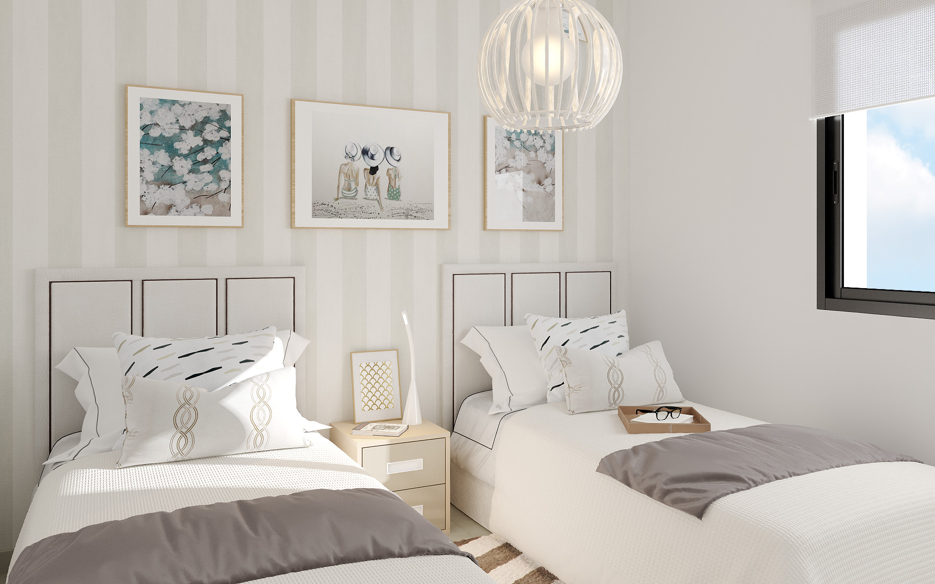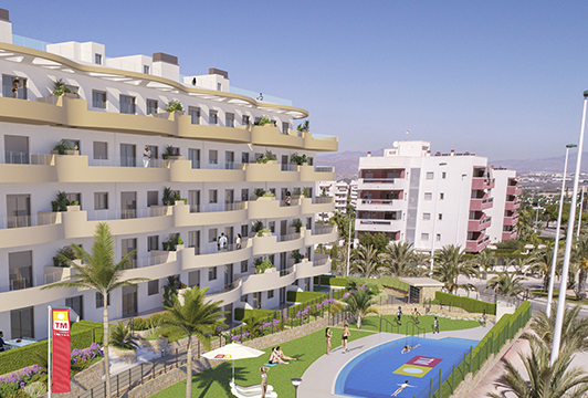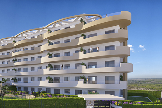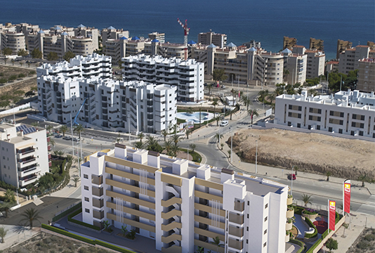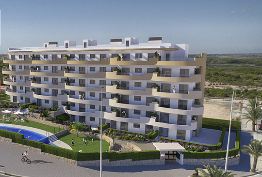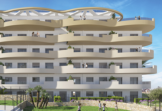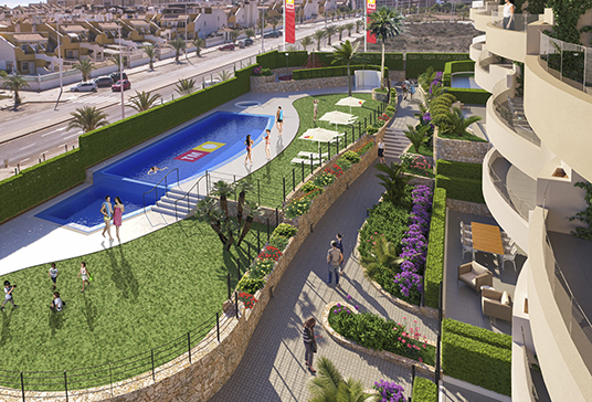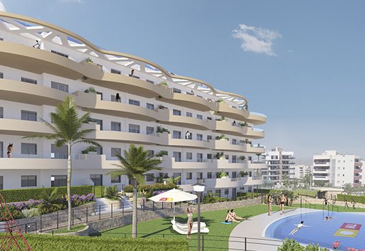 This is a new residential complex just a few minutes’ walk from the beach and a few minutes away from Alicante Airport. The extensive terraces of the apartments looks out onto landscaped gardens, swimming pools, jacuzzis and a poolside terrace with grass lawns and trees. The kids will have a blast in their own pool and play area, complete with swings, slides and seesaw, all within the secured perimeter of the complex. Enjoy the freedom to sunbathe for however long you want with complete peace of mind. There are also parking lots for bicycles, as well as storage rooms to keep your belongings, creating more space in your home.