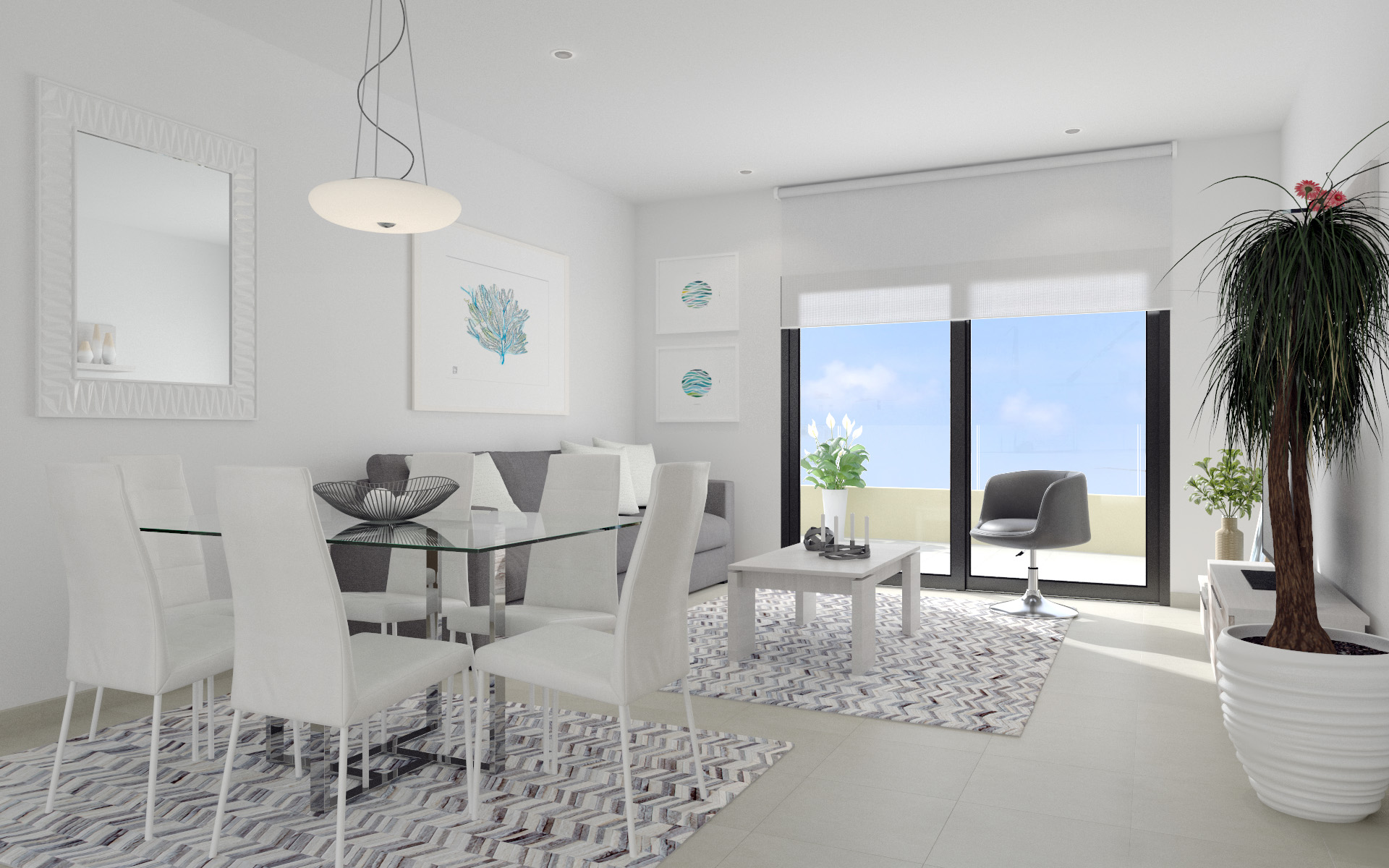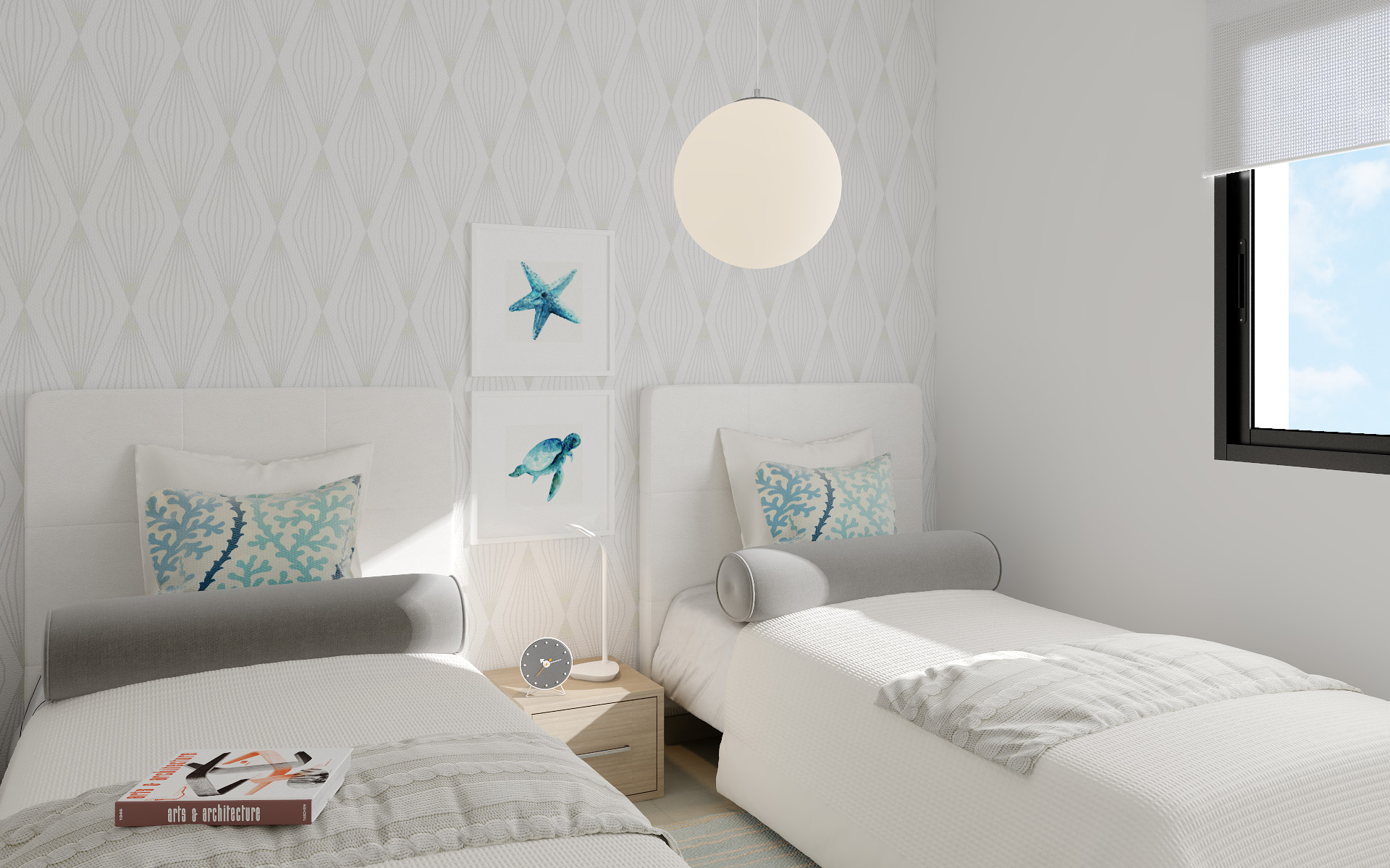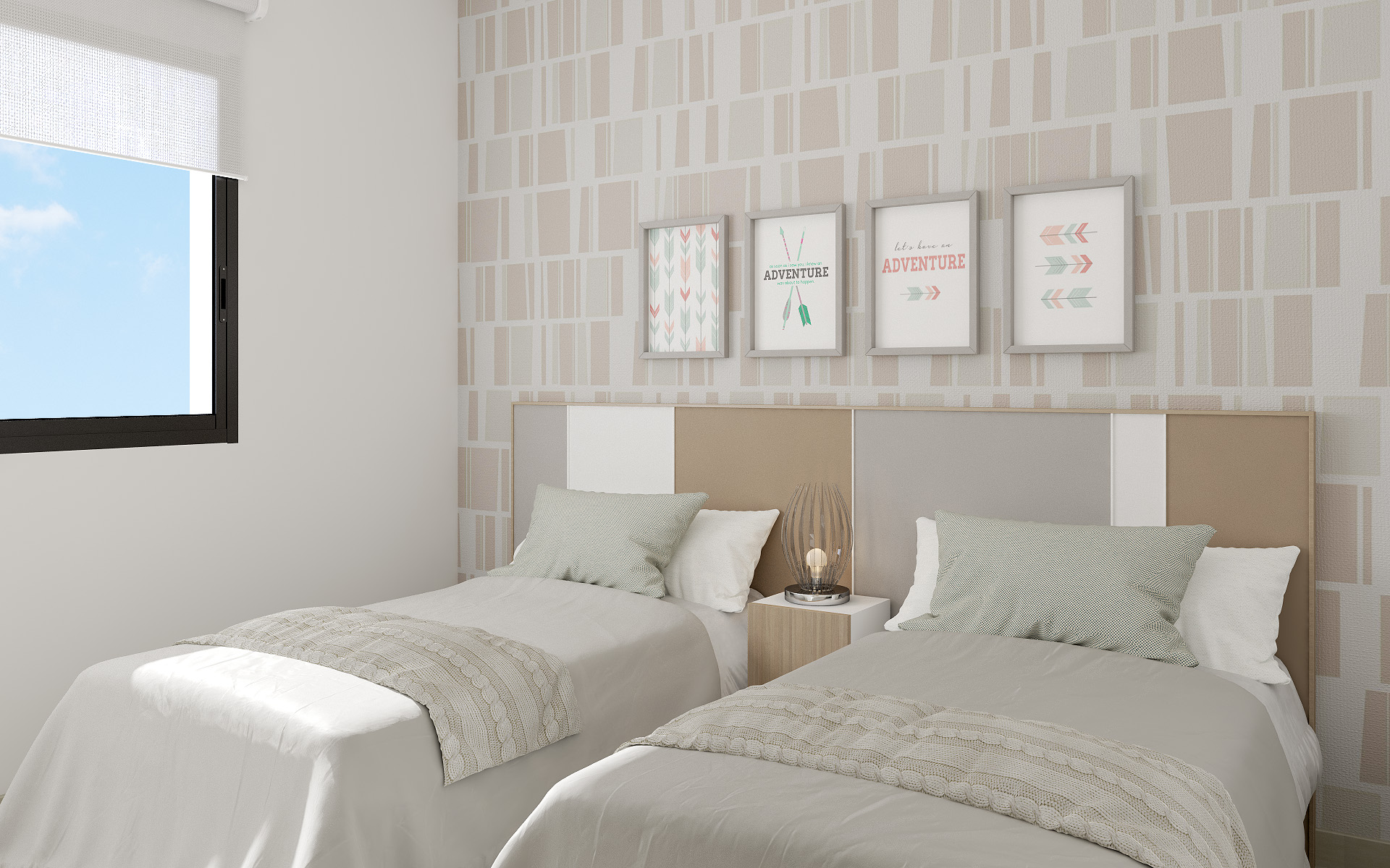 This is a new residential complex just a few minutes’ walk from the beach and a few minutes away from Alicante Airport. The extensive terraces of the apartments looks out onto landscaped gardens, swimming pools, jacuzzis and a poolside terrace with grass lawns and trees. The kids will have a blast in their own pool and play area, complete with swings, slides and seesaw, all within the secured perimeter of the complex. Enjoy the freedom to sunbathe for however long you want with complete peace of mind. There are also parking lots for bicycles, as well as storage rooms to keep your belongings, creating more space in your home.