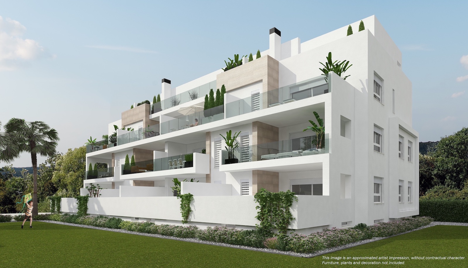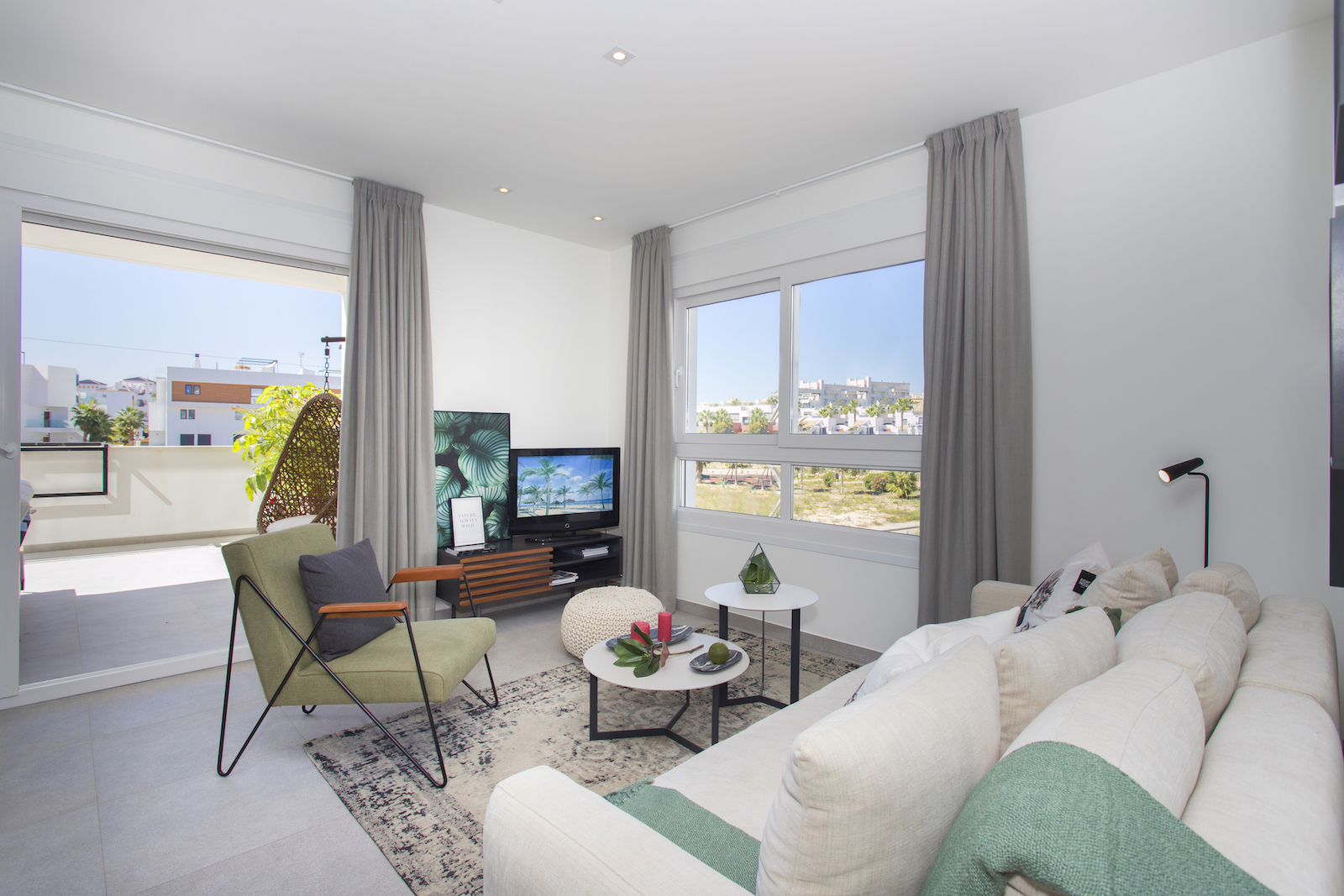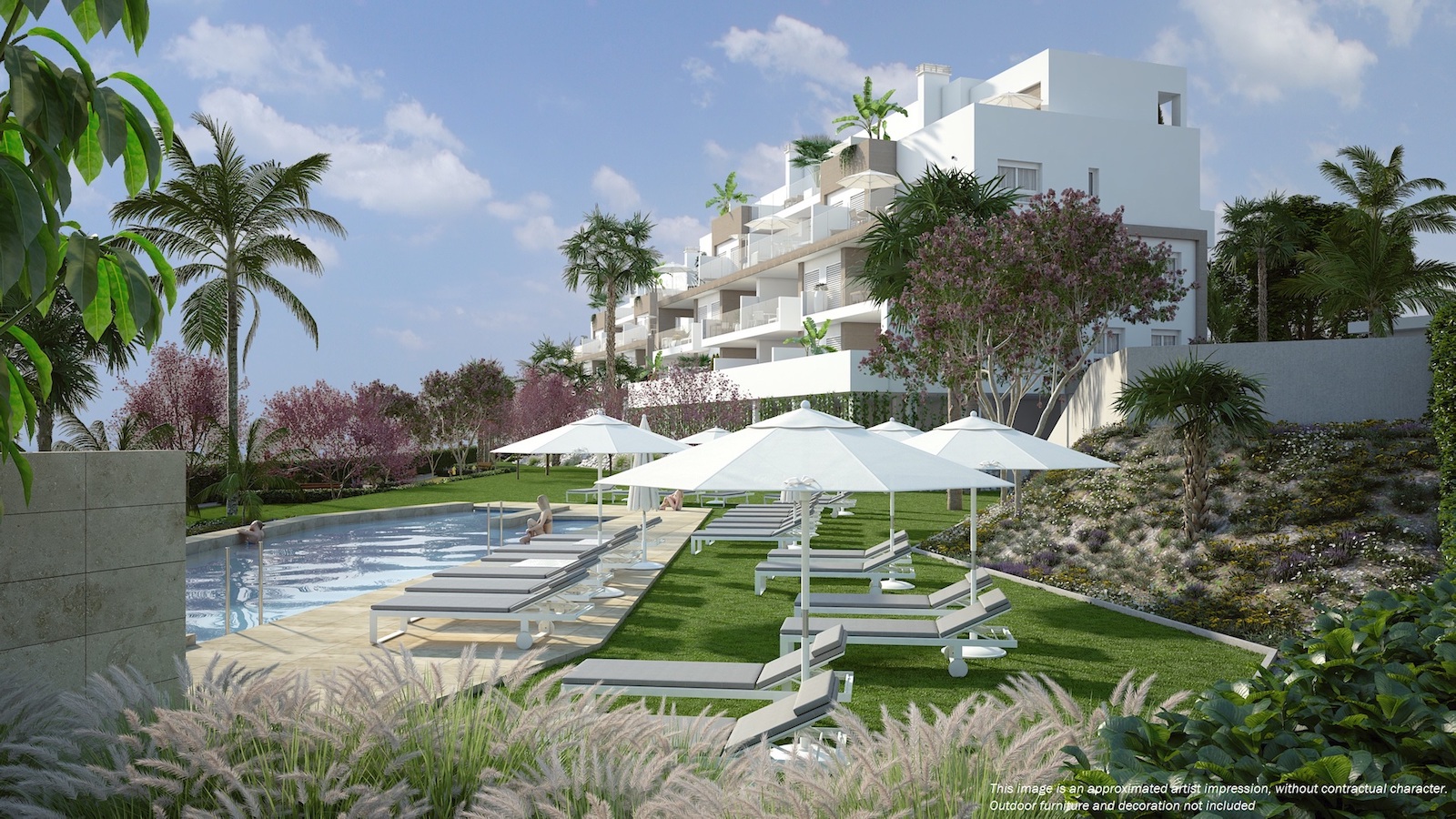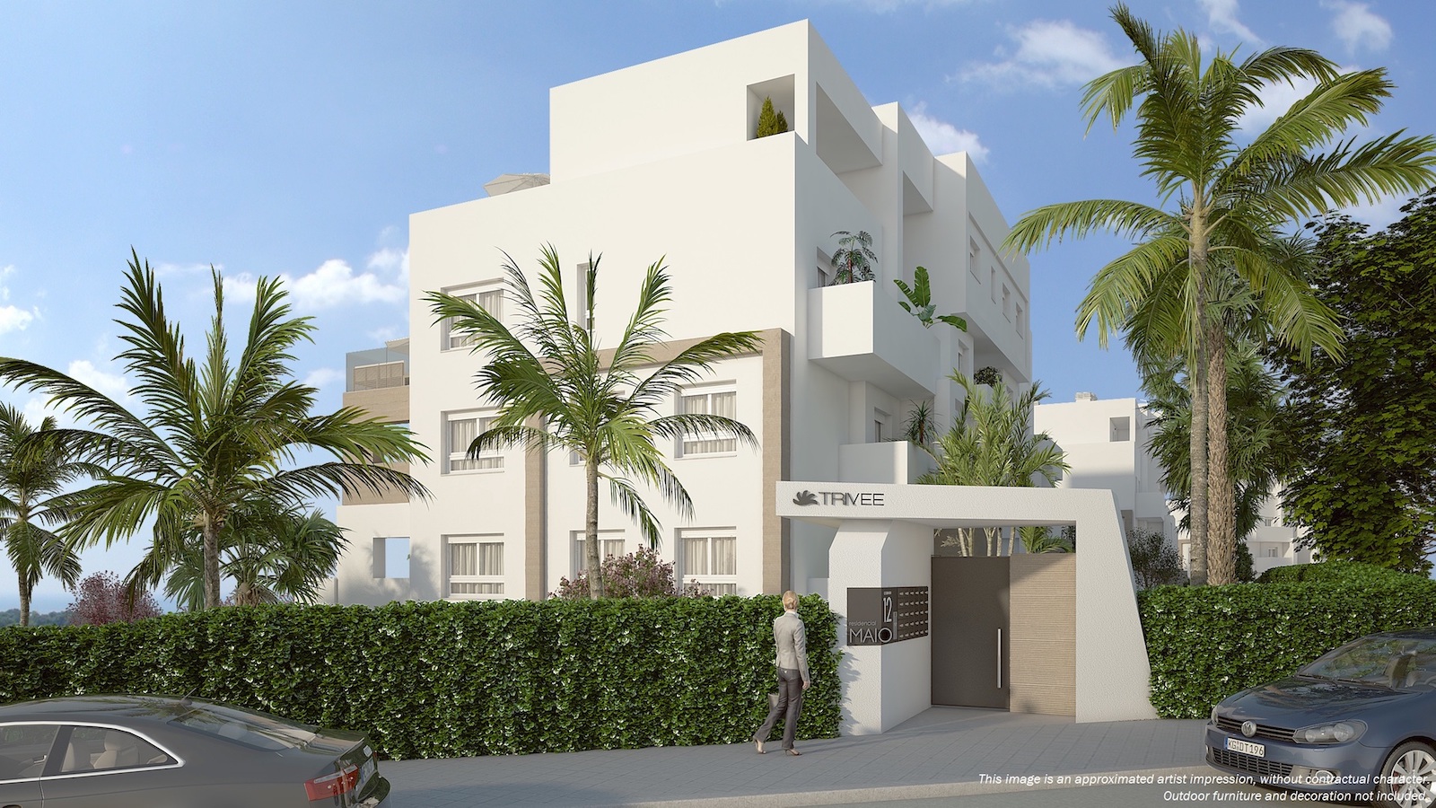 2 and 3 bed Maio Apartments in Villamartin This new development with 3 blocks of apartments is built in one of the most popular areas of Villamartin. The first block of 4 floors is now on sale. It is composed by 13 modern apartments with 2 or 3 bedrooms with a living area varying from 68 to 102 m2. They all offer large terraces from 20 to 66m2, high quality finish and spacious communal green areas with swimming pool. The building also offers two exclusive duplex penthouse apartments divided over two floors and with private roof terraces of 44m2, offering nice views of the surrounding area. You have the possibility to buy an underground parking space and storage room. This project is surrounded by three golf courses, within short walking distance to La Fuente commercial center and only a short drive from the amazing beaches of Orihuela Costa.