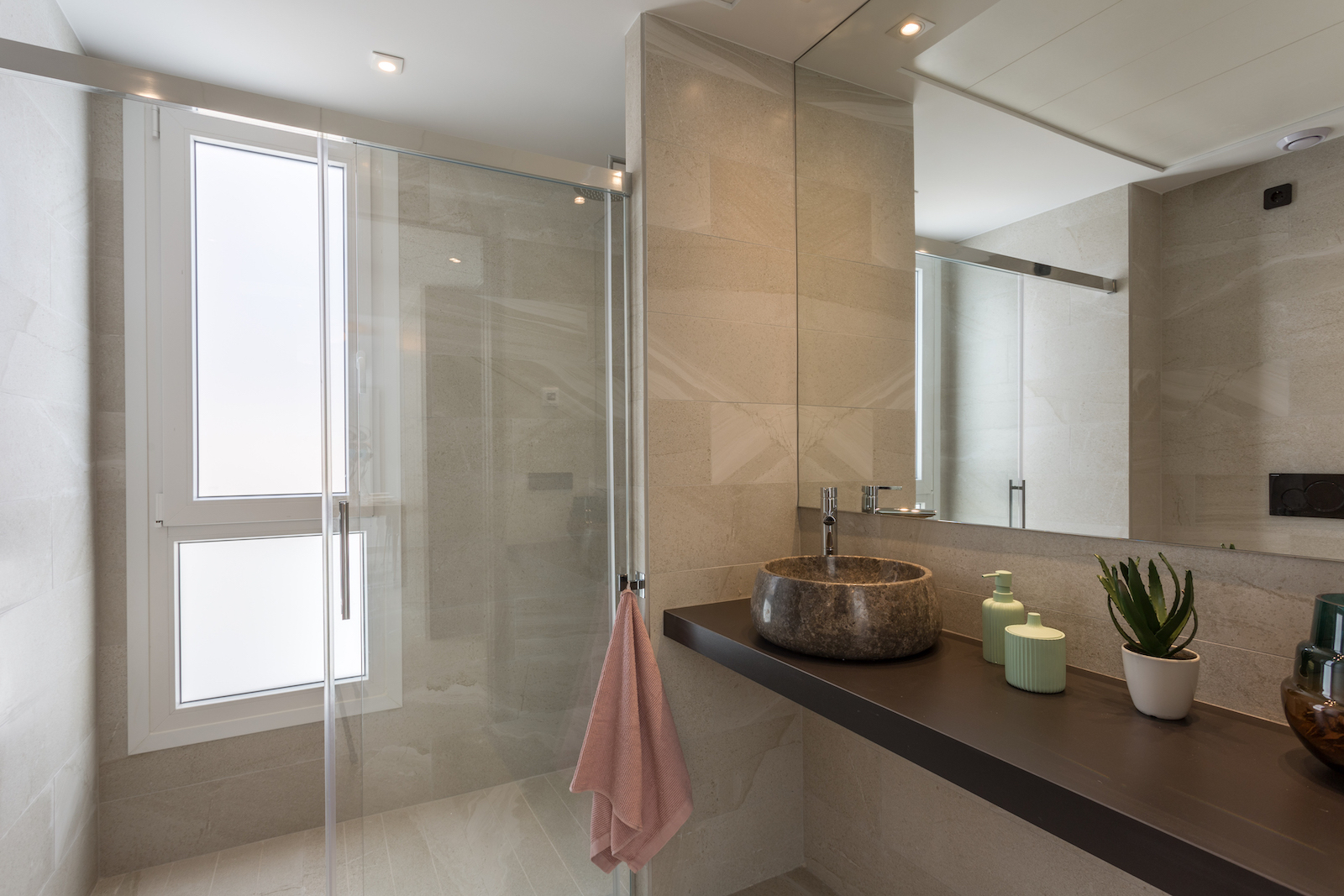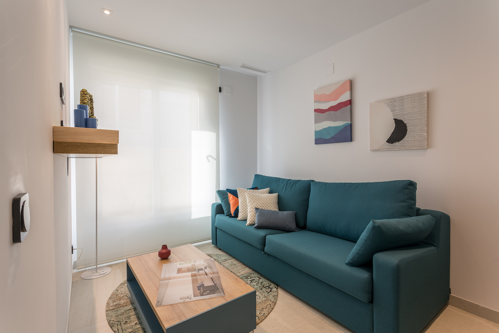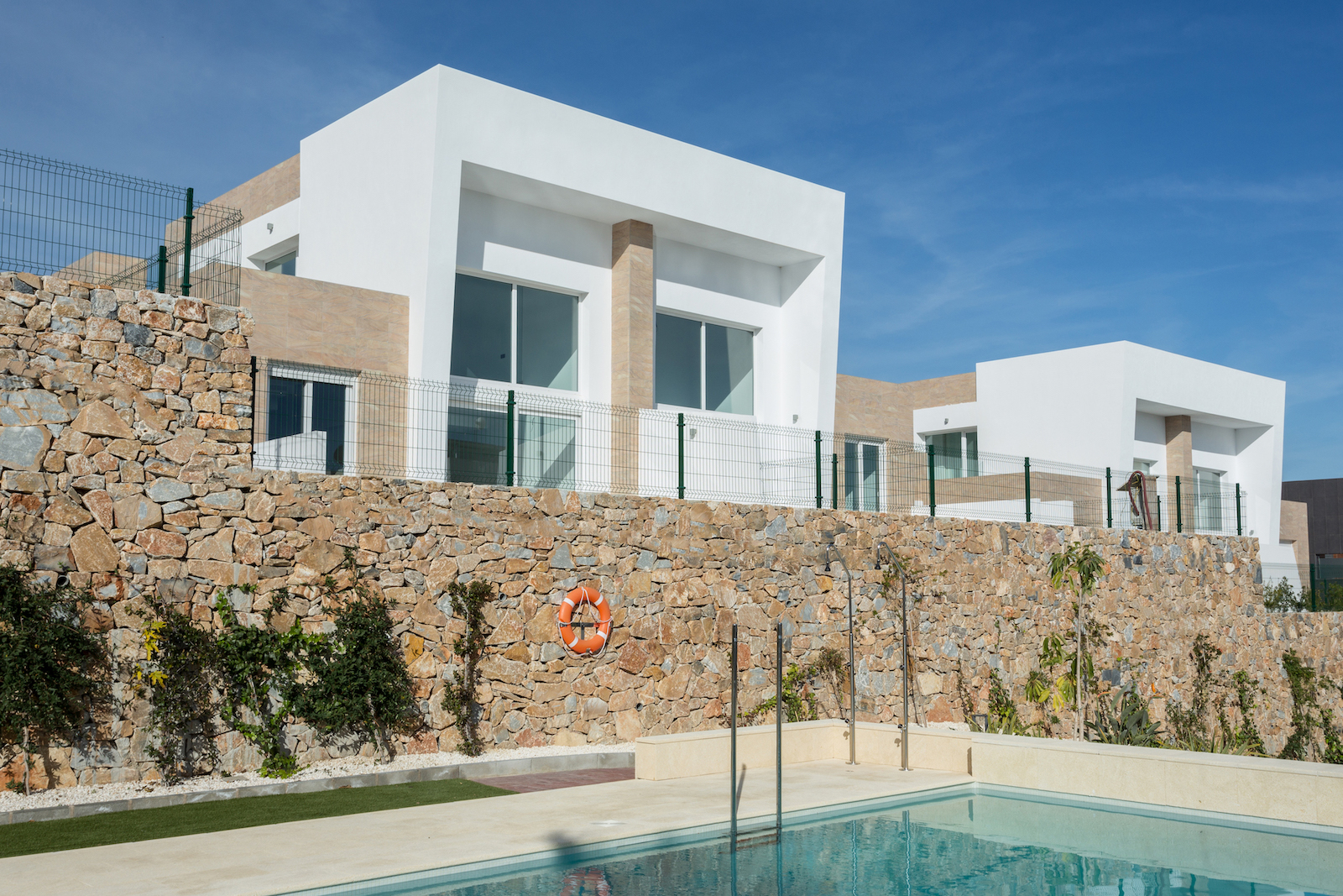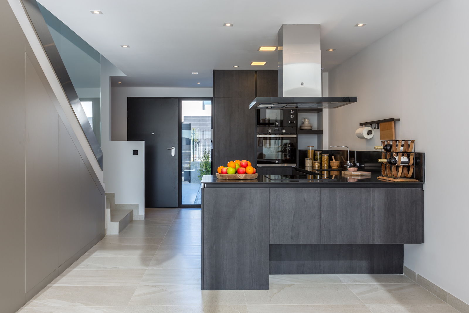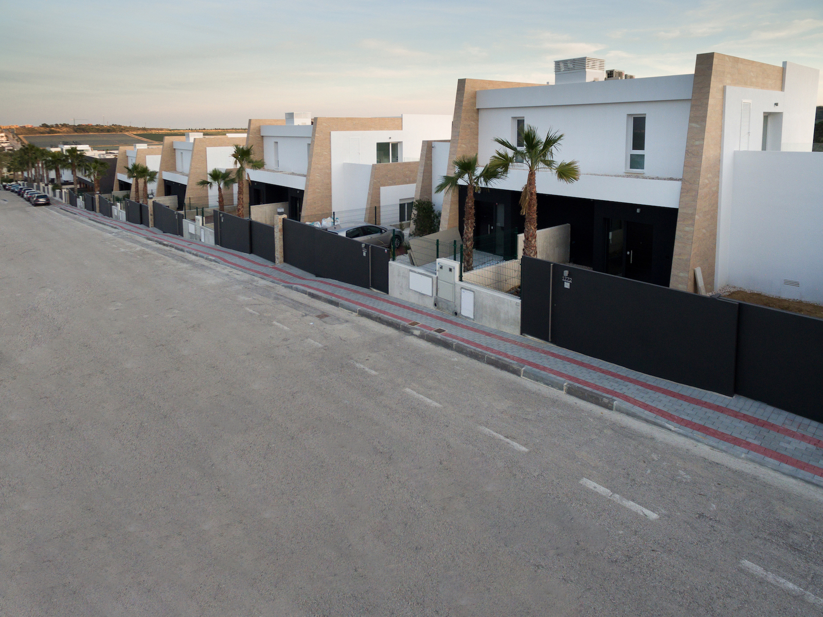 On La Finca Golf you will find this beautiful modern Eua semi-detached villa. The villa offers 3 double bedrooms and 2 bathrooms. Master bedroom with en-suite bathroom. The architecture is modern contemporary style on the exterior, with the interior made with first class materials. The high ceiling windows and big windows towards the terrace gives the spacious living room and open kitchen lots of natural light. The villa has a private parking space. The south facing terrace gives you sun from dusk till dawn. The villa comes with floor heating in the bathrooms, installed A/C system by conducts and whitegoods. The communal swimming pool is located just behind the villa, with a private entrance. La Finca Golf offers one of the most popular 18 hole golf courses on the Costa Blanca, in nice surroundings and breathtaking views towards the surrounding mountains. Apart from the golf course, you will also find a 5-star hotel, with SPA facilities and different restaurants.
