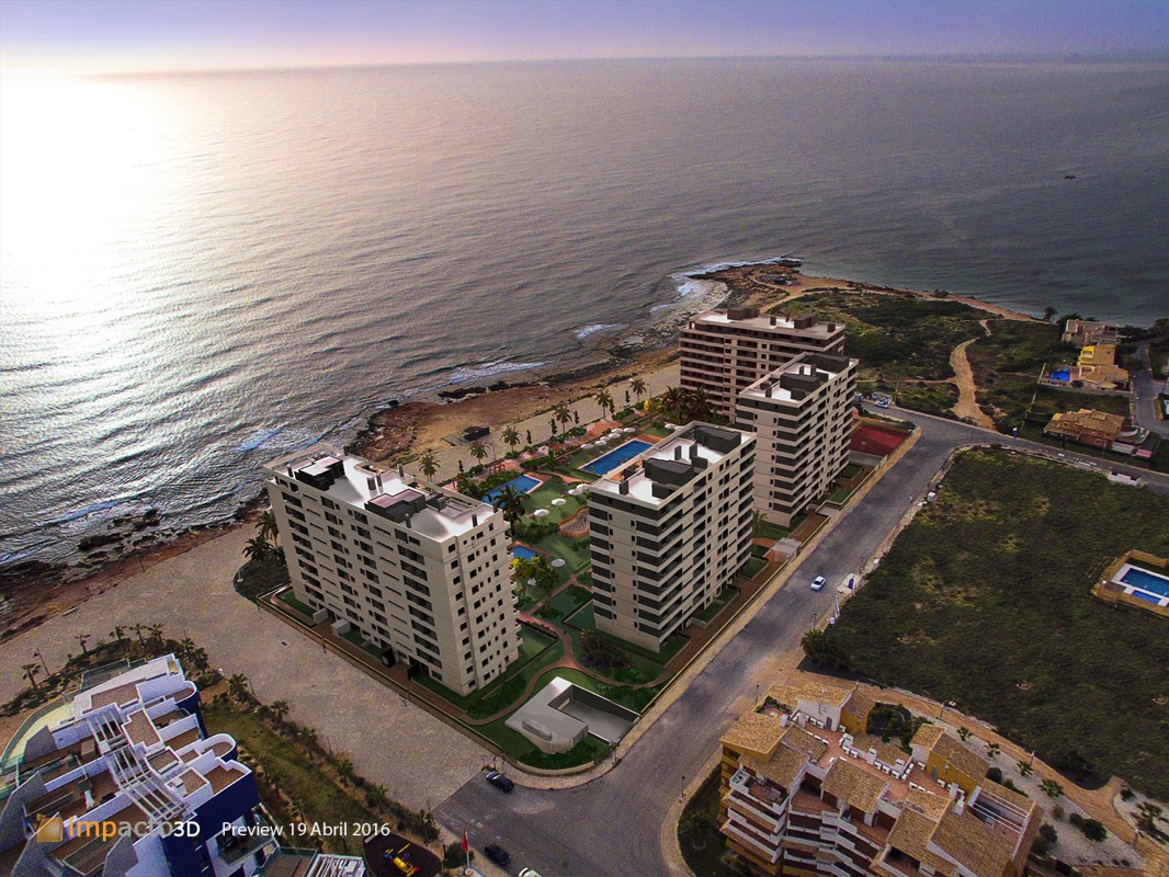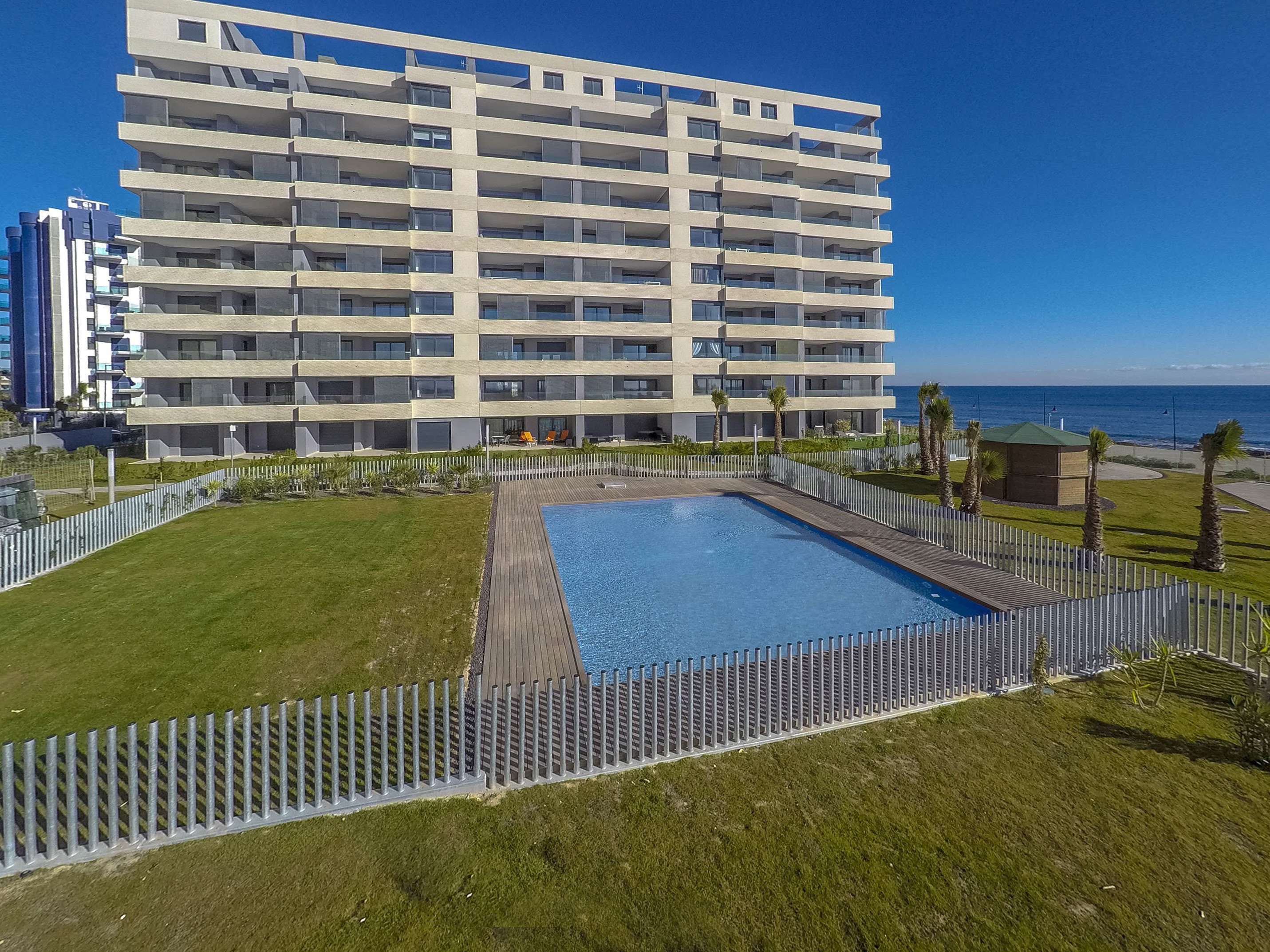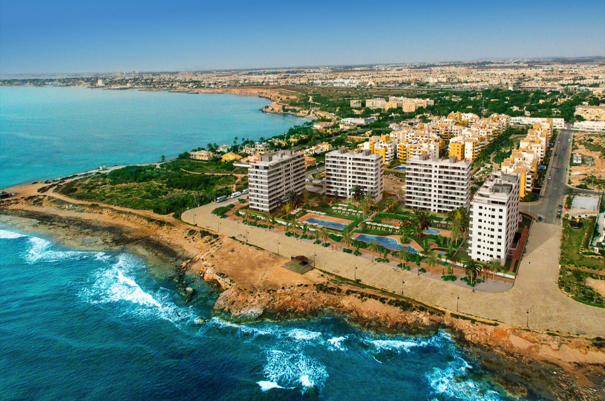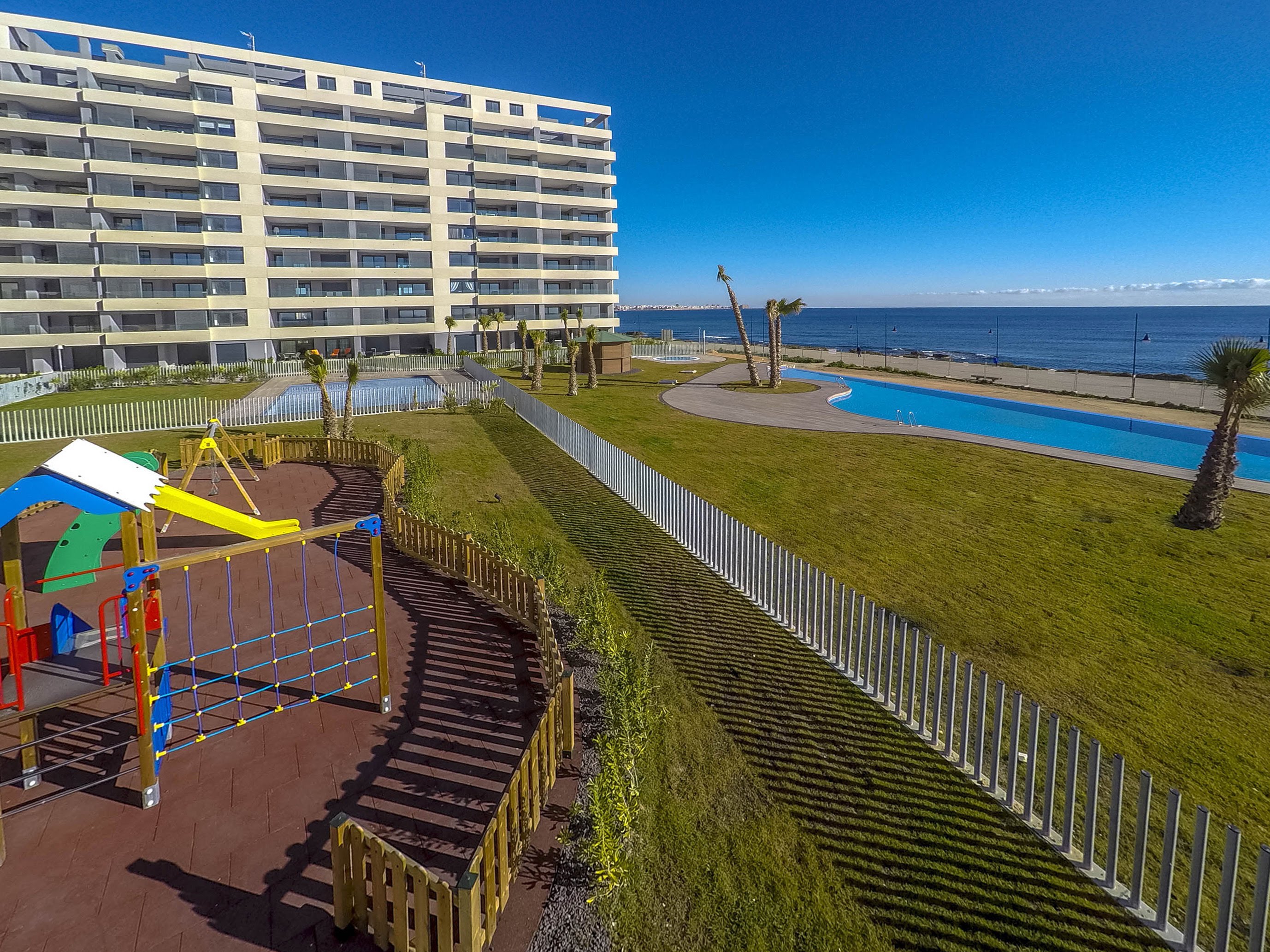 Panorama Mar is a sea front apartment development in Punta Prima, Torrevieja, with spectacular views over the sea and the beach. The residential complex offers 2 and 3 bedroom apartments with 2 bathrooms. All apartments in the first phase are south facing and have good sized terraces and magnificent views over the Mediterranean Sea. The apartments have been designed for comfort and convenience, with excellent qualities and a layout that allows maximum enjoyment of the communal areas of the complex. All units are delivered with an underground parking space and storeroom. Panorama Mar, is a private gated community with closed circuit surveillance. The complex stands out for its ample landscaped areas and complete installations, from which you will be able to enjoy the sun and the sea views; the communal areas boast 3 swimming pools, with one being an infinity pool and a Jacuzzi. The children will be able to play their own paddling pool and playground. The complex also has direct access to the promenade. Punta Prima is only 5 km from Torrevieja and is distinguished by its good communication and health infrastructures, proximity to the Alicante airport and the amount of services available all year round. Only 10 km away we can find the Villamartín, Campoamor, Las Ramblas, Las Colinas and Lo Romero 18-hole golf courses, as well as the La Zenia and Habaneras commercial centres.