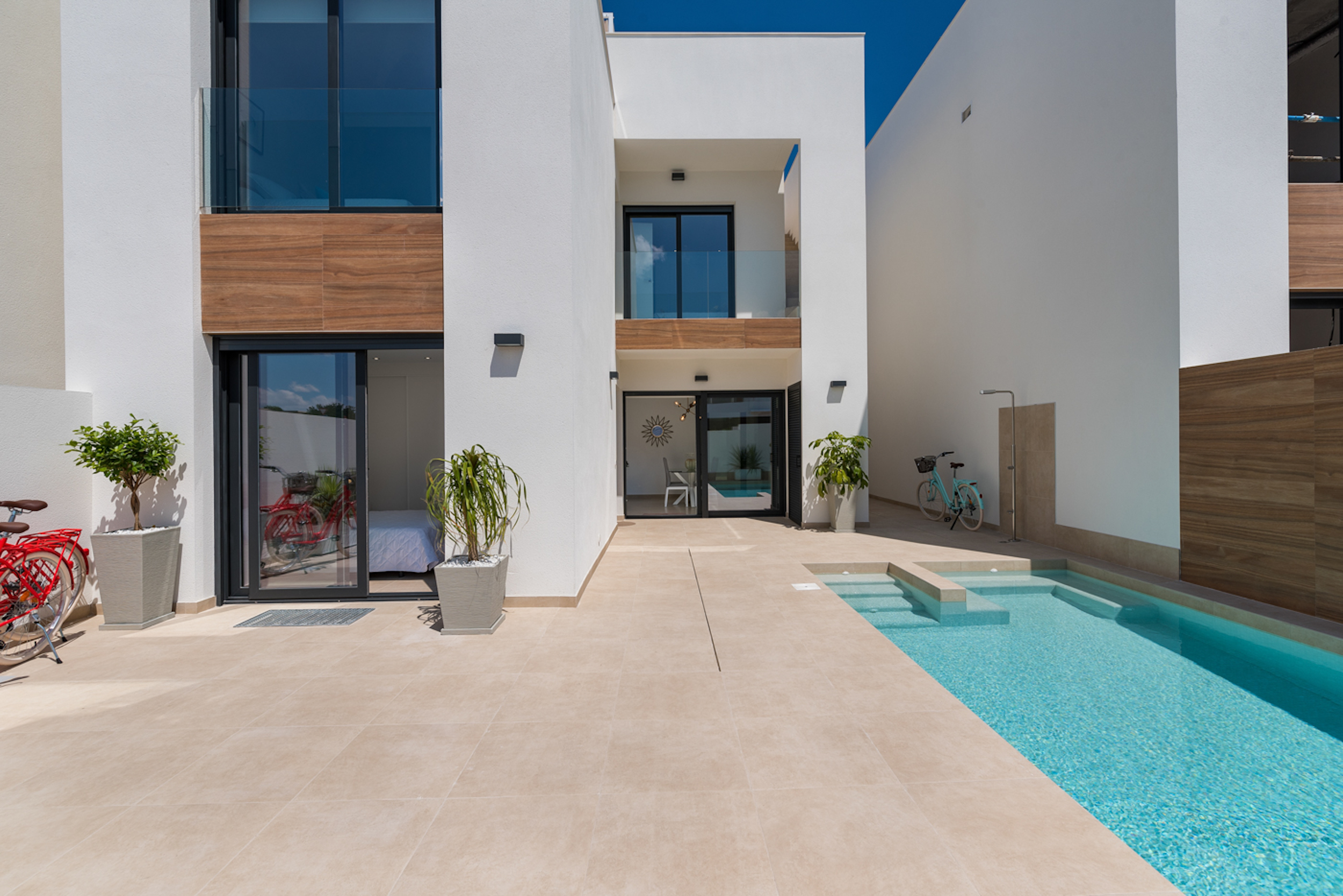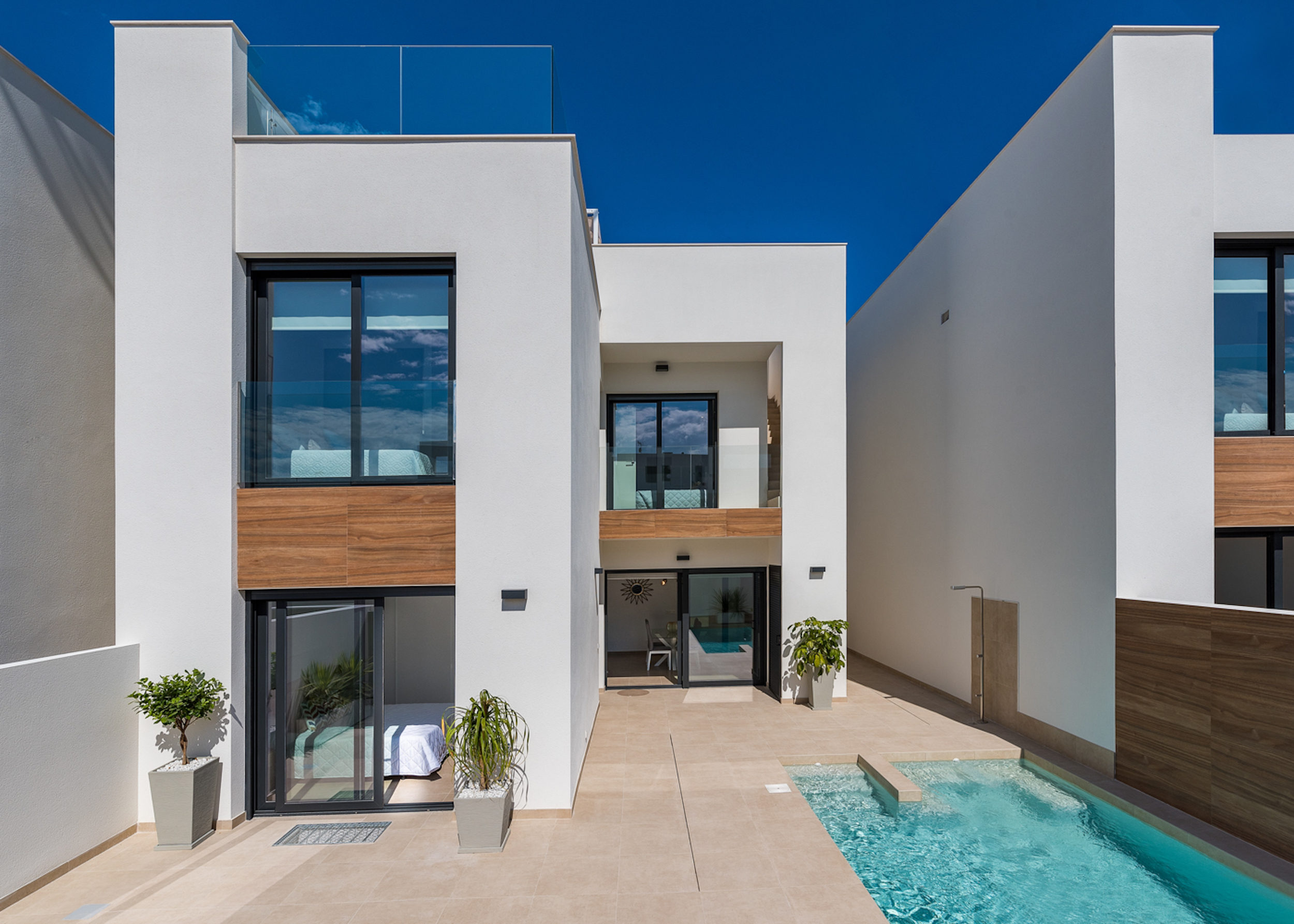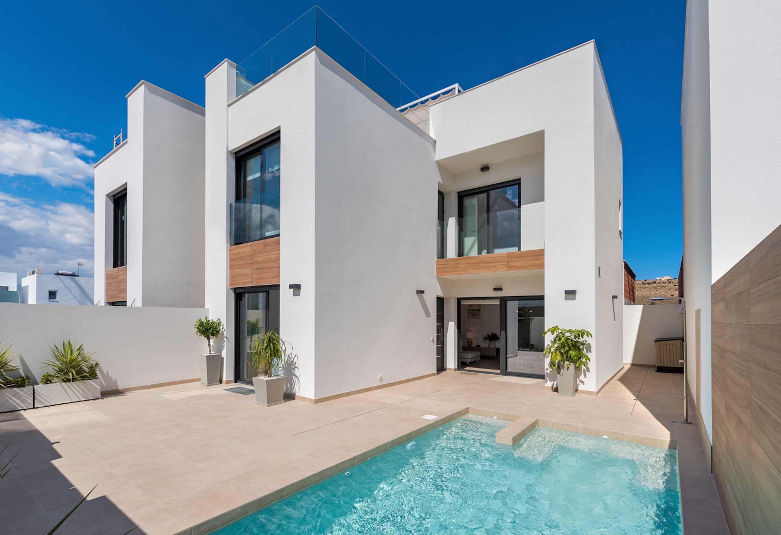Benijofar is an exceptional area of the Costa Blanca provided with all amenities: 20 minutes away from the airport of Alicante, very close to the beaches of Guardamar and golf courses. The modern style villas consist of a living room, 3 bedrooms (2 of them with bathroom in suite), furnished kitchen and 3 bathrooms. Private terrace and pool, parking area, Mediterranean style garden and two solariums with amazing views.