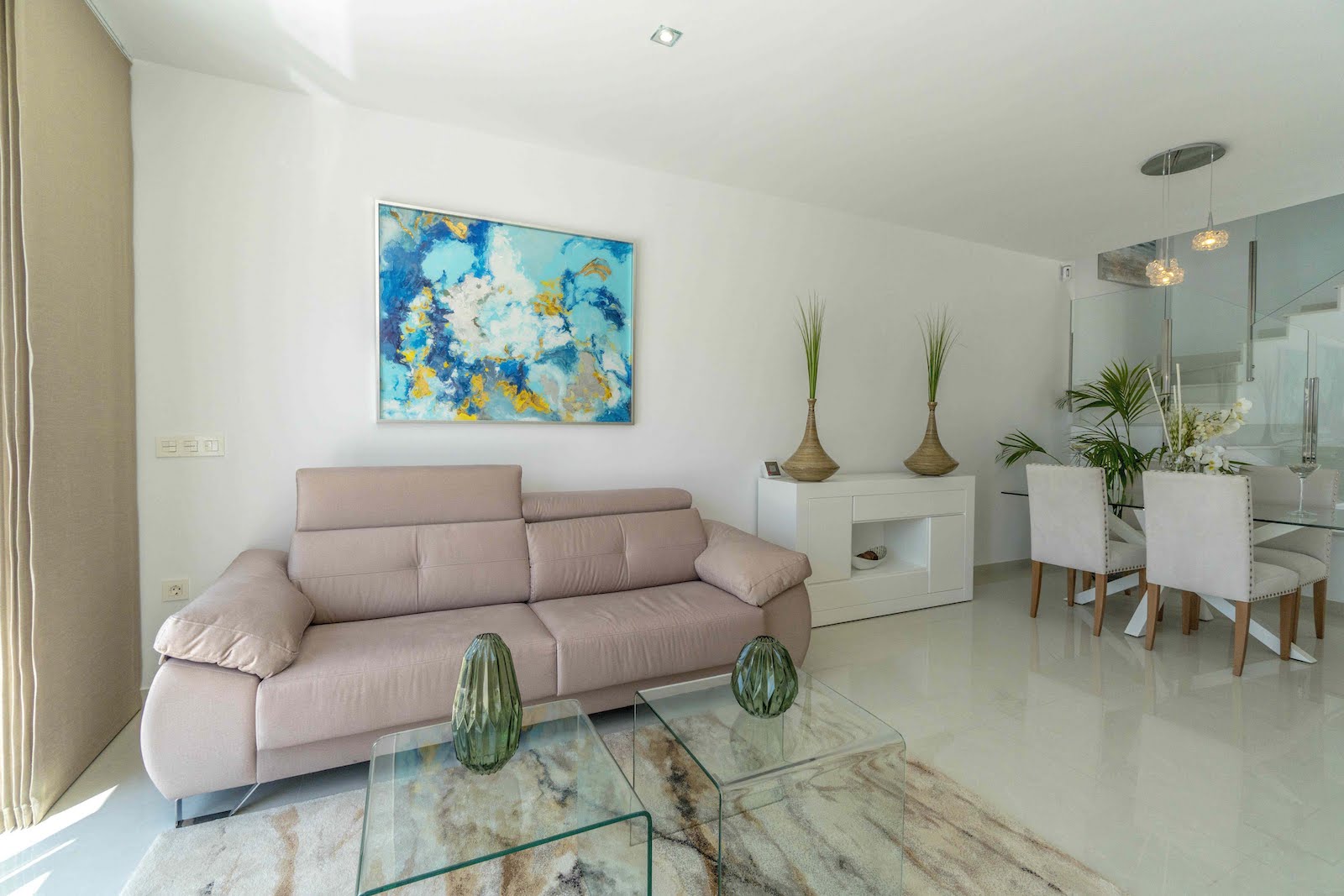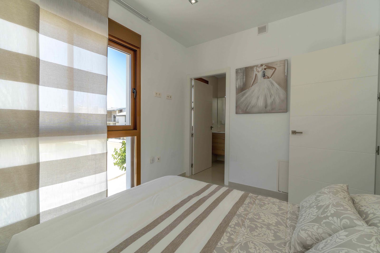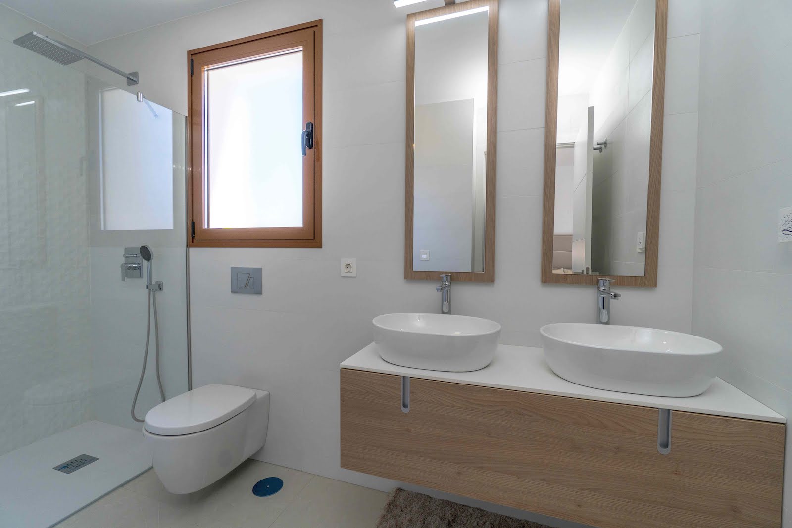These modern villas offer 3 spacious bedrooms and 3 fully fitted bathrooms. On the ground floor, you'll discover a bedroom with a fitted wardrobe, a bathroom, and a large living-dining area connected to an open kitchen with views of the private pool.