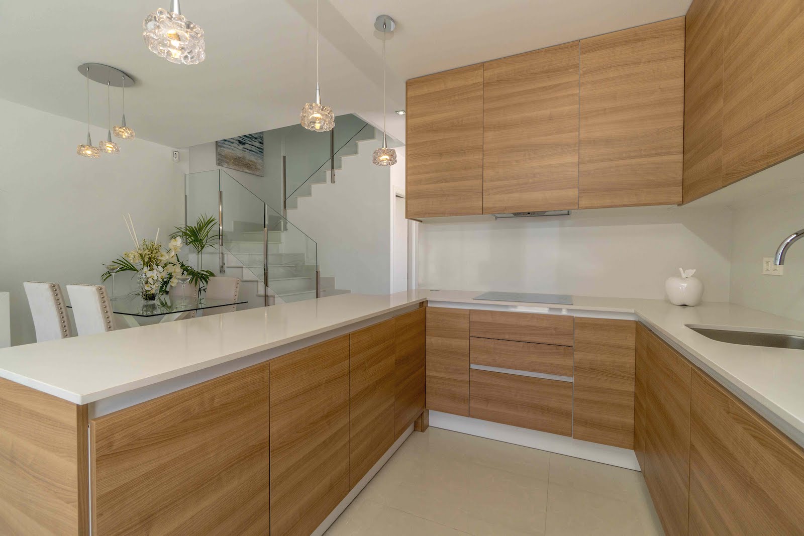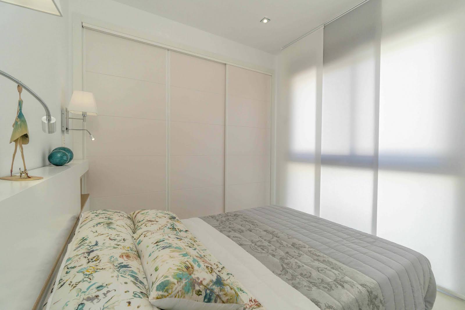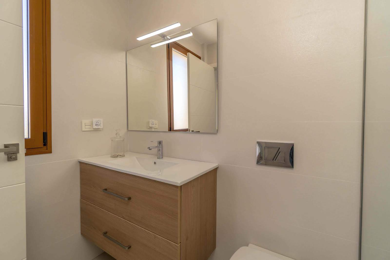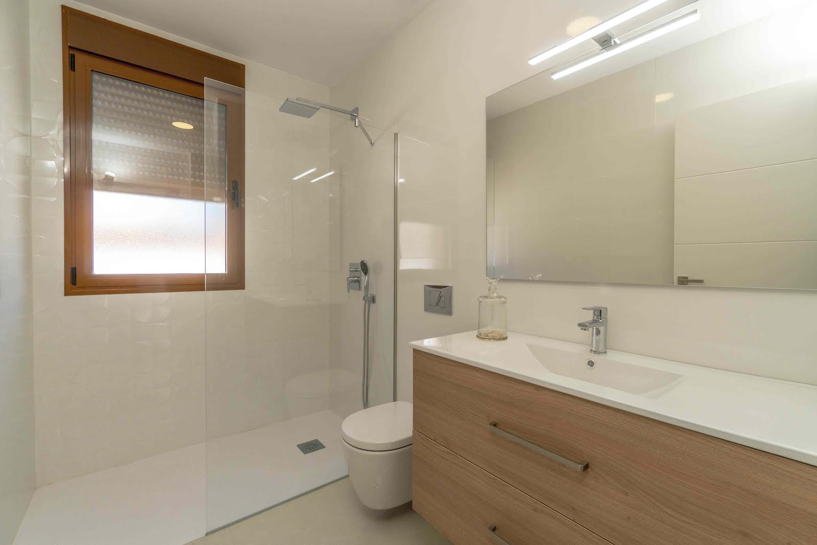 These modern villas offer 3 spacious bedrooms and 3 fully fitted bathrooms. On the ground floor, you'll discover a bedroom with a fitted wardrobe, a bathroom, and a large living-dining area connected to an open kitchen with views of the private pool.