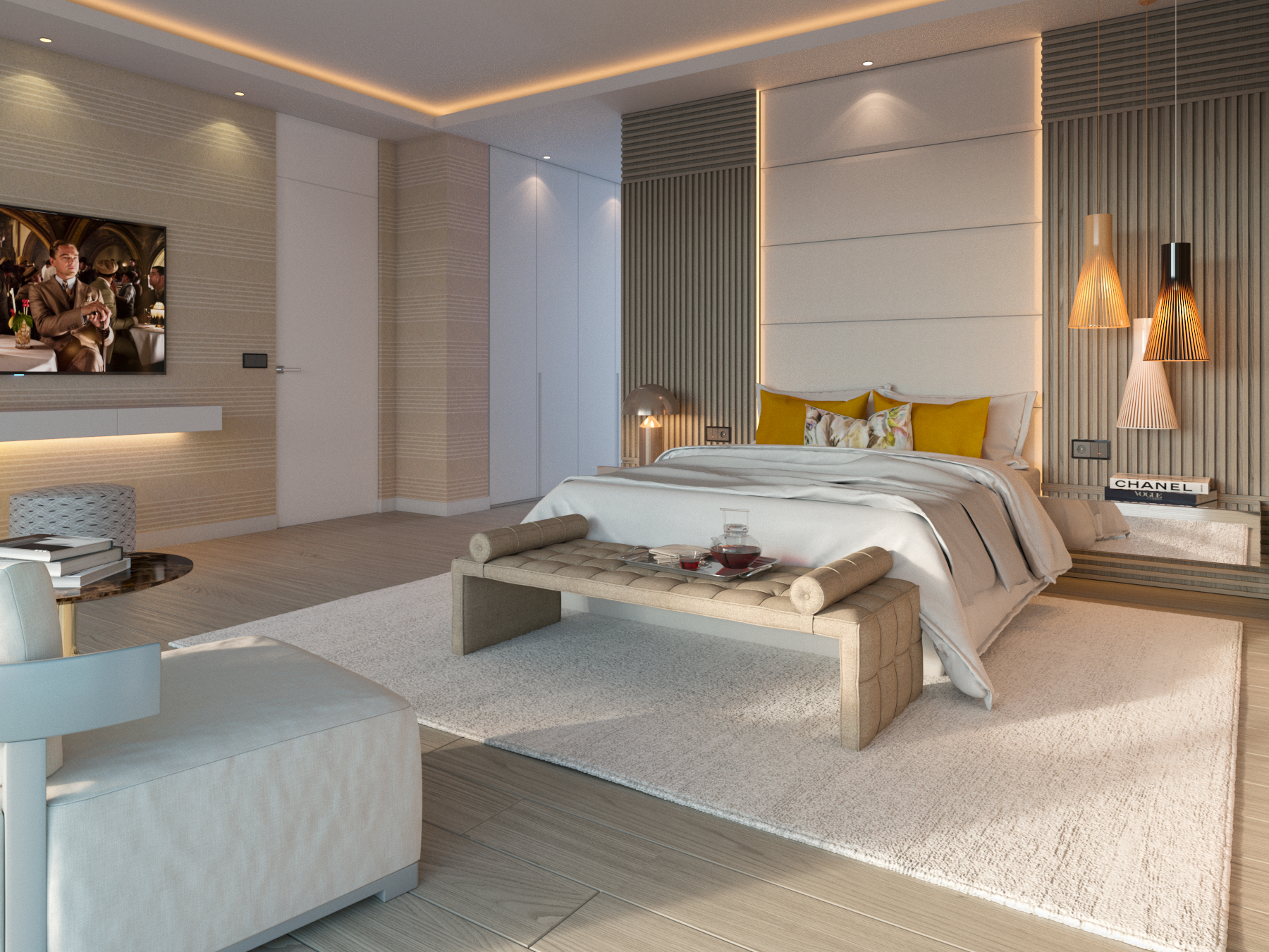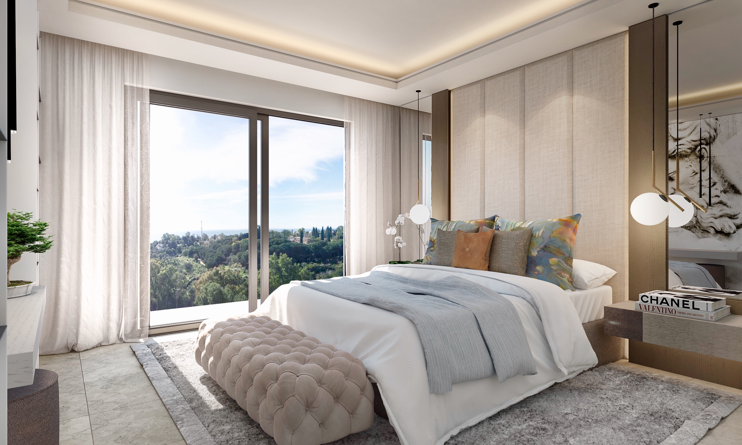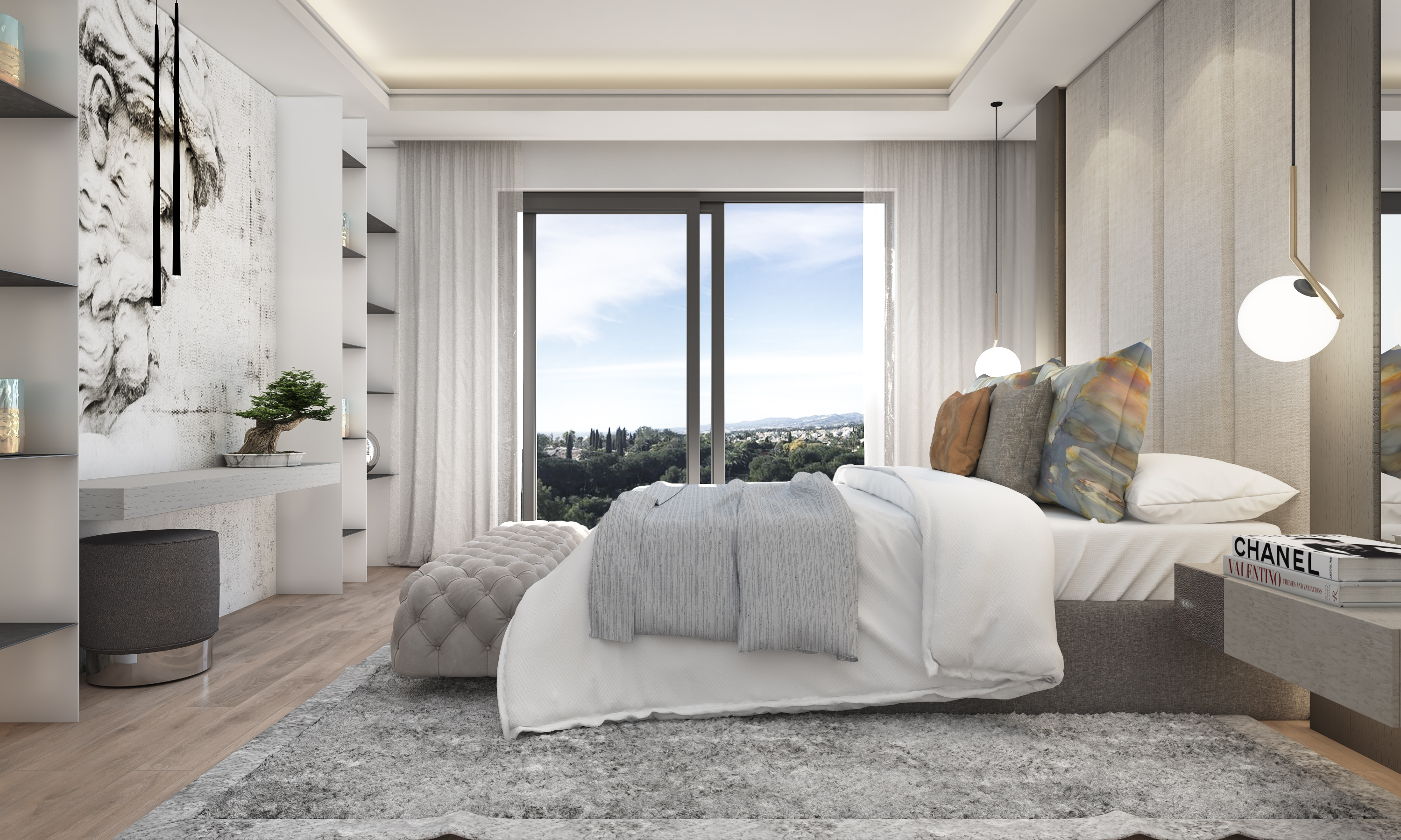 A magnificent en-suite master bedroom with spacious closets and a private sea-facing terrace. The other bedrooms are also en-suite and have access to the terraces.