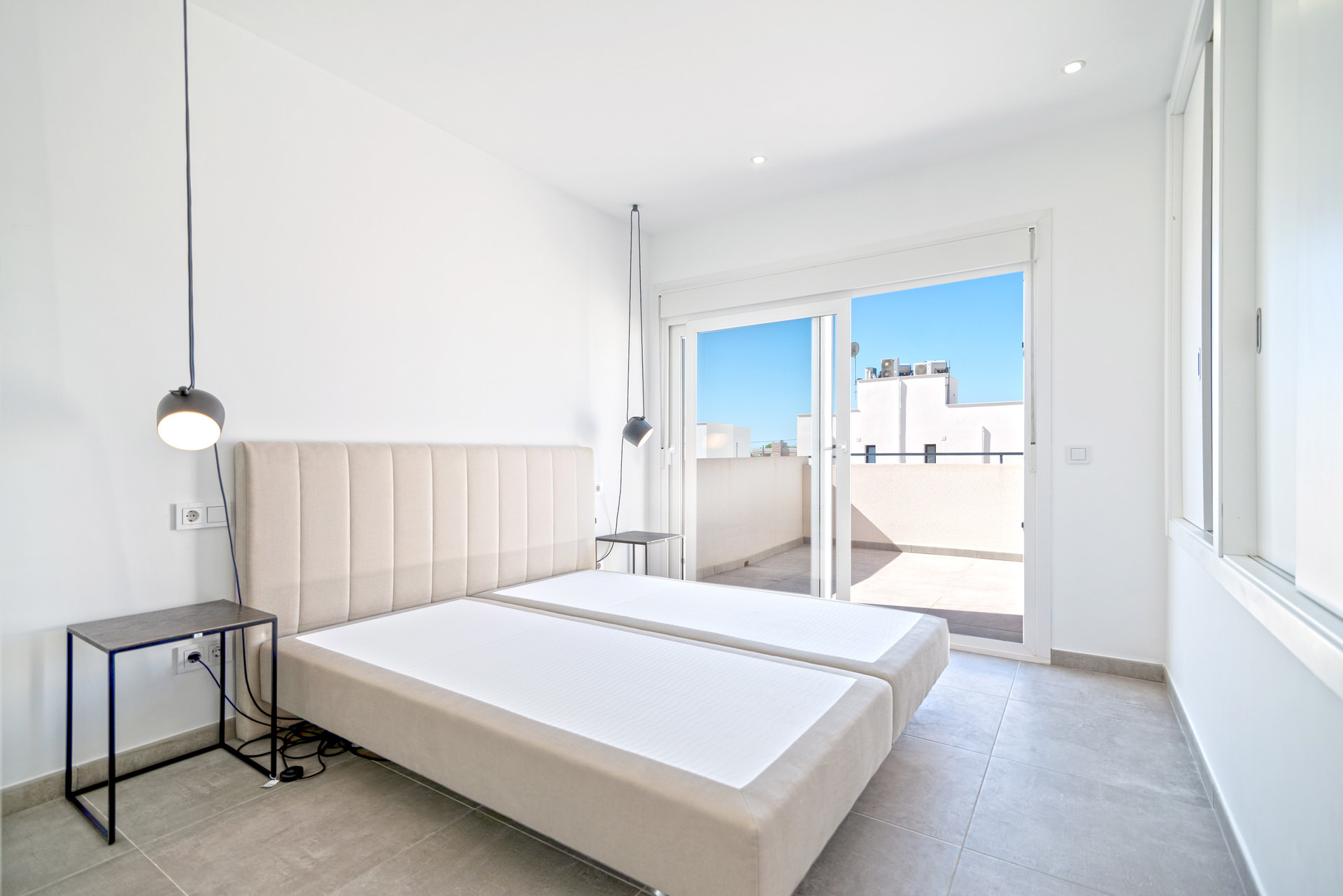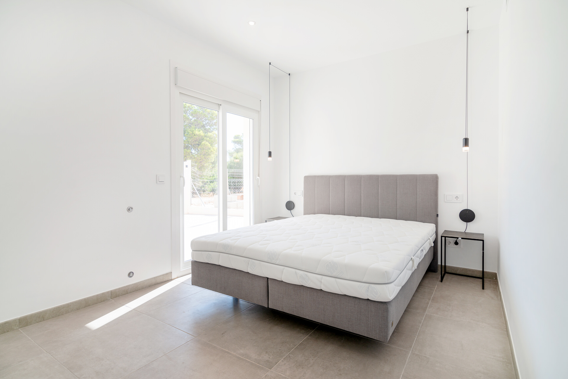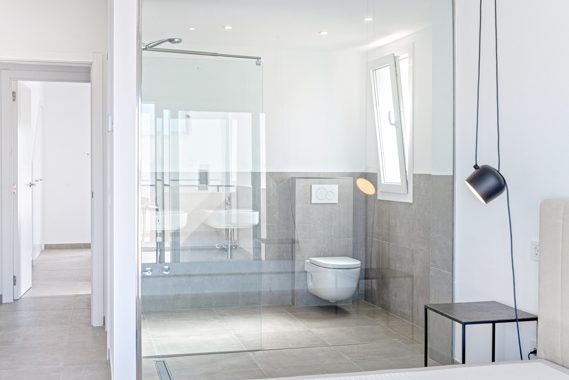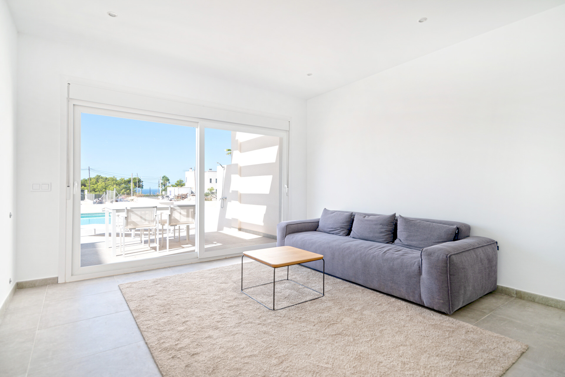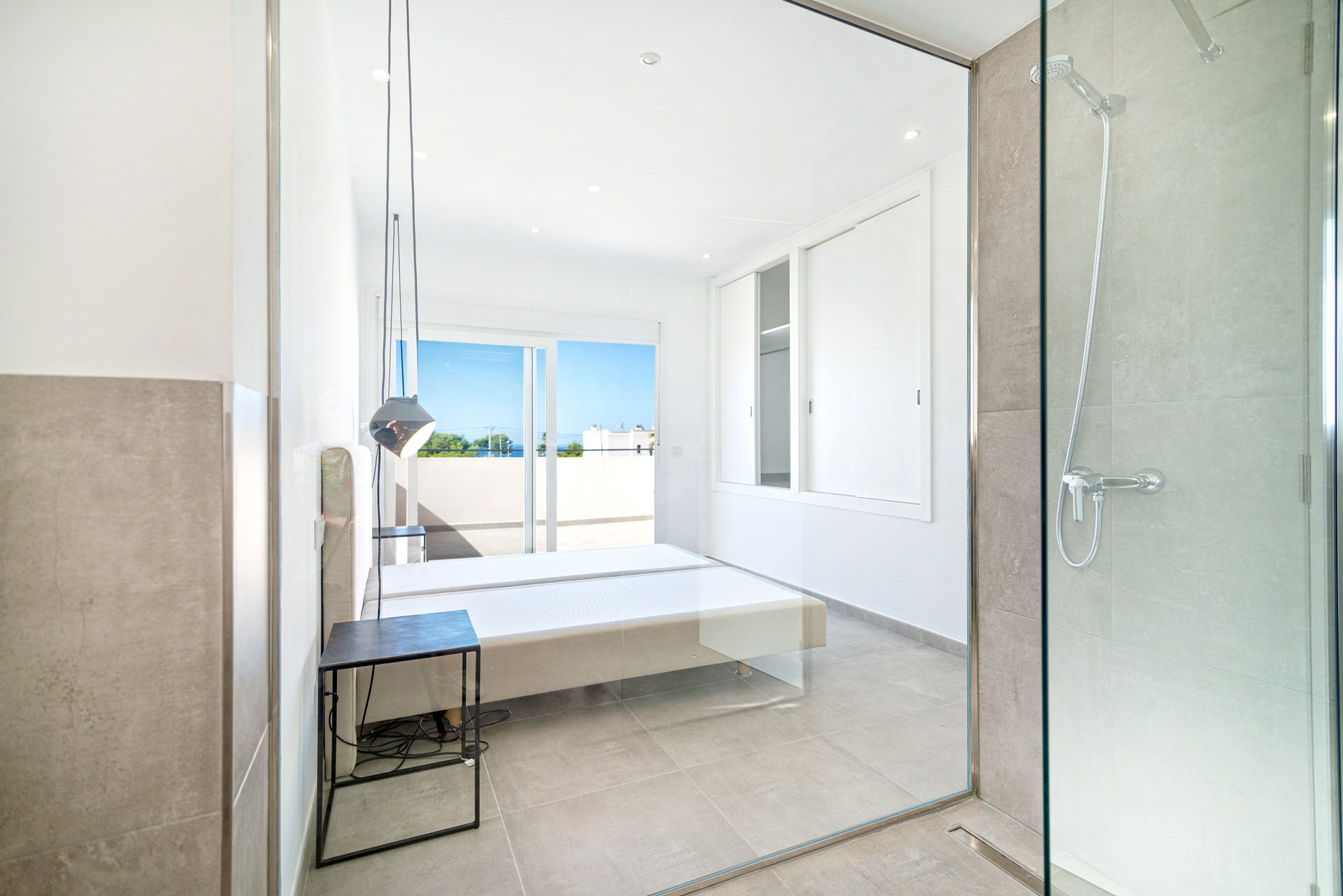 A stylish new building with unspoilt views of the turquoise Mediterranean Sea. A modern new building presents itself in an impressive style and includes an open living and dining area with adjacent kitchen. From all areas you have access to the wonderful property with terrace and pool. A lot of living space and an ideal room layout in the floors impress, so there are beautiful bedrooms with bathrooms en suite on the upper floor. Marvel at a large master bedroom with walk-in closets and access to the roof terrace with fantastic views.