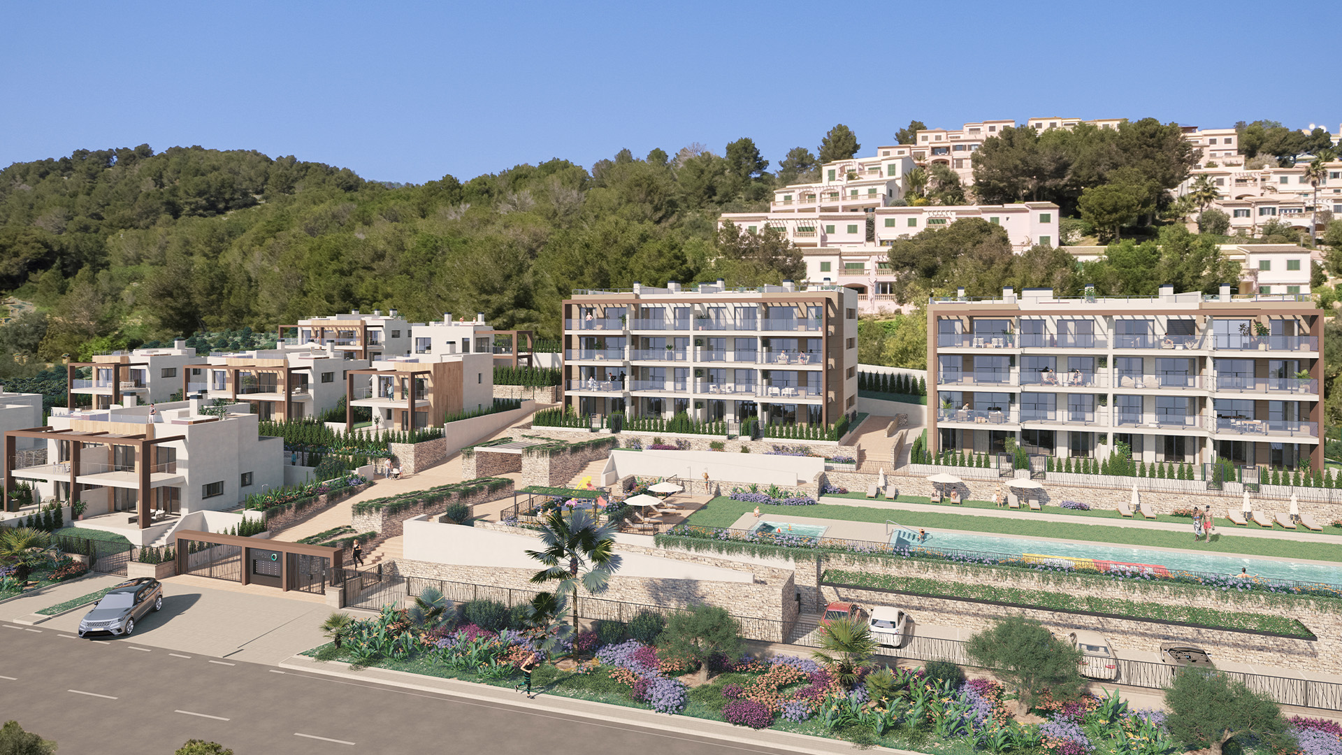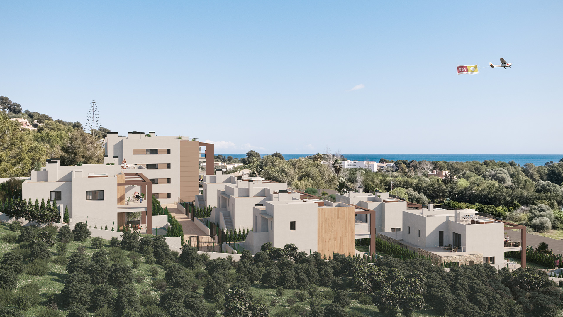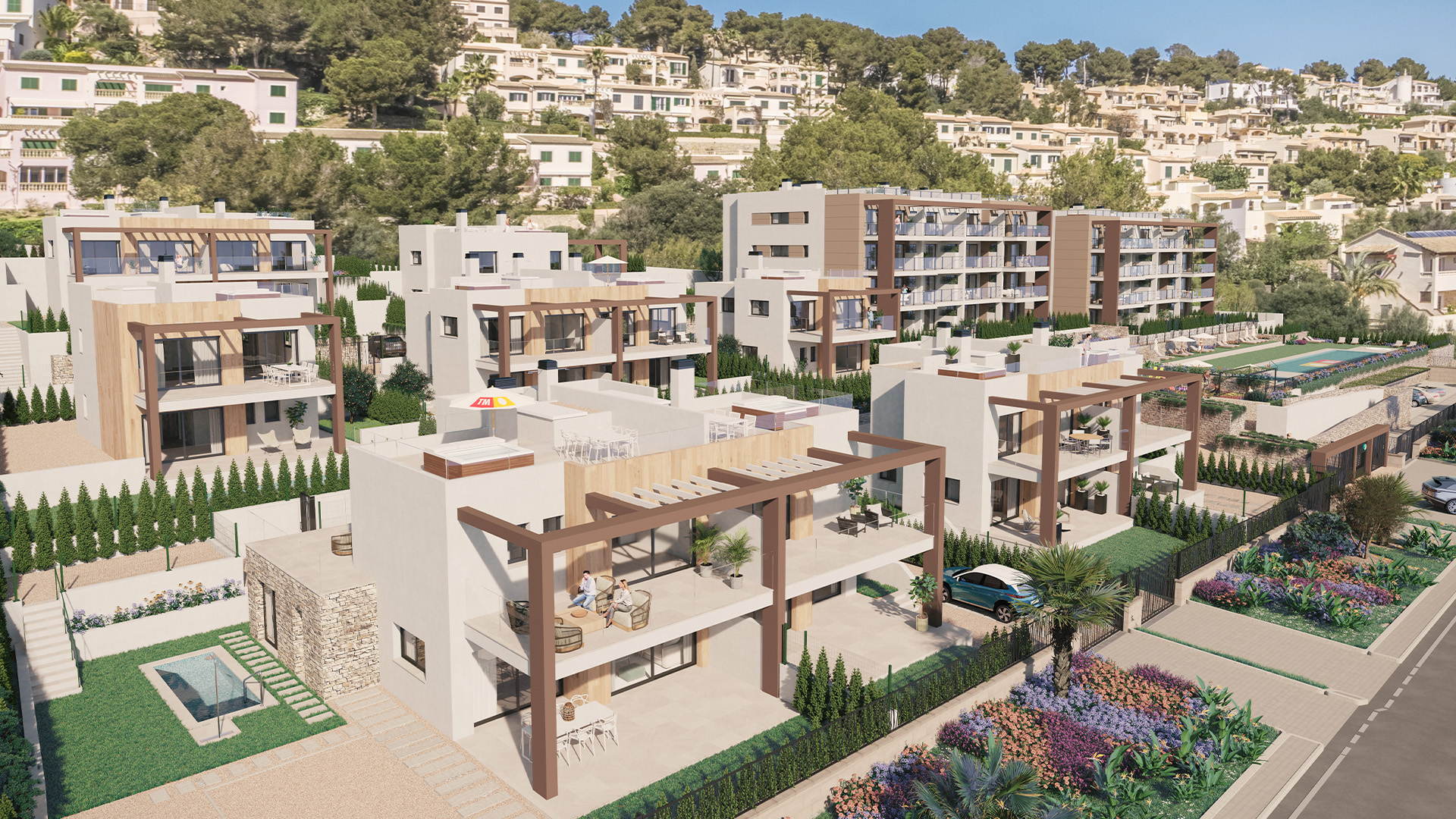Essence of Sa Cala has 42 homes, 31 of them in 2 blocks of flats with 2 to 3 bedrooms; and 11 semi-detached and independent 2 to 3-bedroom single-family homes, with 2 and 3 bedrooms. If you are looking for an apartments, you can choose between a ground floor, first floor, or penthouse with a solarium. All apartments have a garage place and storage room, which are included in the price. If you are looking for a single-family home, you can choose between a semi-detached or detached villa. All of which are distributed between 2 floors, besides a roof top terrace, garden and a private parking space in your own plot.
