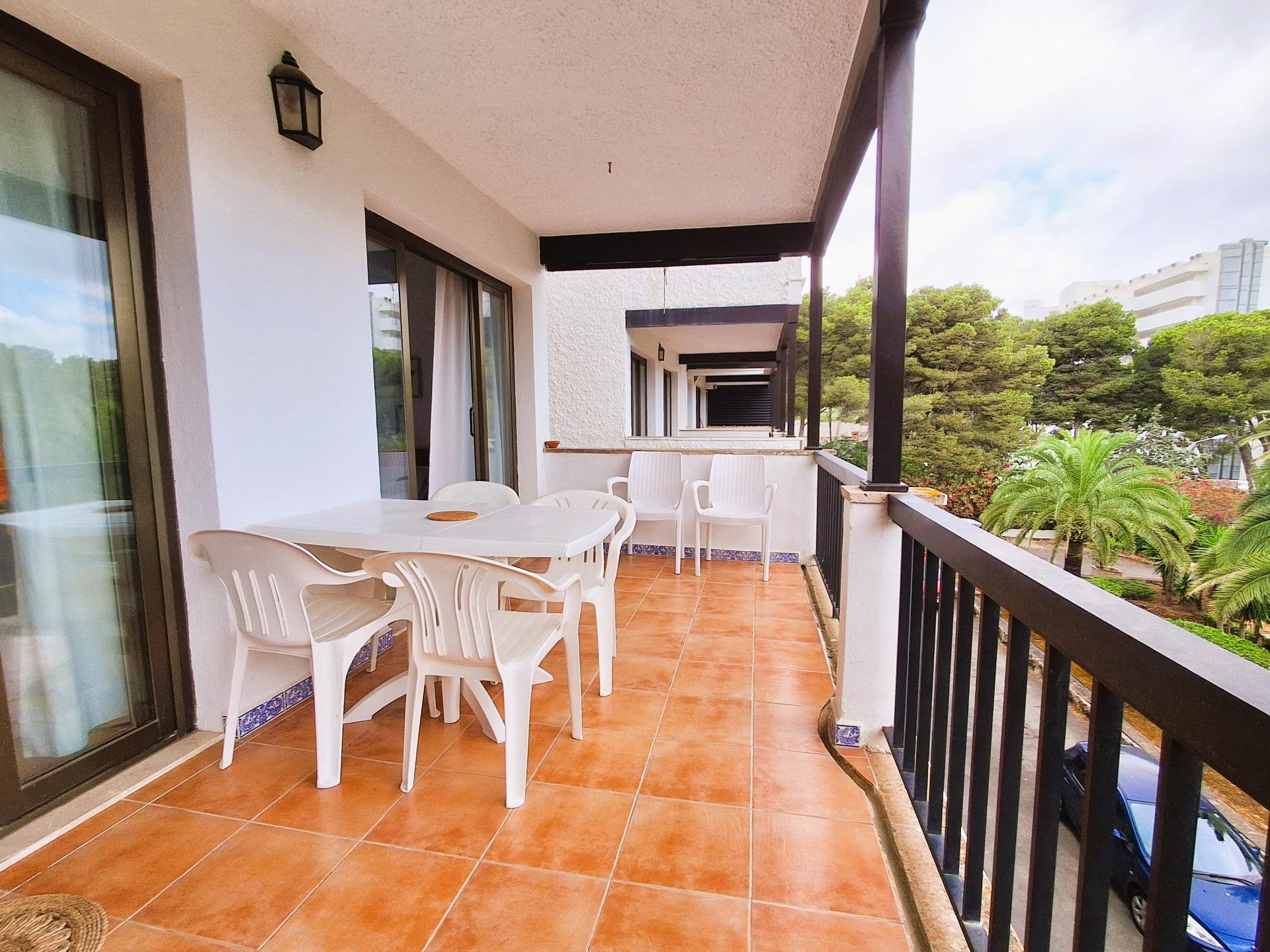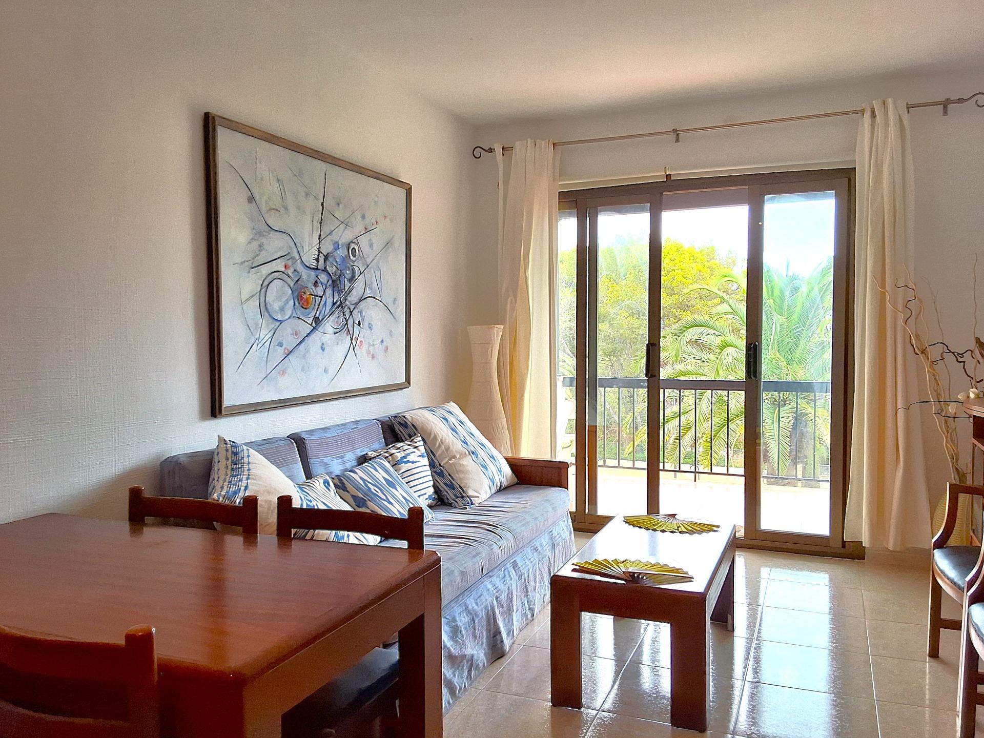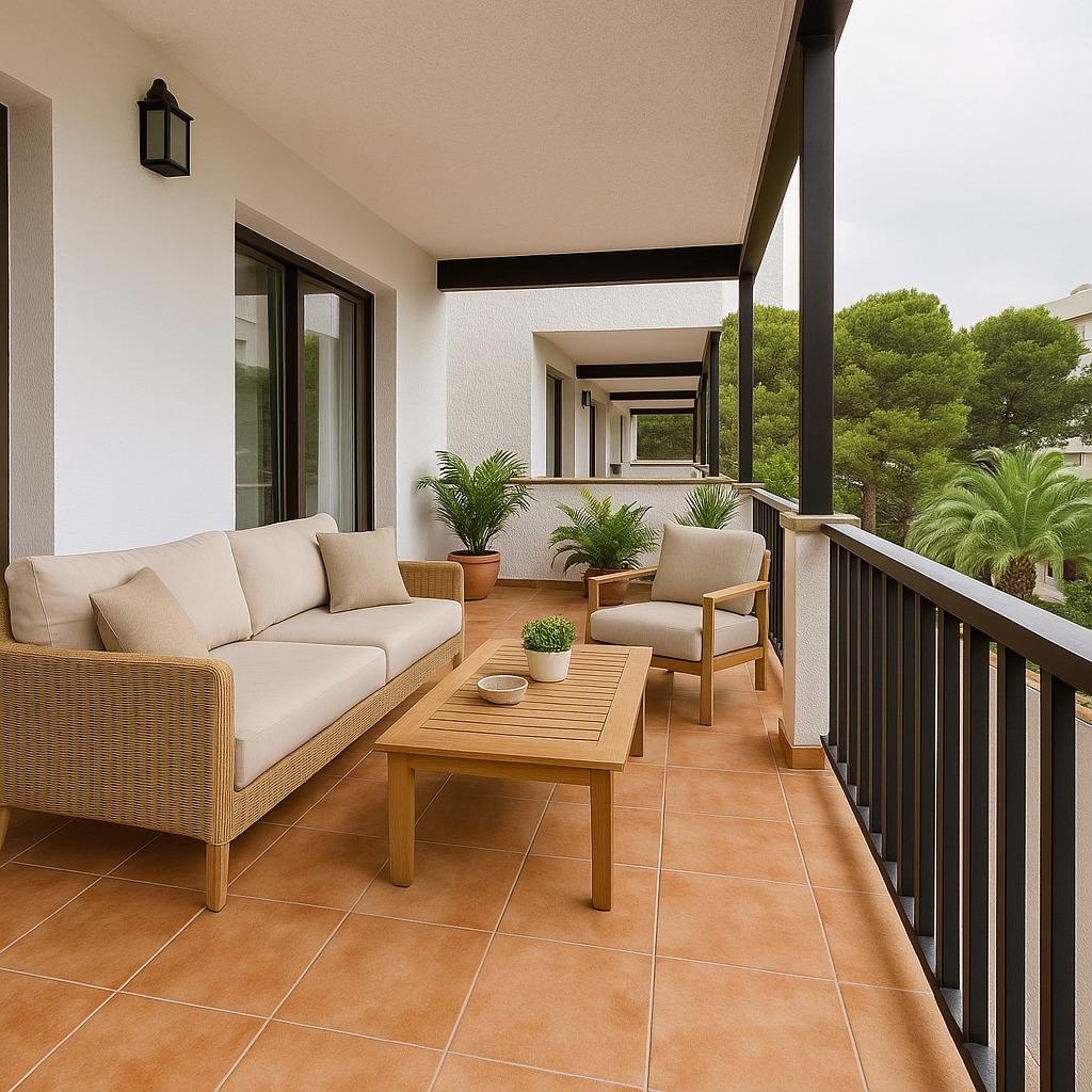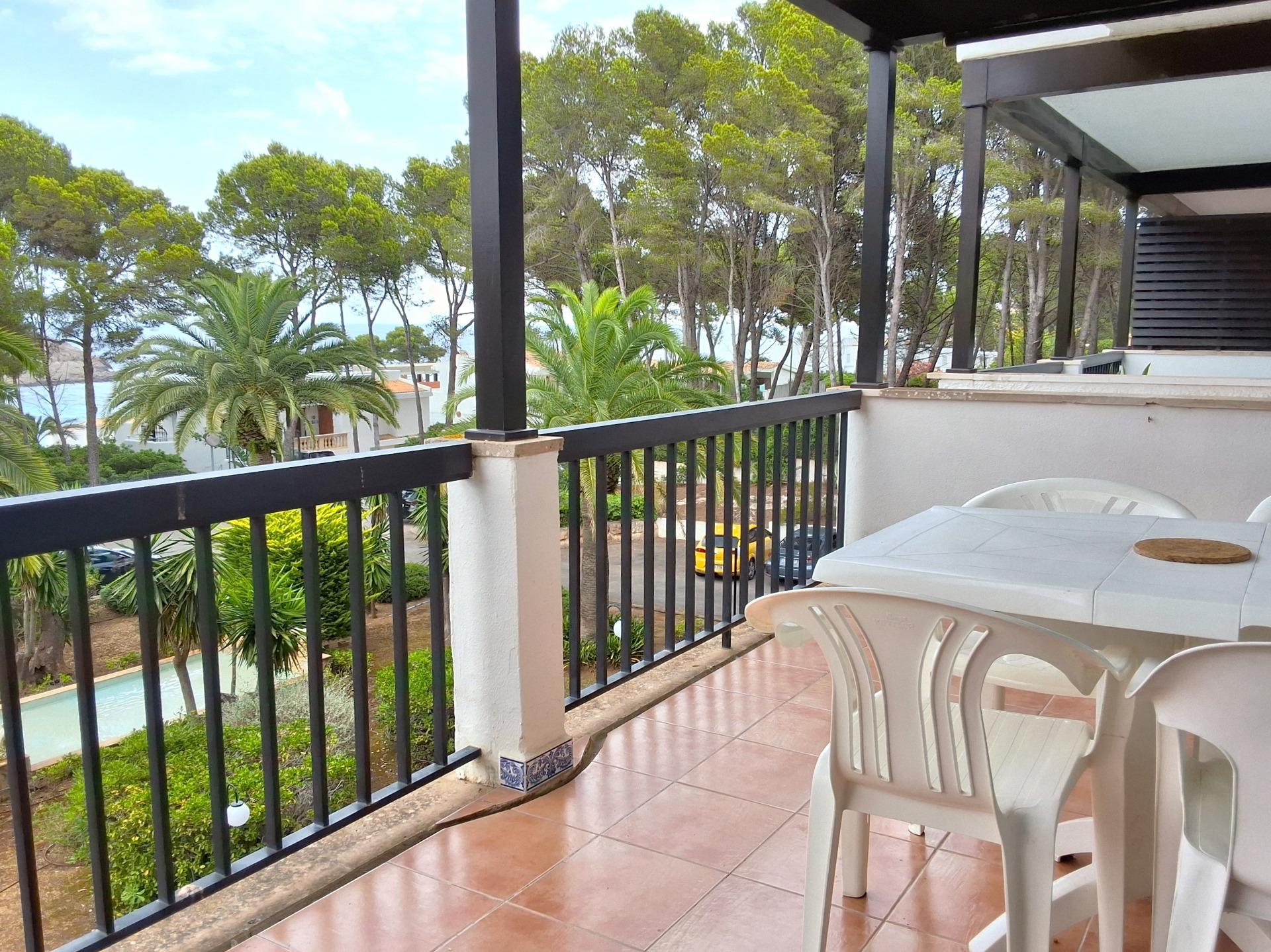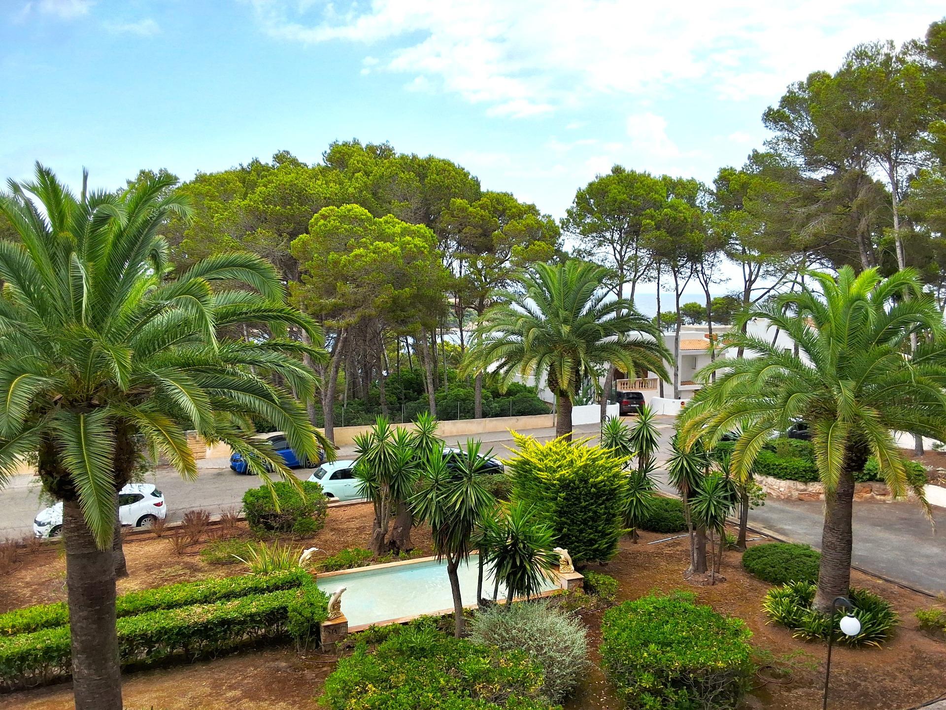 Exclusive apartment just 40 meters from the beach in Font de Sa Cala, Capdepera.. . Discover this charming apartment located in the sought-after area of Font de Sa Cala, Capdepera. A privileged setting that combines residential tranquillity with proximity to the sea – perfect as a permanent residence or for enjoying holiday stays.. This bright and welcoming apartment is situated on the second sea line, just steps from the beach, in a well-maintained residential building with elevator. The area is peaceful, exclusive, and very close to all amenities, ensuring comfort and an exceptional quality of life.. With a built area of 61 m2 (50 m2 usable), the property is south-facing, allowing for bright, warm, and functional living spaces throughout the day.. The highlight is the 11.42 m2 terrace with partial sea and garden views – ideal for creating a stylish chill-out area or enjoying breakfast with the family while taking in the Mediterranean breeze.. There are two spacious double bedrooms with built-in wardrobes and excellent ventilation: one with a garden view, the other with direct access to the terrace. The bright living-dining room also connects to the terrace through large aluminum sliding doors, blending indoor and outdoor living beautifully.. The open-plan kitchen is fully equipped with appliances and cabinetry and includes a breakfast bar, perfect for social cooking and modern living.. There are two complete bathrooms, both with walk-in showers. Hot water is provided by an electric boiler. Though there is no central heating, the excellent orientation ensures a pleasant temperature all year round.. The property is in good condition and ready to move in, though a light renovation could enhance its full potential. The original wood-framed windows and doors with fine glass add character and charm.. The building features exclusive outdoor parking for residents and the option to rent a covered parking space for added convenience.. Community fees: €2,000 per year.. The purchase and sale transaction of this property may be completed starting from March 2026.. This is a unique opportunity to live surrounded by peace, sea, and natural beauty in one of the most enchanting corners of northeast Mallorca – where each day begins with an inspiring view.. Some images have been generated with AI to illustrate potential decor and highlight the property’s possibilities.. Important: Purchase taxes, notary, and registration costs are not included. As a construction company, we are also happy to advise you on renovation, expansion, or any project you may have in mind.