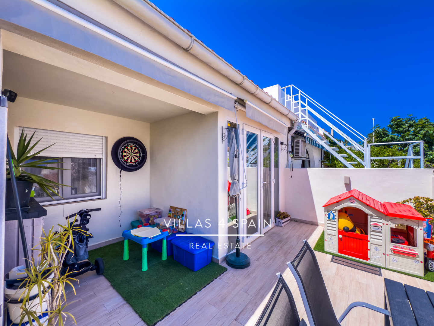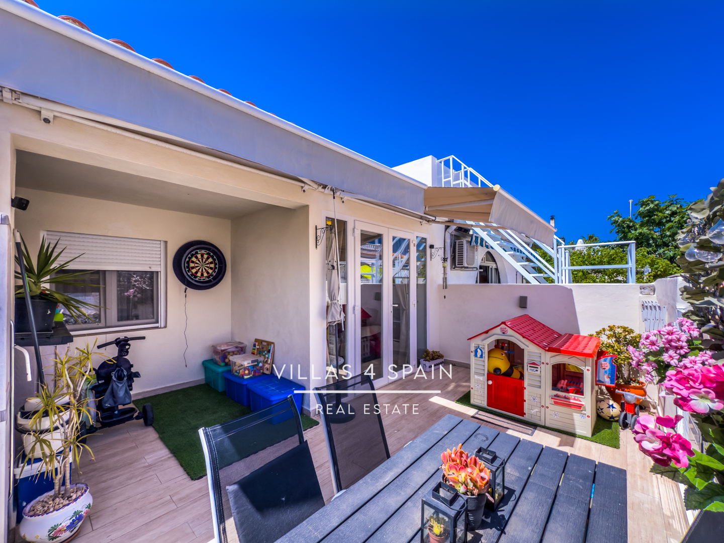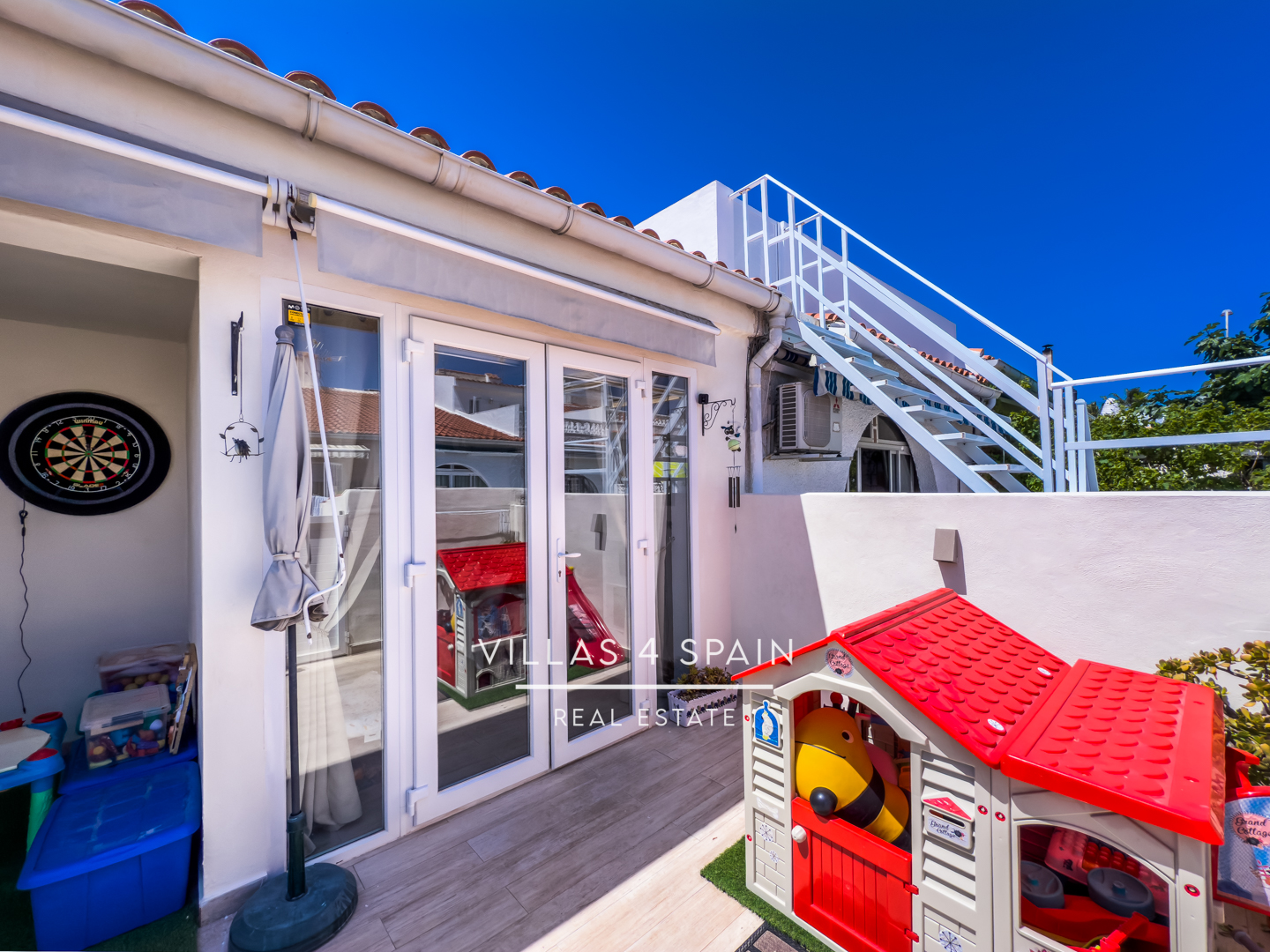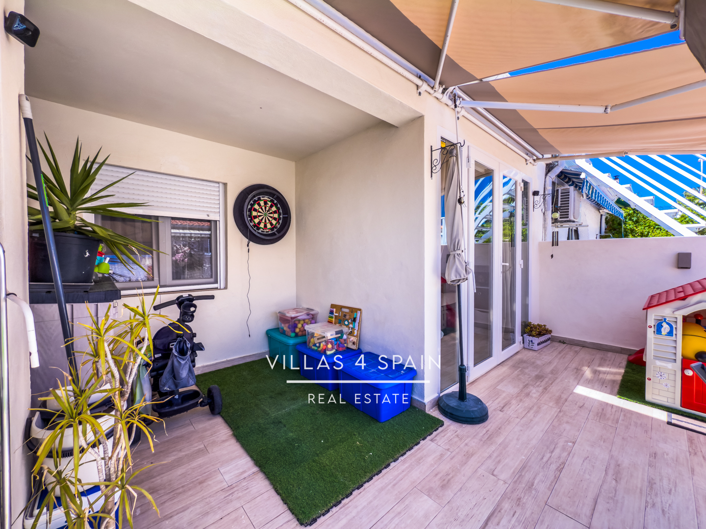 Upptäck detta vackert moderniserade hus med 2 sovrum och 1 badrum i hjärtat av San Luis, Torrevieja, som erbjuder en perfekt blandning av komfort och bekvämlighet. Denna pärla i söderläge har en rymlig trädgård framtill med en lättåtkomlig ramp och ett täckt förråd, perfekt för utomhusliv. Njut av måltider utomhus eller umgänge under två utdragbara Toldo-solskydd, vilket skapar ett skuggigt område.