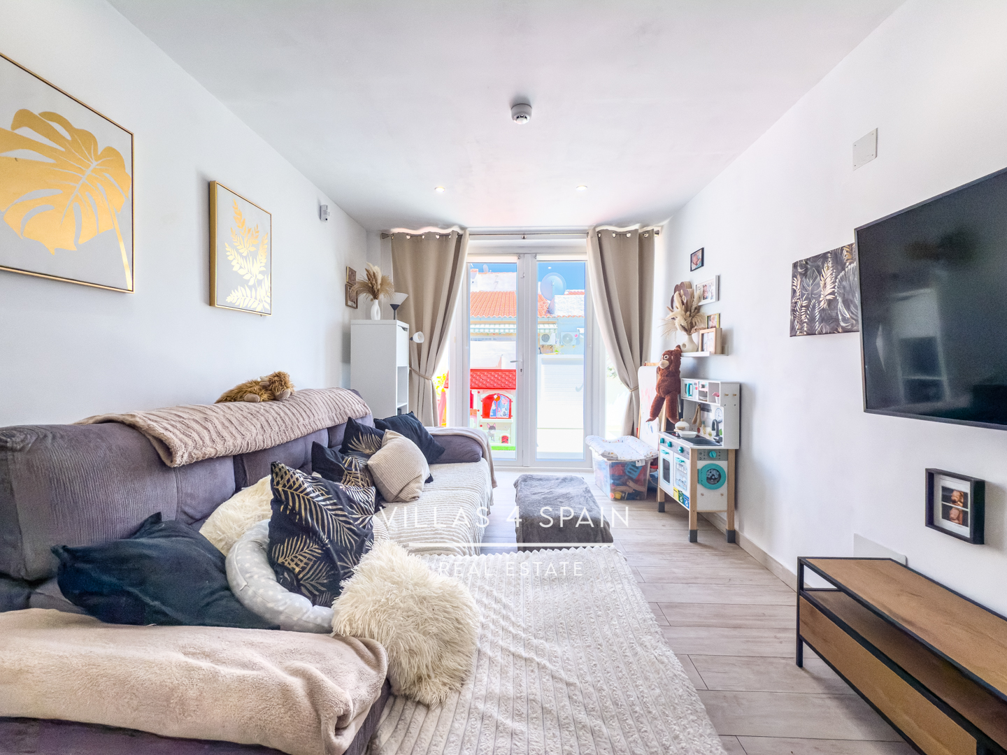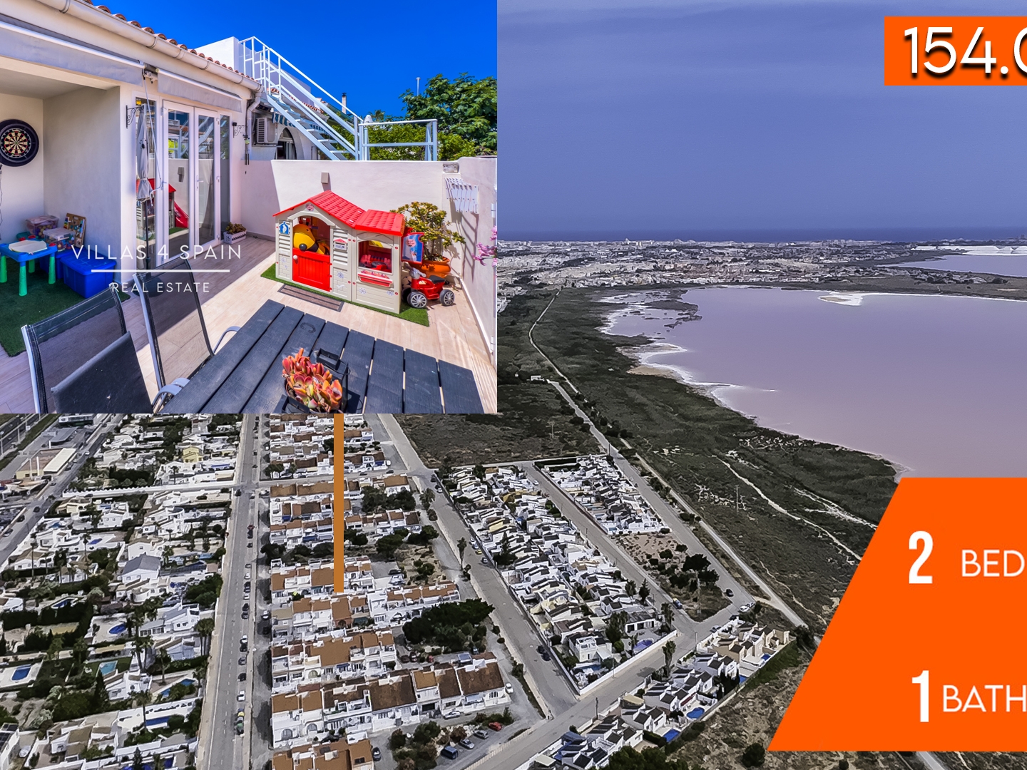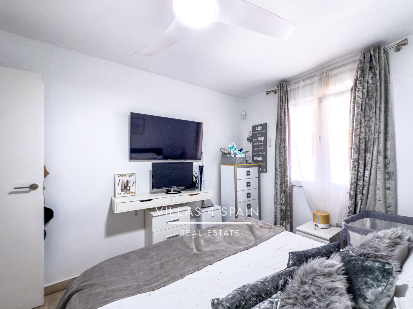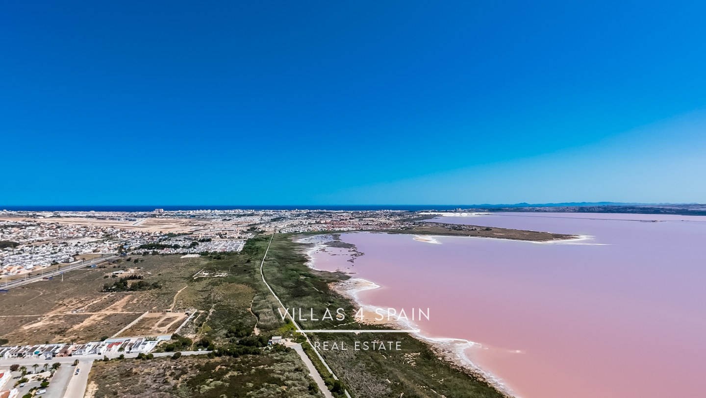 Hallen leder till ett sovrum med inbyggda garderober, ett elegant, helrenoverat badrum med skjutdörr och ett rymligt andra sovrum med dubbelsäng. Beläget bara 2 minuters promenad från en lokal stormarknad och omgivet av en mängd olika barer och restauranger, har detta hem ett perfekt läge för bekvämlighet. De hisnande stränderna på Costa Blanca ligger bara 10 minuters bilresa bort, medan den ikoniska rosa saltsjön, perfekt för kvällspromenader eller solnedgångsutsikt, ligger bara 3 minuters promenad bort.