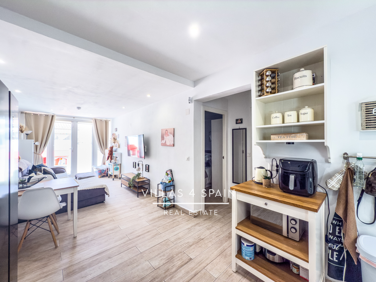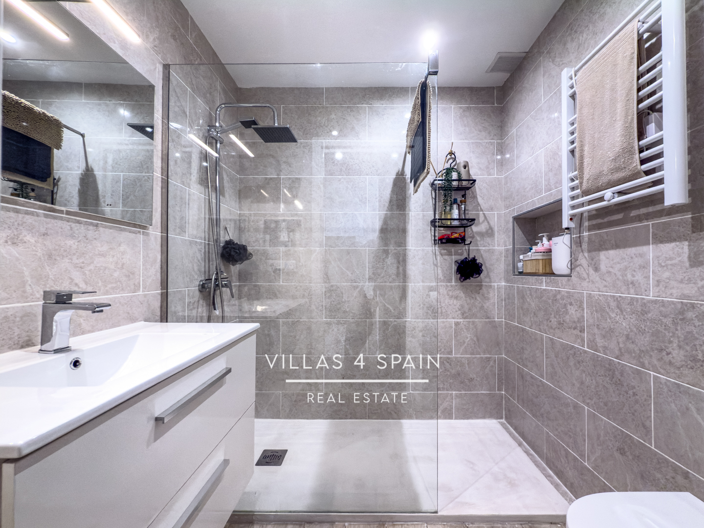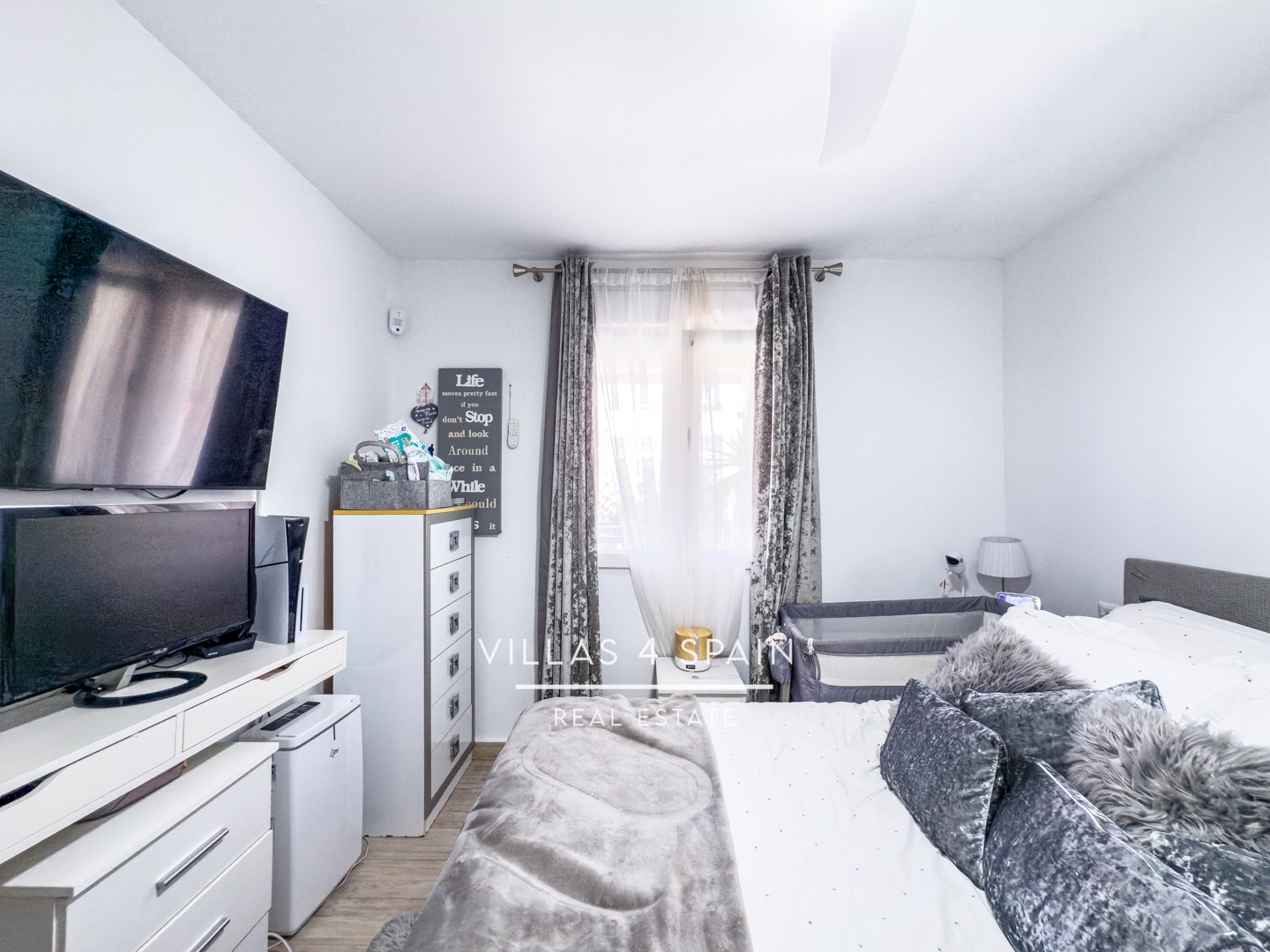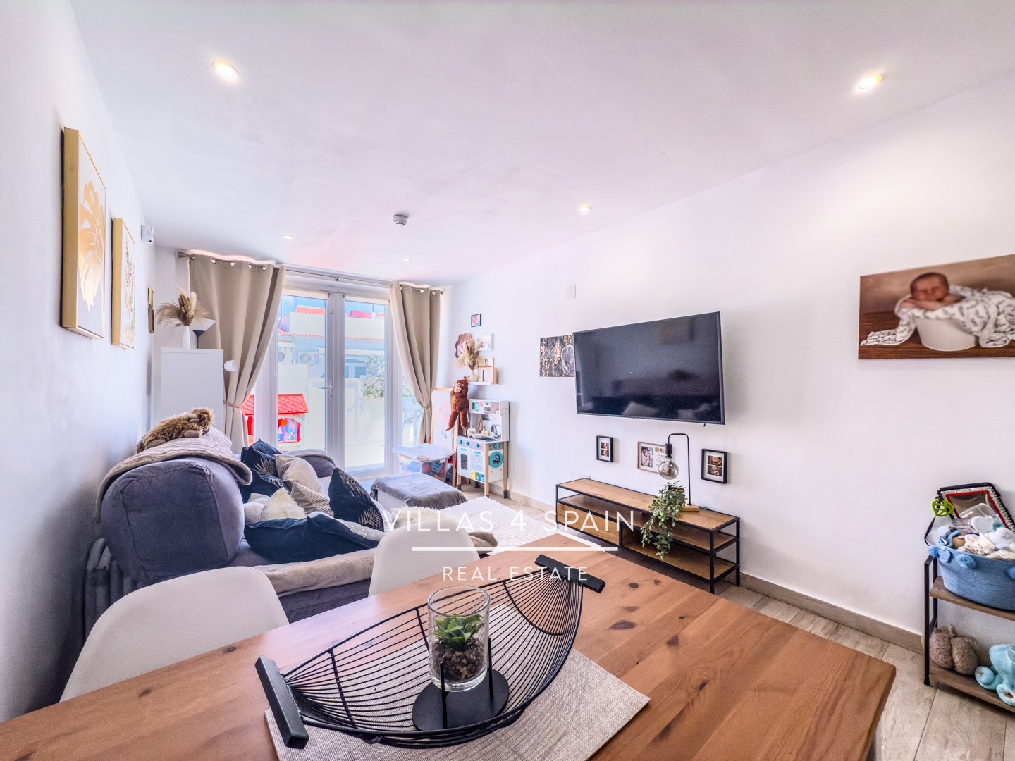 Hallen leder till ett sovrum med inbyggda garderober, ett elegant, helrenoverat badrum med skjutdörr och ett rymligt andra sovrum med dubbelsäng. Beläget bara 2 minuters promenad från en lokal stormarknad och omgivet av en mängd olika barer och restauranger, har detta hem ett perfekt läge för bekvämlighet. De hisnande stränderna på Costa Blanca ligger bara 10 minuters bilresa bort, medan den ikoniska rosa saltsjön, perfekt för kvällspromenader eller solnedgångsutsikt, ligger bara 3 minuters promenad bort.