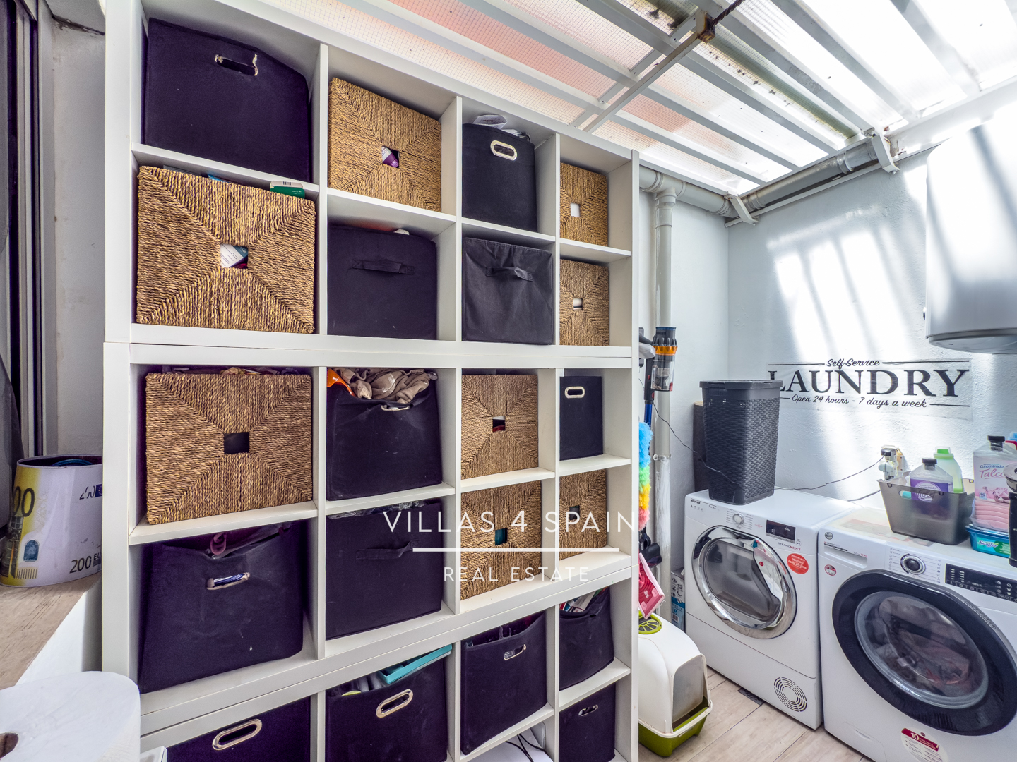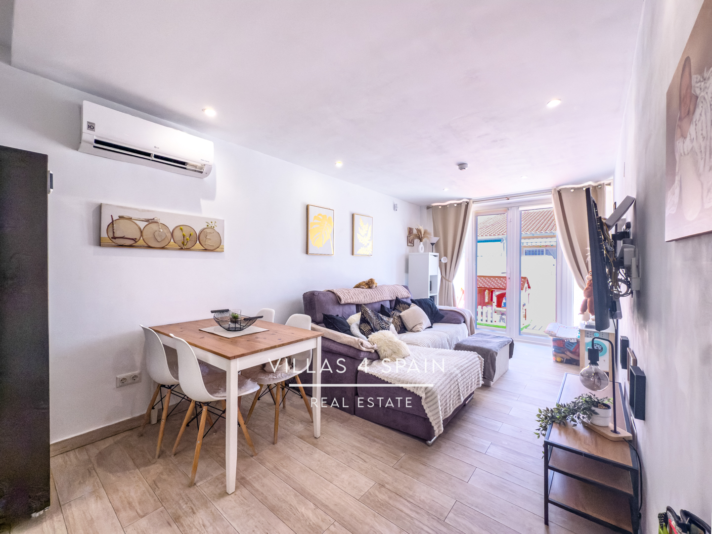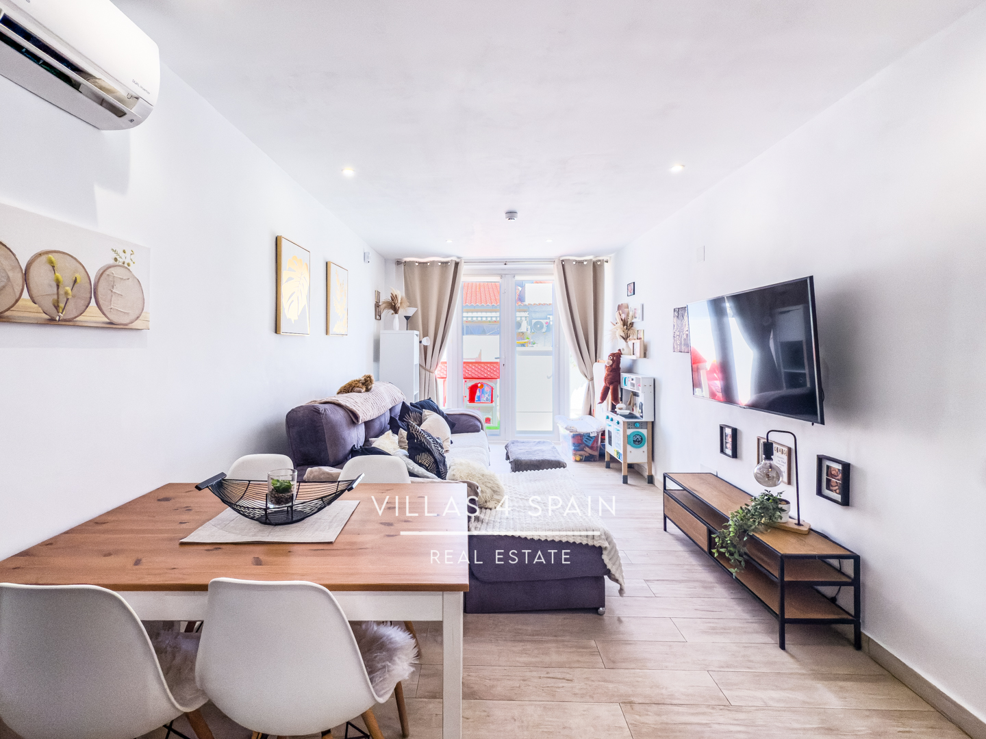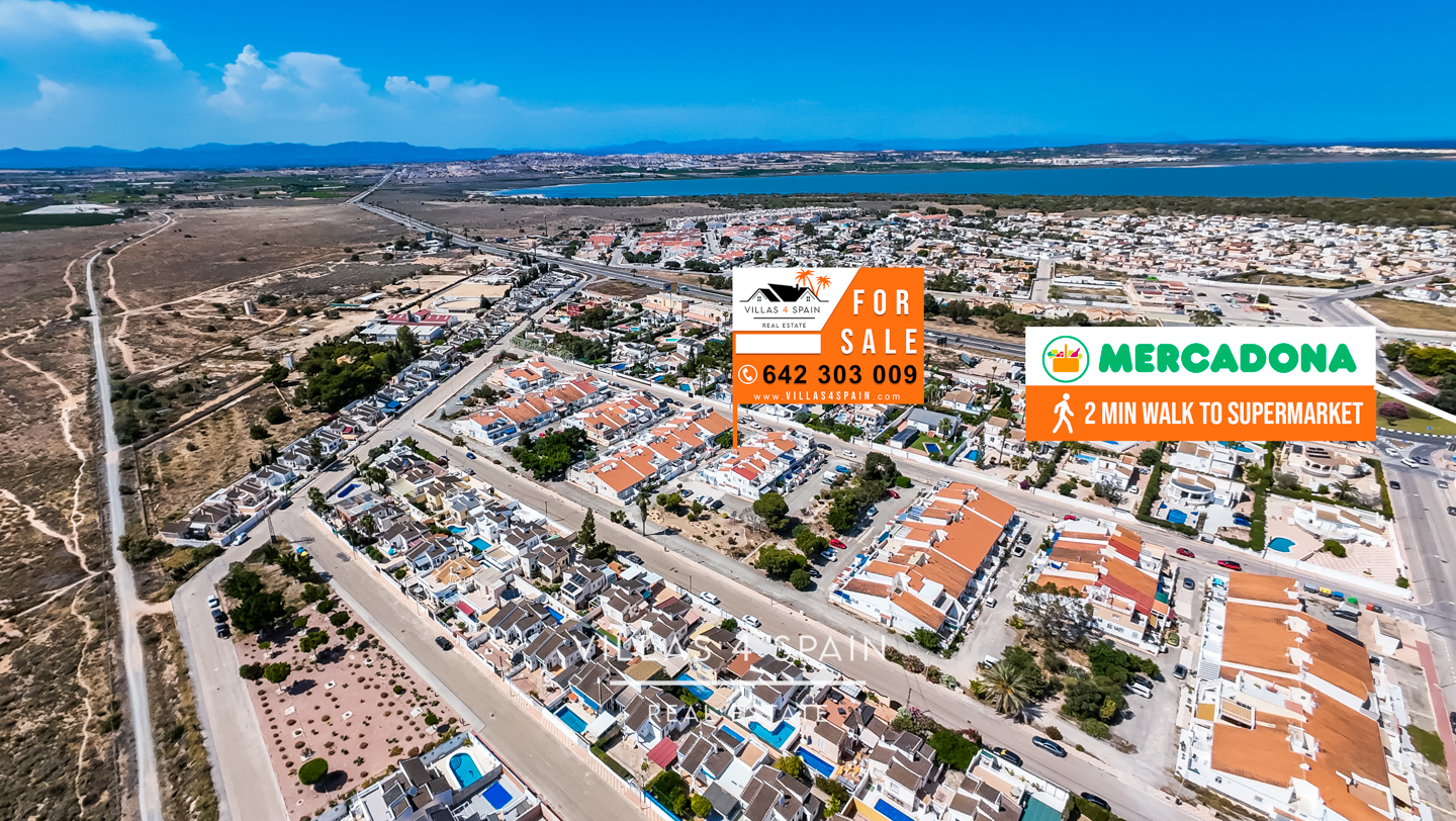 Hallen leder till ett sovrum med inbyggda garderober, ett elegant, helrenoverat badrum med skjutdörr och ett rymligt andra sovrum med dubbelsäng. Beläget bara 2 minuters promenad från en lokal stormarknad och omgivet av en mängd olika barer och restauranger, har detta hem ett perfekt läge för bekvämlighet. De hisnande stränderna på Costa Blanca ligger bara 10 minuters bilresa bort, medan den ikoniska rosa saltsjön, perfekt för kvällspromenader eller solnedgångsutsikt, ligger bara 3 minuters promenad bort.
