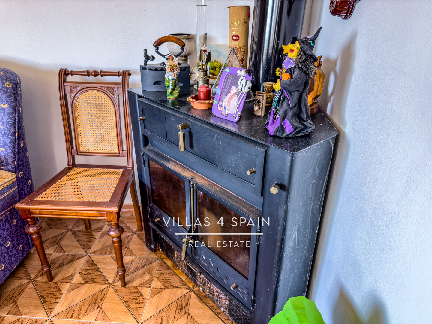 Stig in i ett stort, soligt vinterträdgård, som för närvarande används som matsal, och fungerar som hemmets hjärta. Härifrån ger två säkra dörrar flexibel åtkomst. Den första leder till det huvudsakliga vardagsrummet, där en mysig inbyggd öppen spis skapar en varm atmosfär. Stora skjutbara fönster översvämmar utrymmet med naturligt ljus och inramar spektakulär utsikt över de omgivande bergen. Längre ner i korridoren hittar du ett välutrustat kök med gott om förvaring och bänkyta, intill ett rymligt tvättstuga för extra bekvämlighet. Mittemot köket finns ett modernt badrum med en elegant duschkabin, och i slutet av korridoren erbjuder det generösa sovrummet en fridfull tillflyktsort.